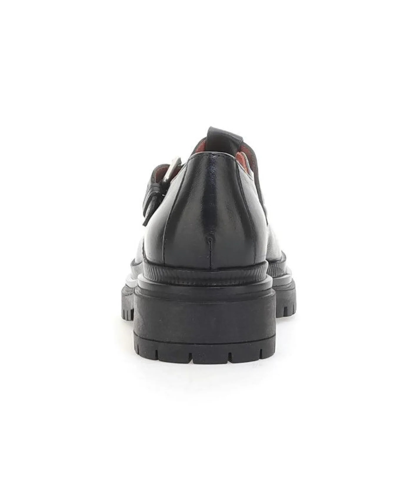 Mjus combat style leather shoe with a chunky lug sole, 4.5cm heel and top strap with buckle.
