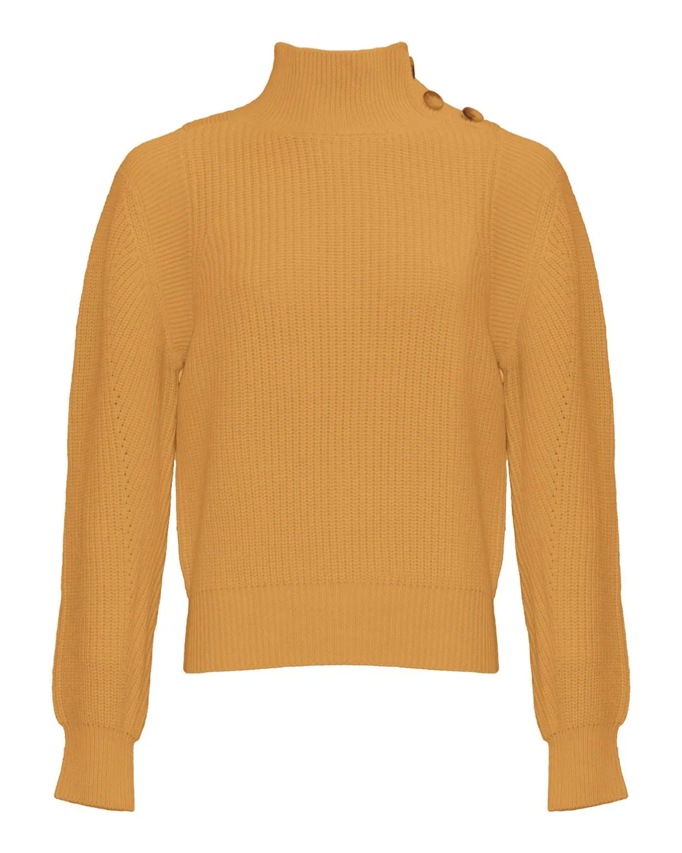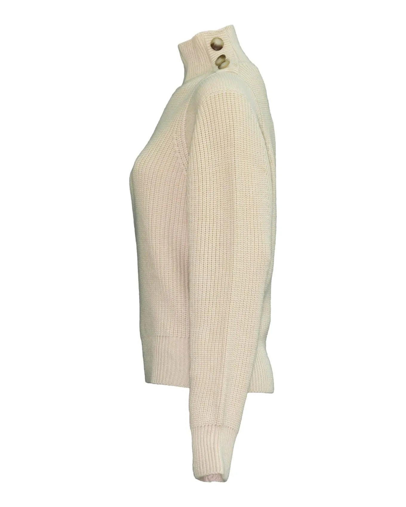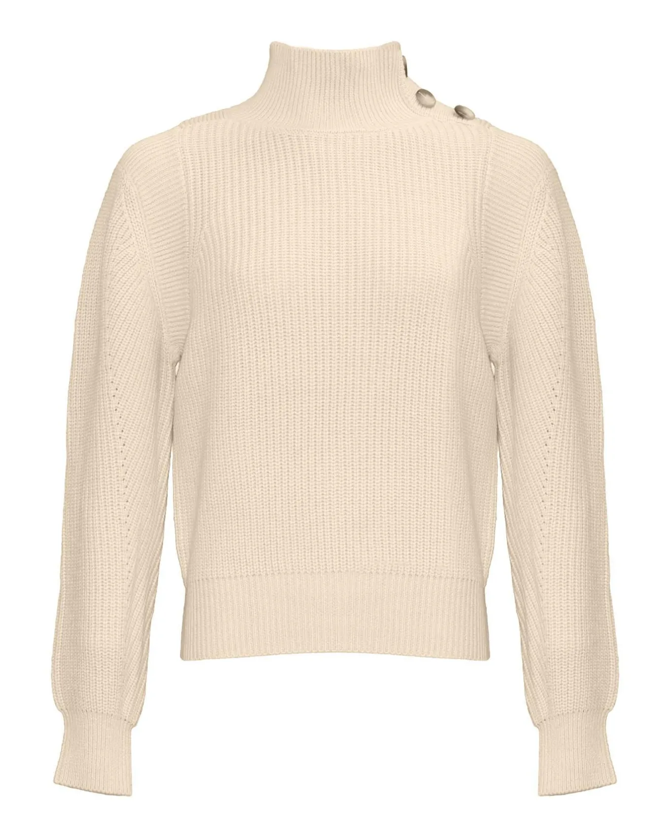 Long sleeve high neck knit pullover with decorative button placket from neck to shoulder