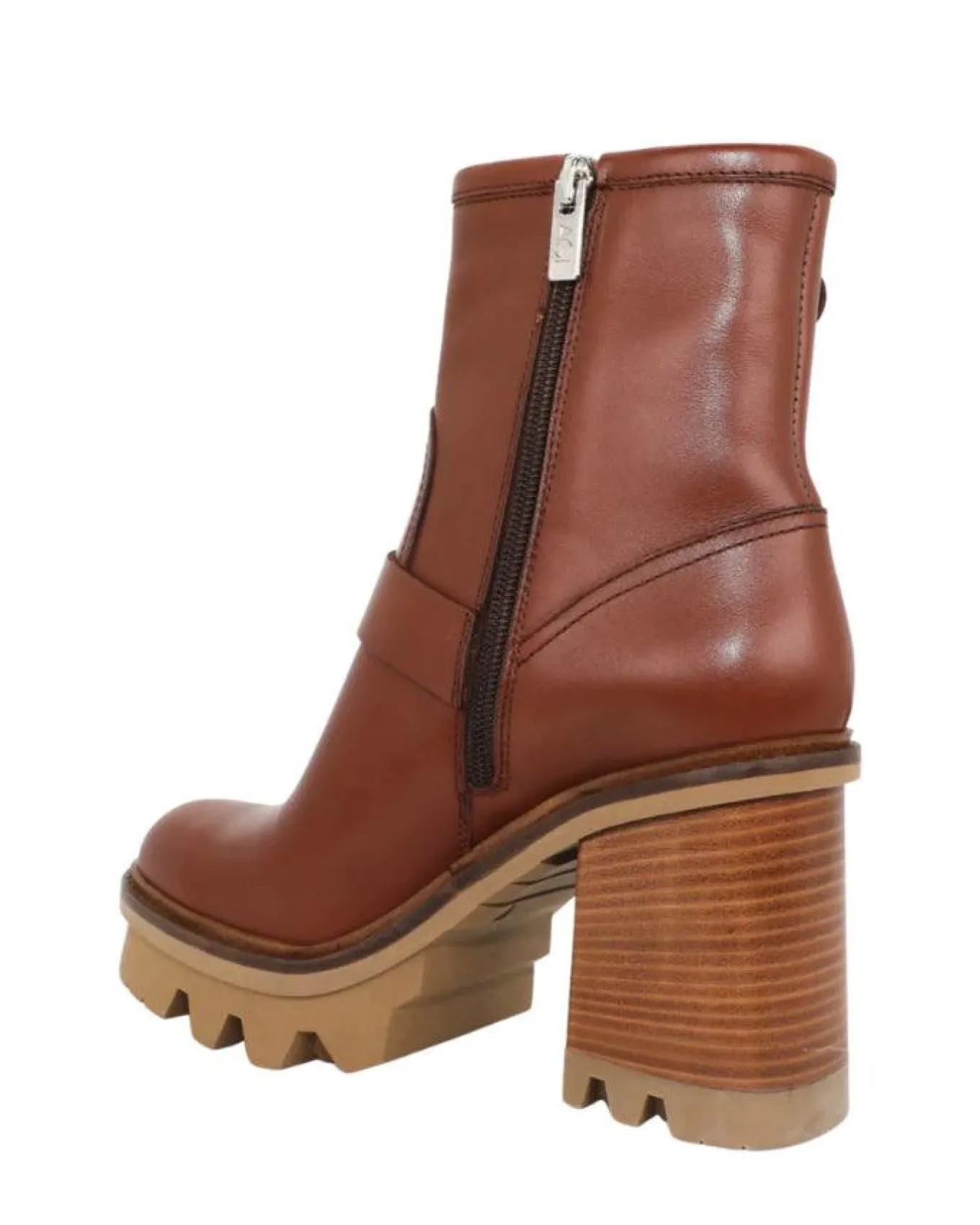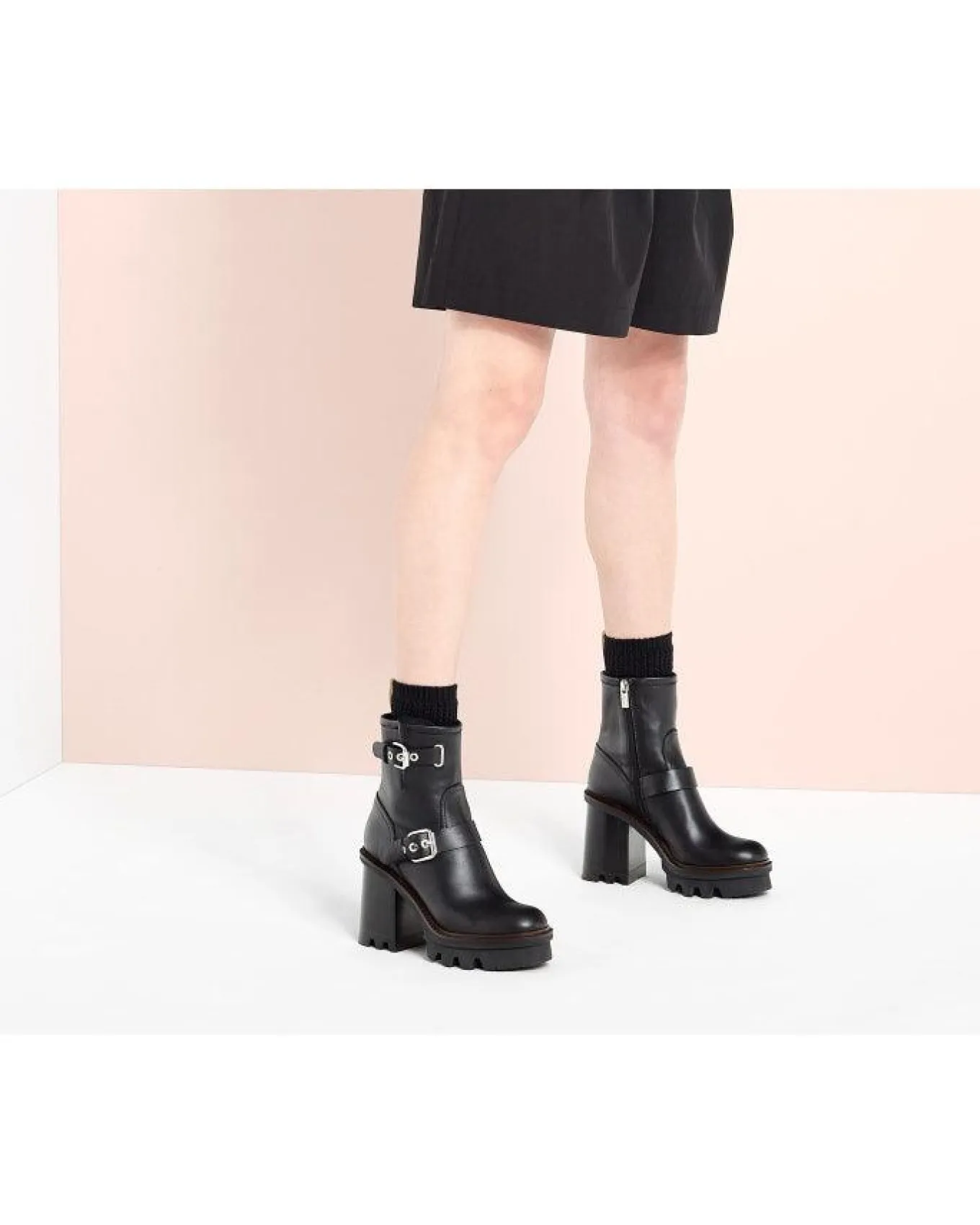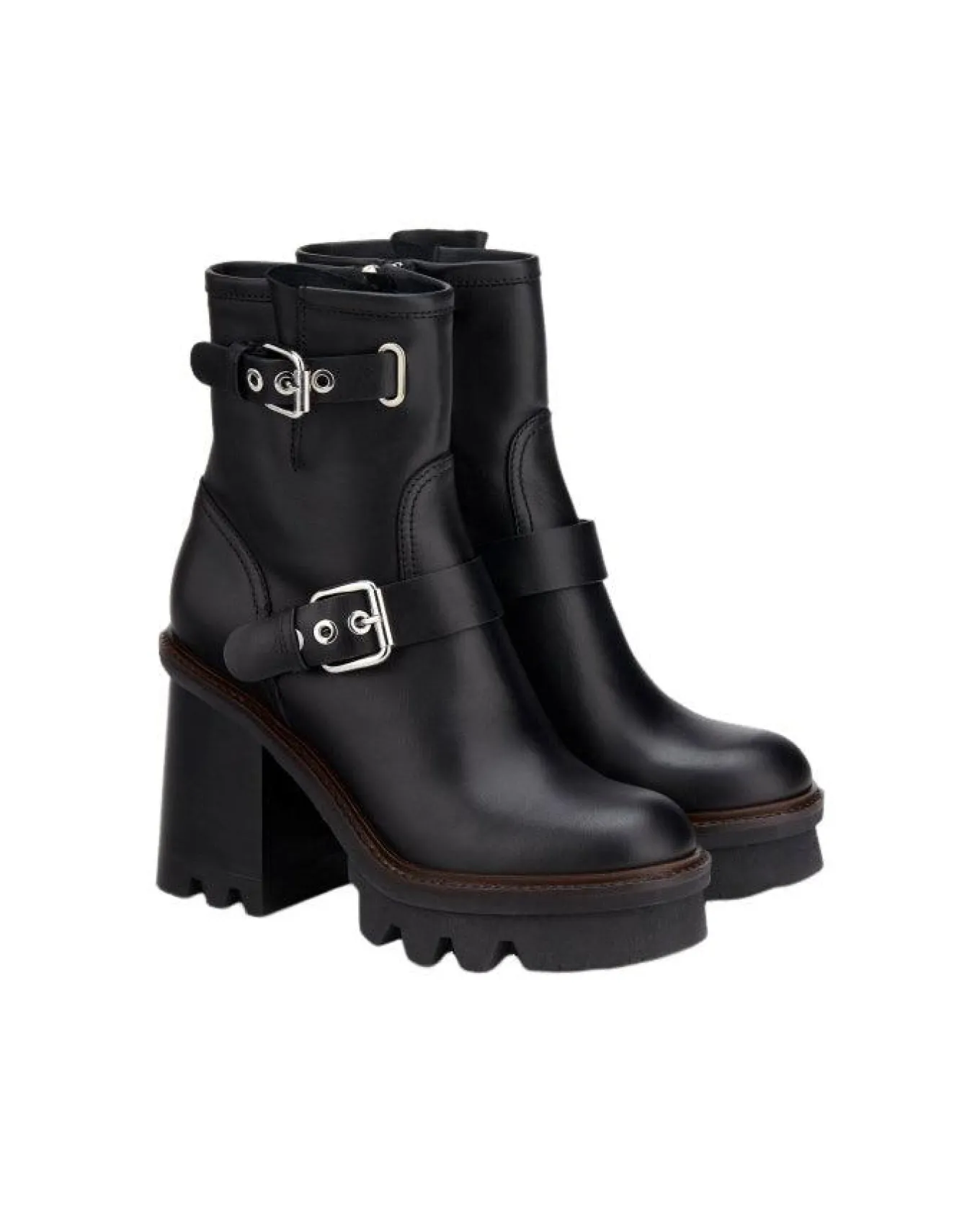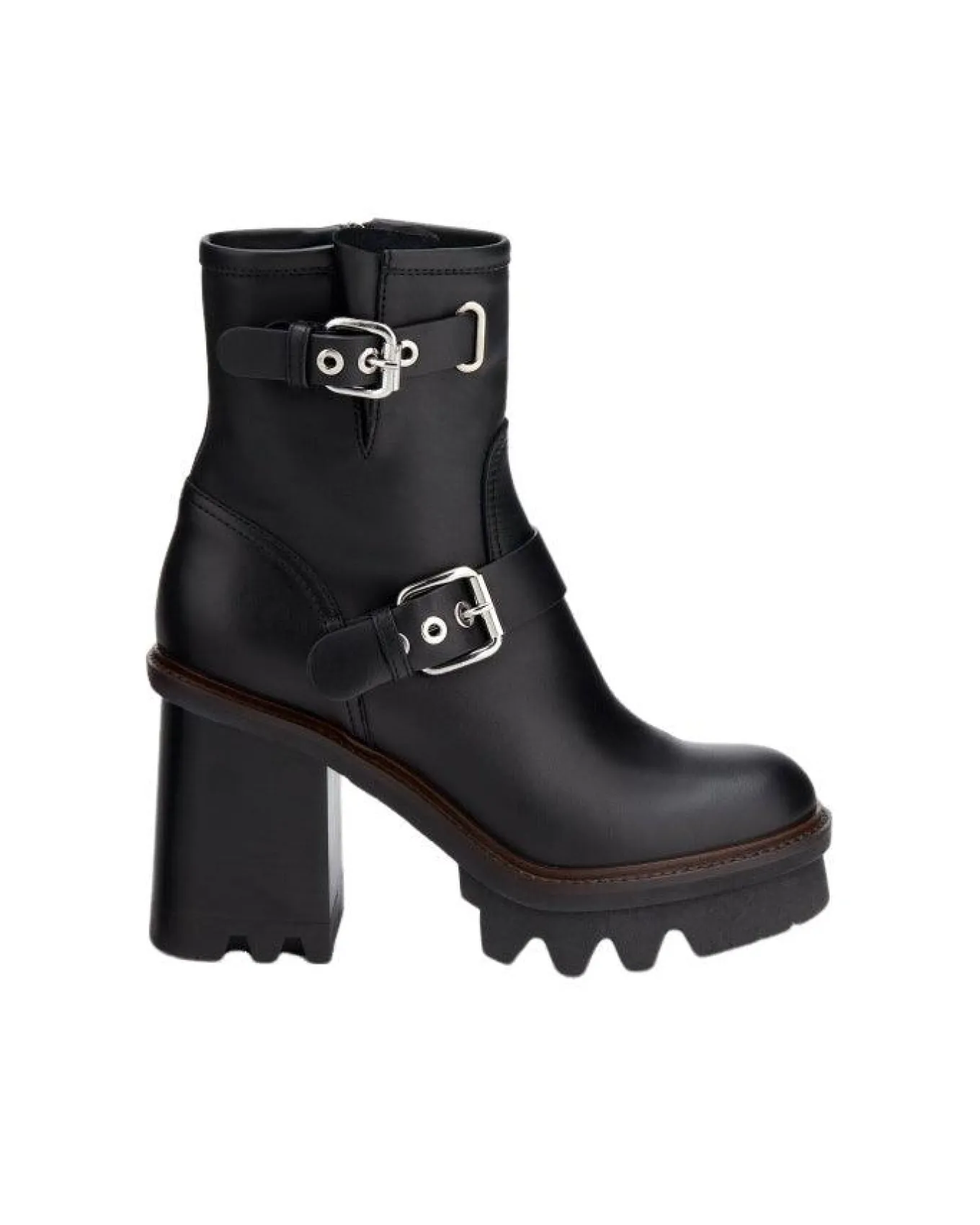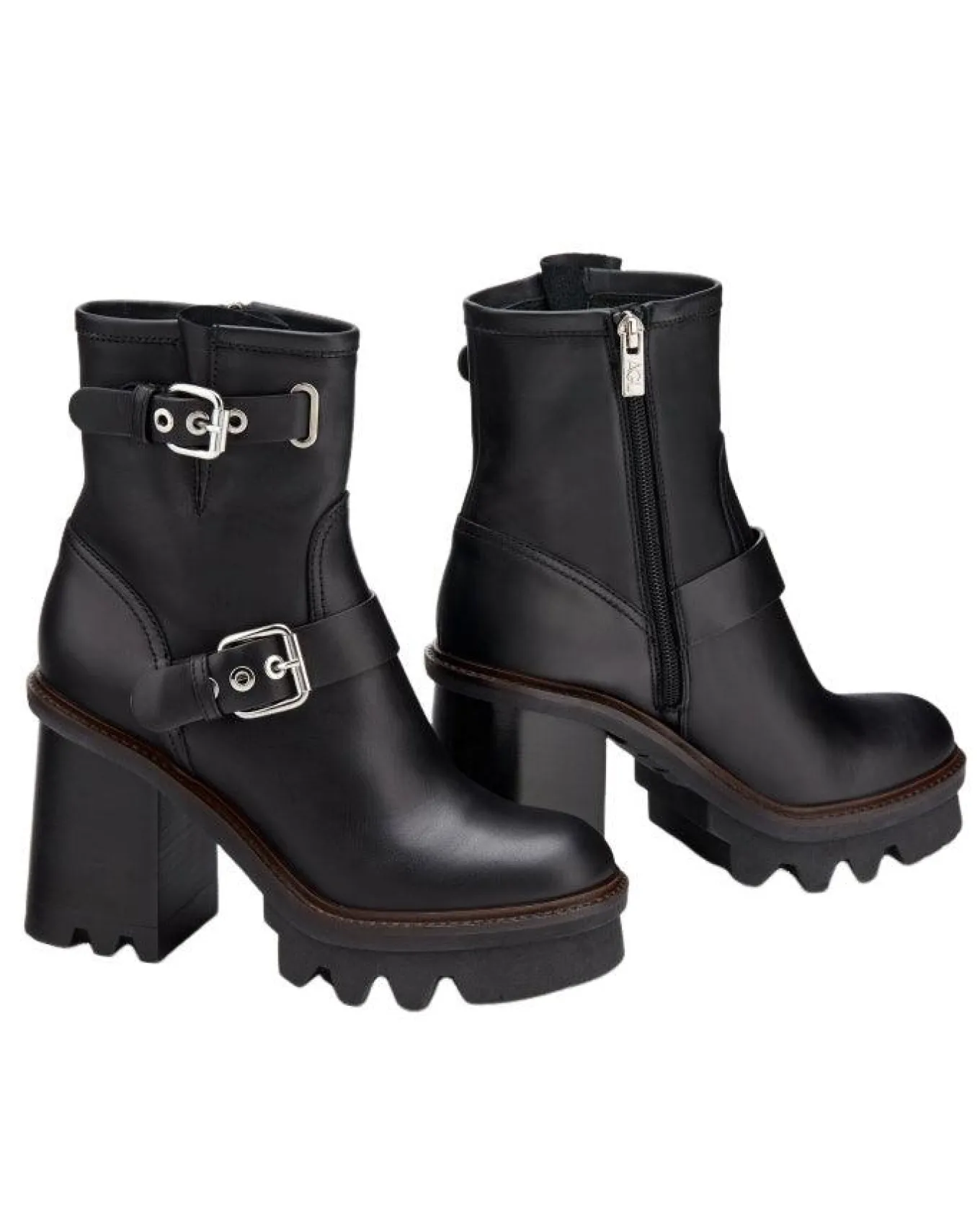 Leather biker style two buckle straps platform ankle boot with gritty lug sole and side zip