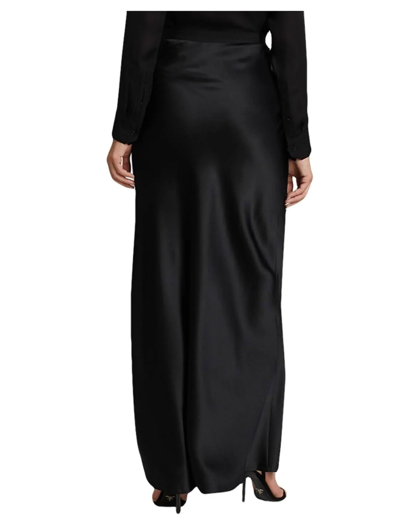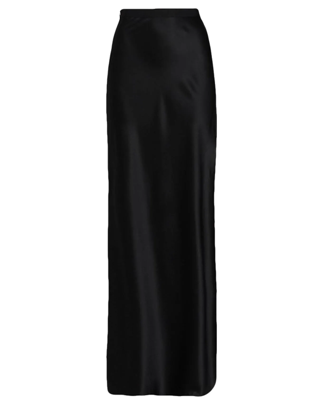 Straight silhouette full length silk skirt flowing from a banded waist with a long high side slit and side zip closure, Size 4 – 46″ length