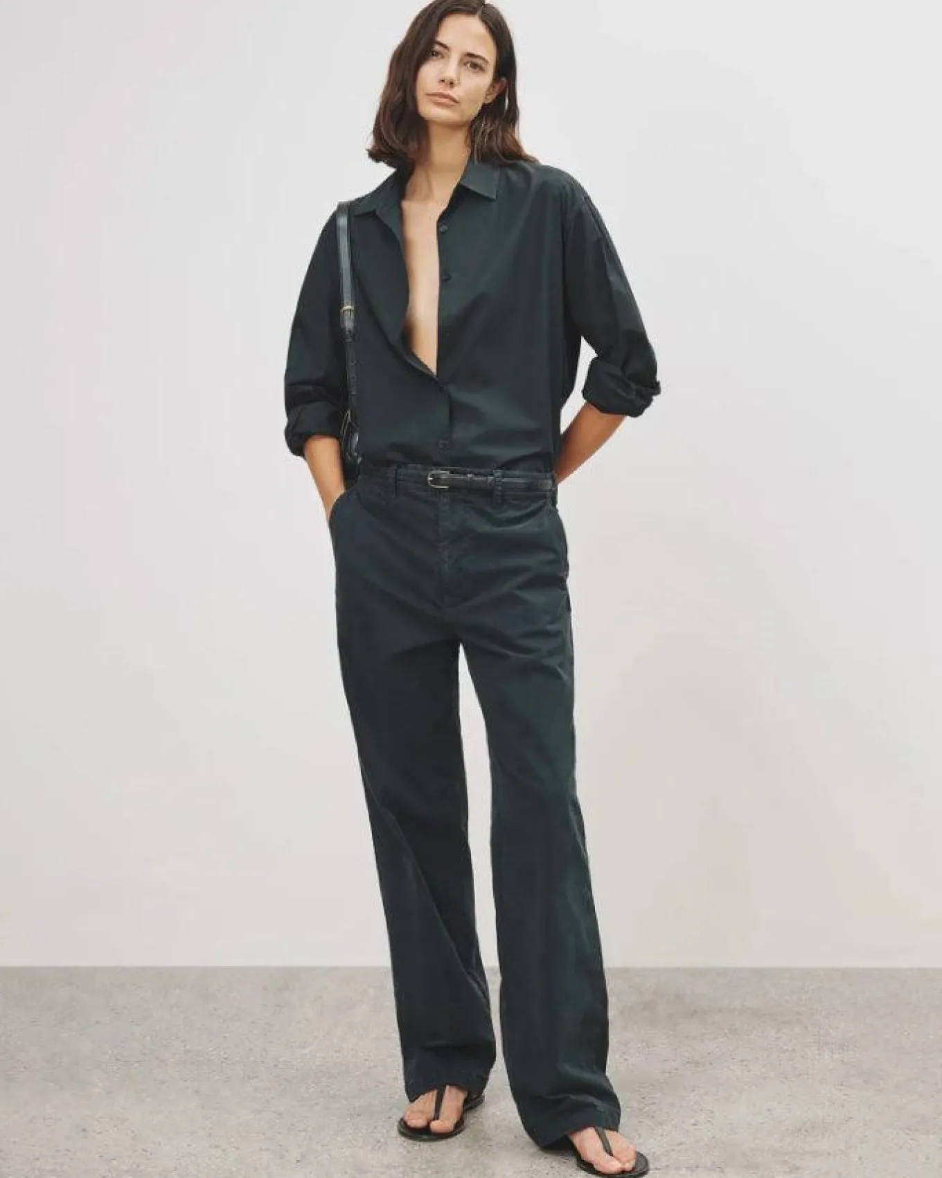 Nili Lotan elevated classic cotton button down shirt is rendered in a crisp poplin. A modern and clean silhouette without top-stitching, and an oversized fit that is slightly longer in the back.