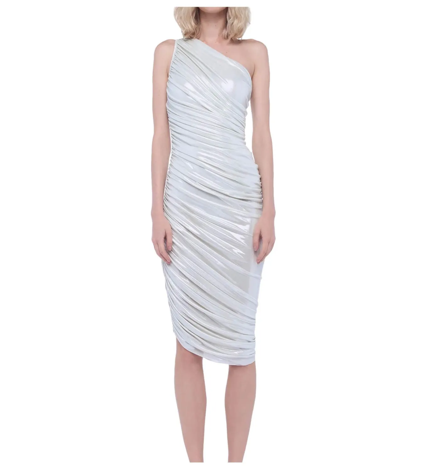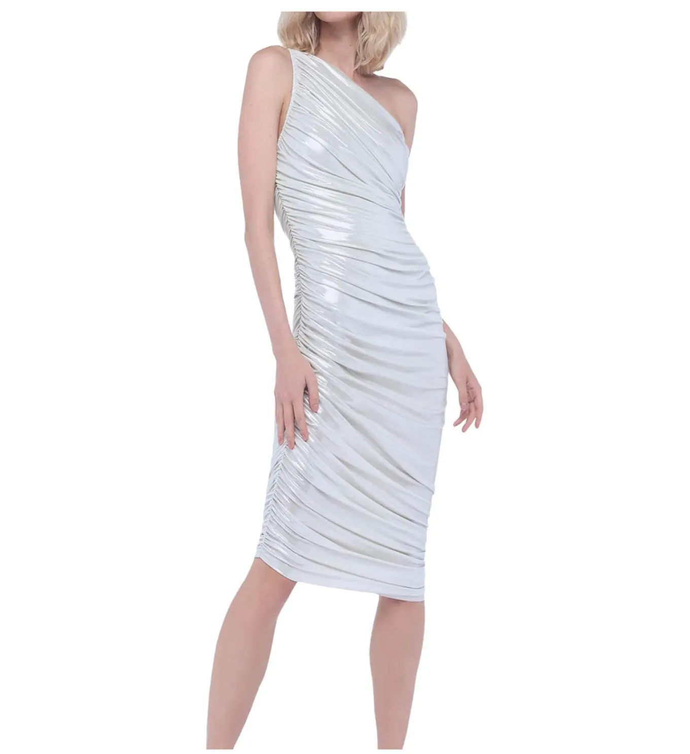 Stand out in this shiny pearl fitted and comfortable 4-way stretch poly lycra sleeveless one shoulder draped knee length dress with shirred sides and asymmetrical hem