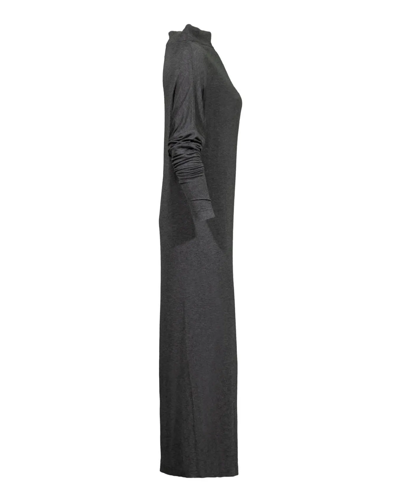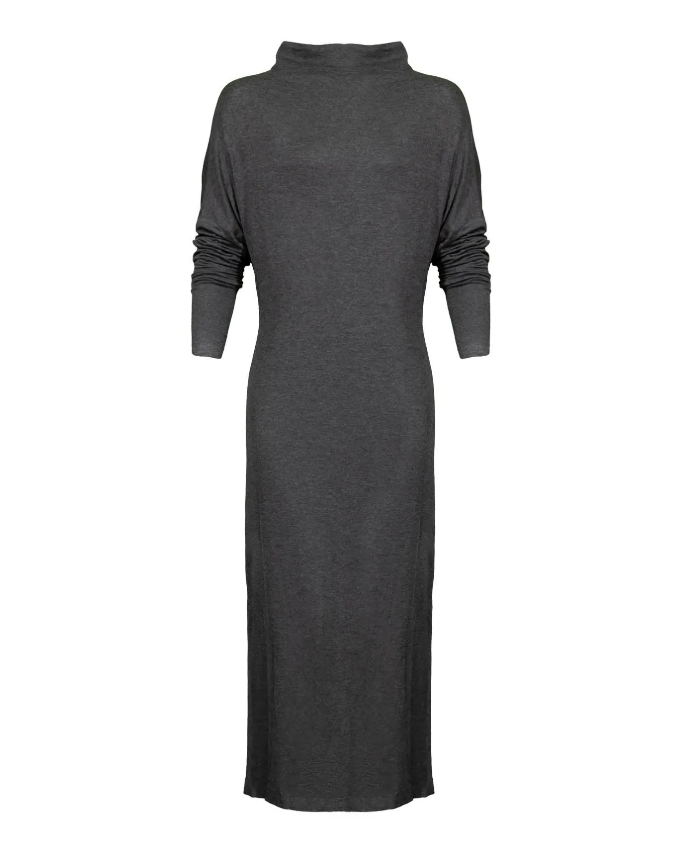 Pullover midcalf length dress features a convertible neckline for variety in wear designs. The wide neckline allows the piece to be worn as a strapless dress or relaxed skirt. The long dolman sleeves can be converted to a sash, shoulder straps, or self-belt