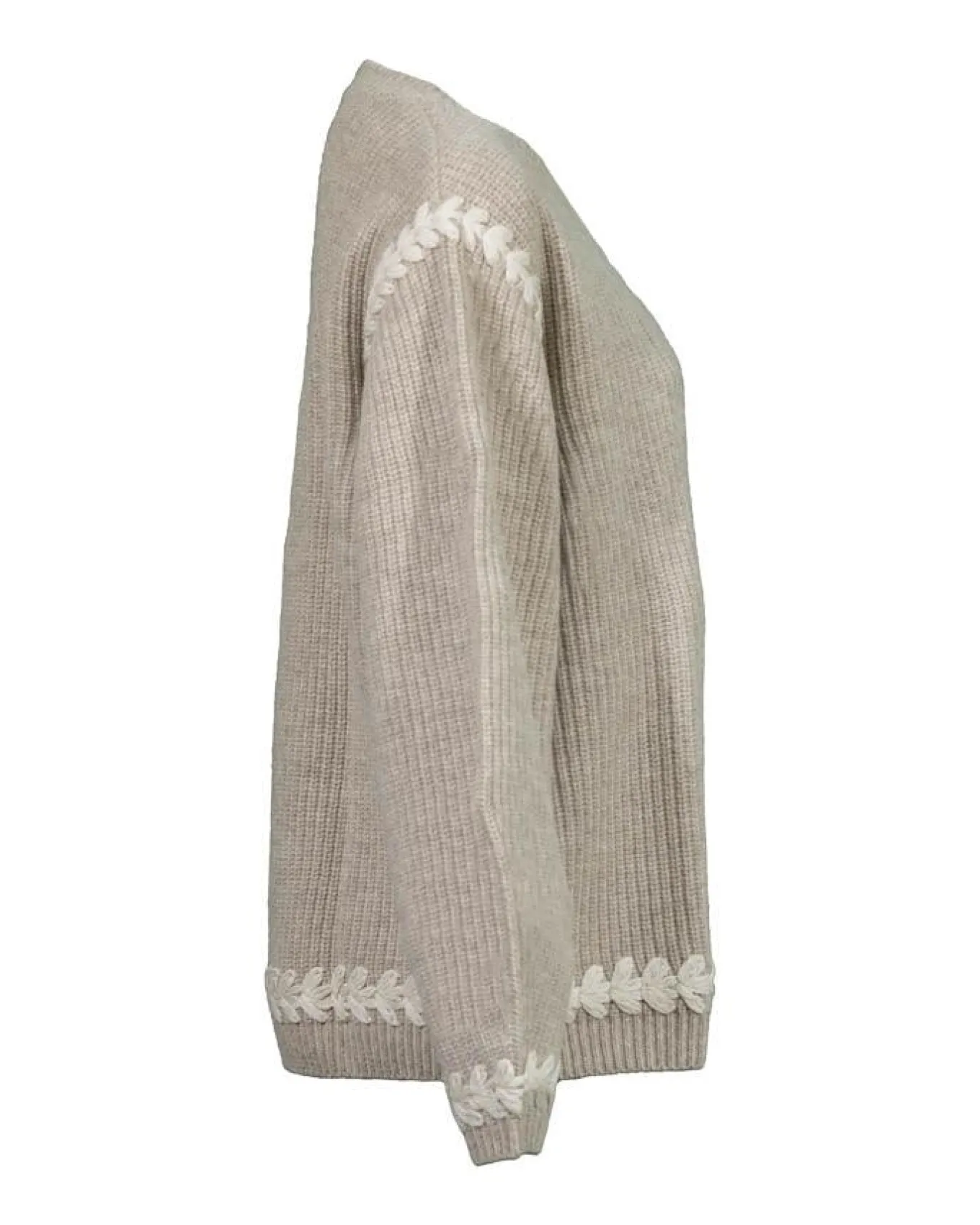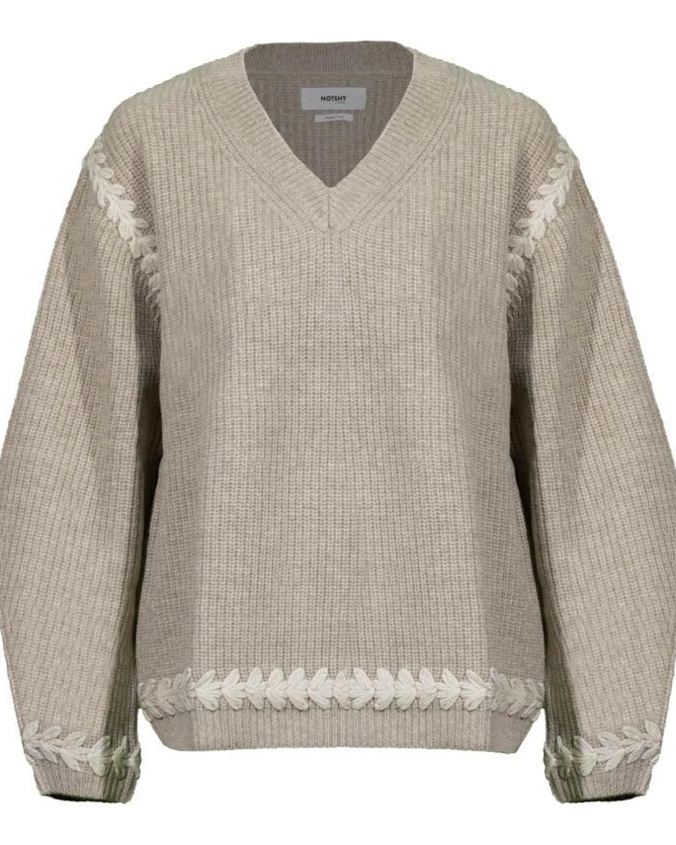 Notshy Cashmere straight cut wool ribbed knit sweater with v-neck and contrast embroidery at shoulders, long sleeve cuffs and hem, ribbed trim, relaxed fit.