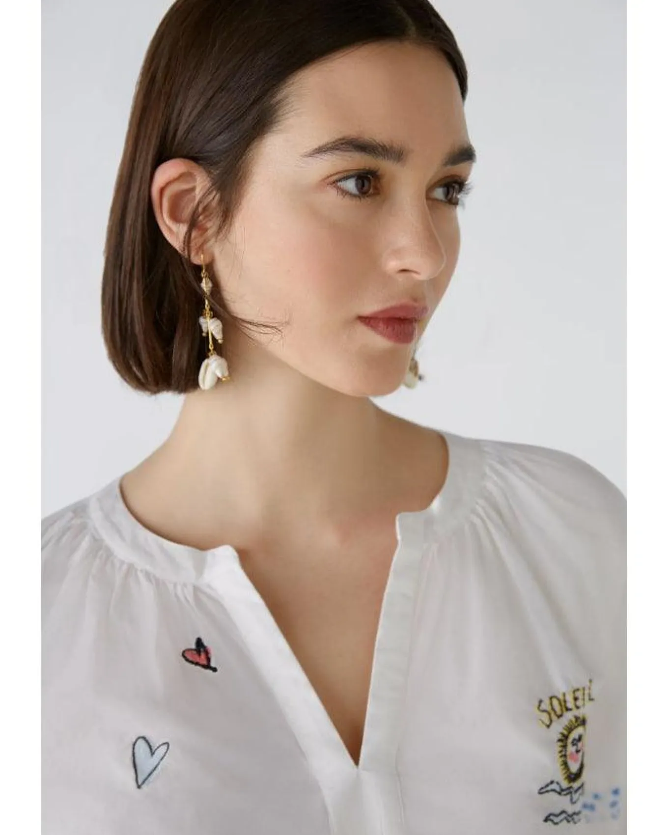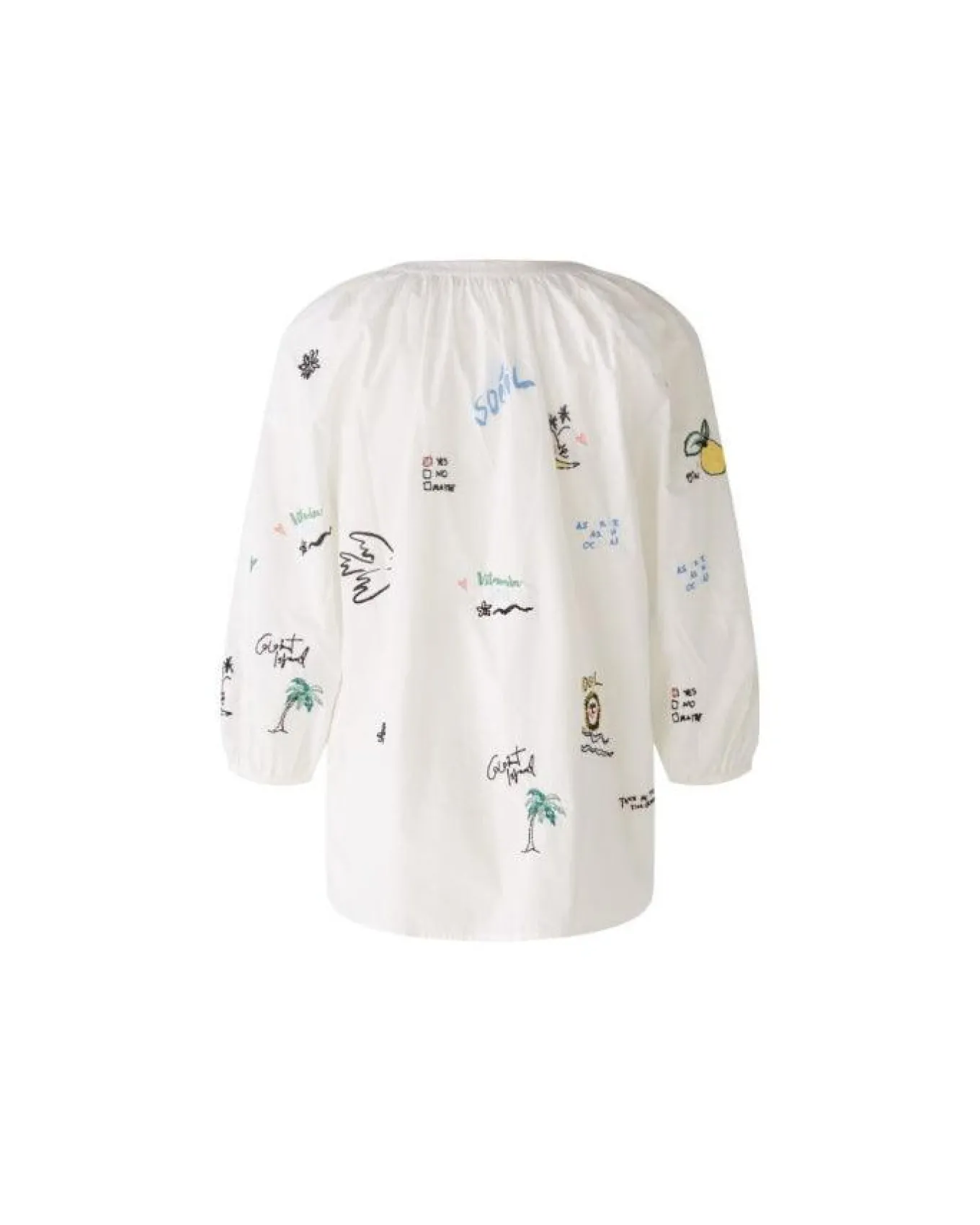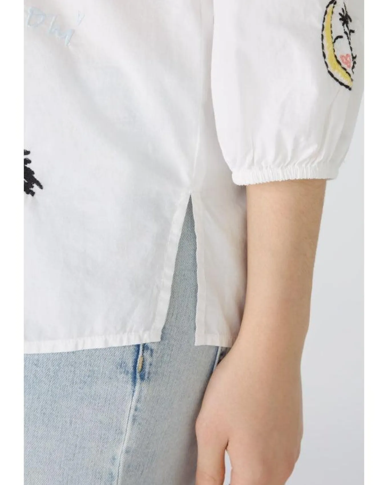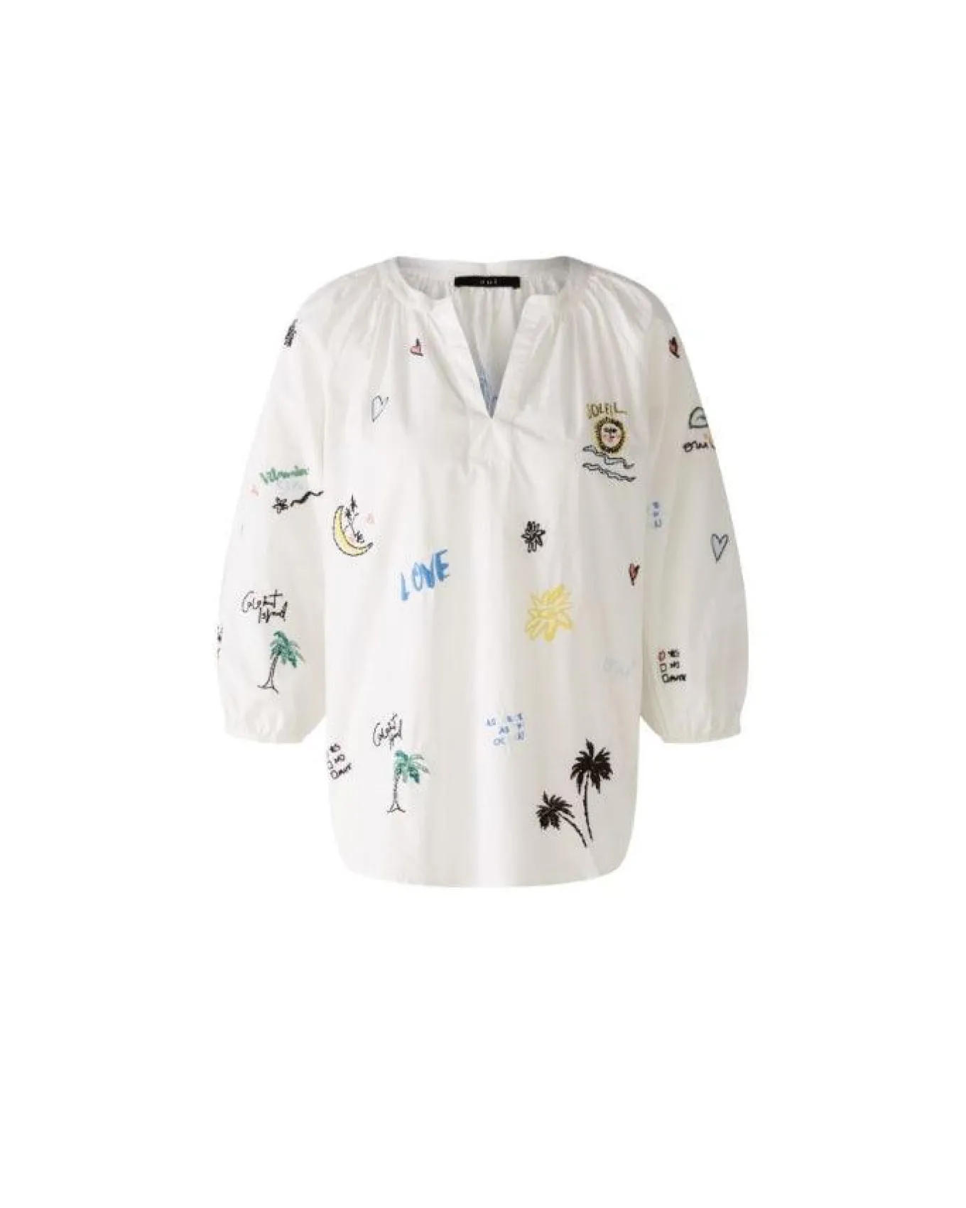 Oui playful casual cut embroidered blouse with 3/4 raglan sleeves and split v-neckline, Length 70cm.