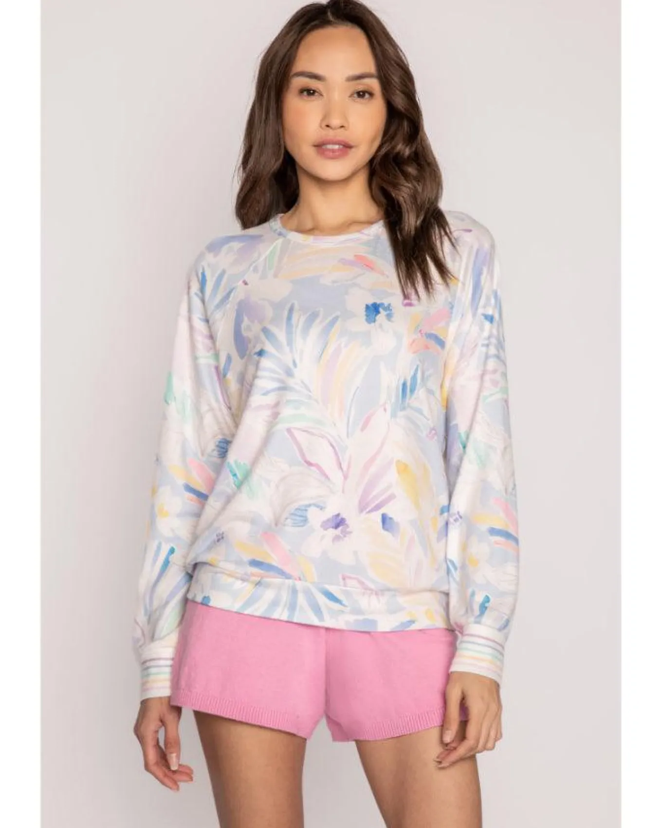 Super soft brushed knit jersey long sleeve crew neck PJ top in an artistic pastel print finished with pastel striped rib cuffs