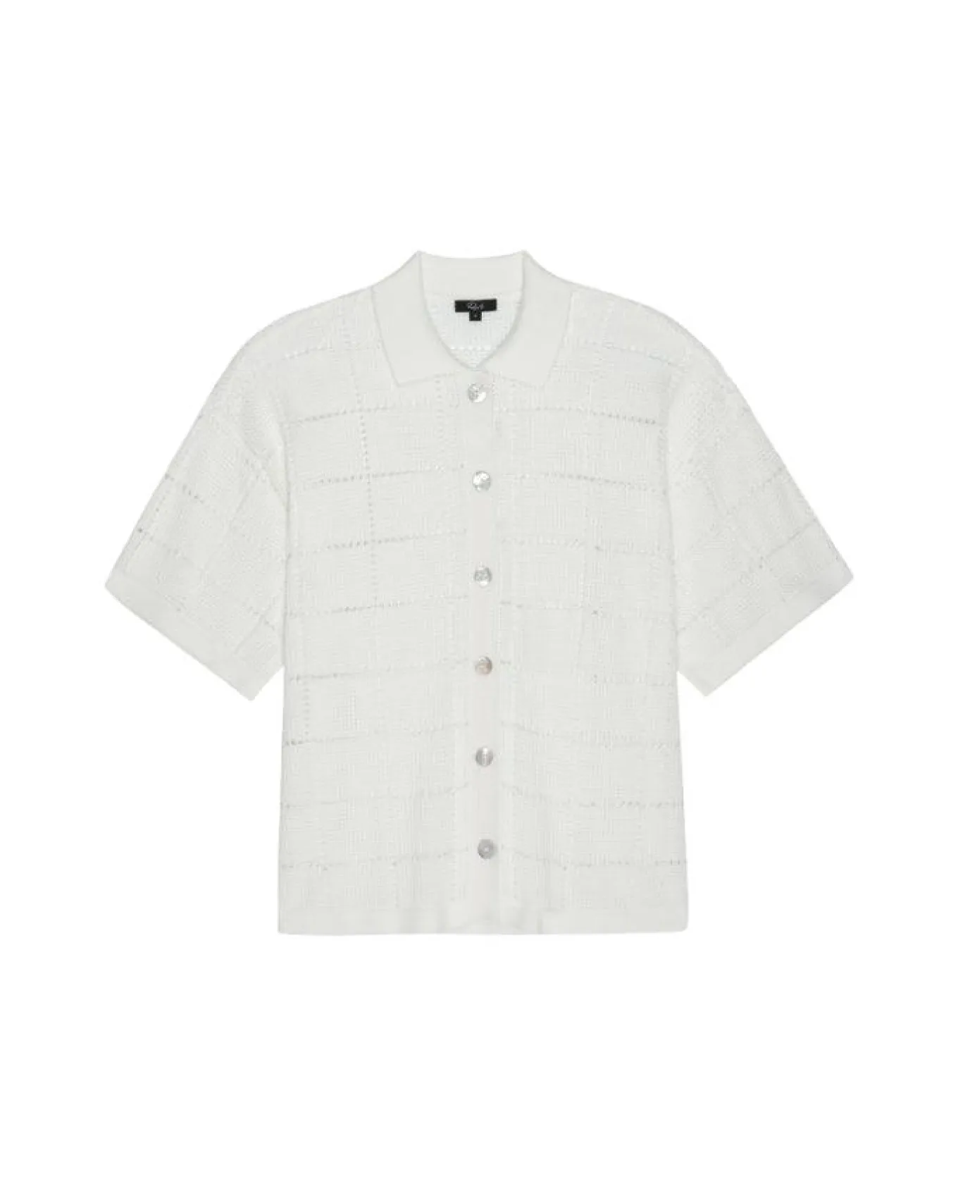Rails boxy fit, super soft organic cotton blend top in an open-stitch grid design with button down front, classic collar and short sleeves. Size S – Length 24″.