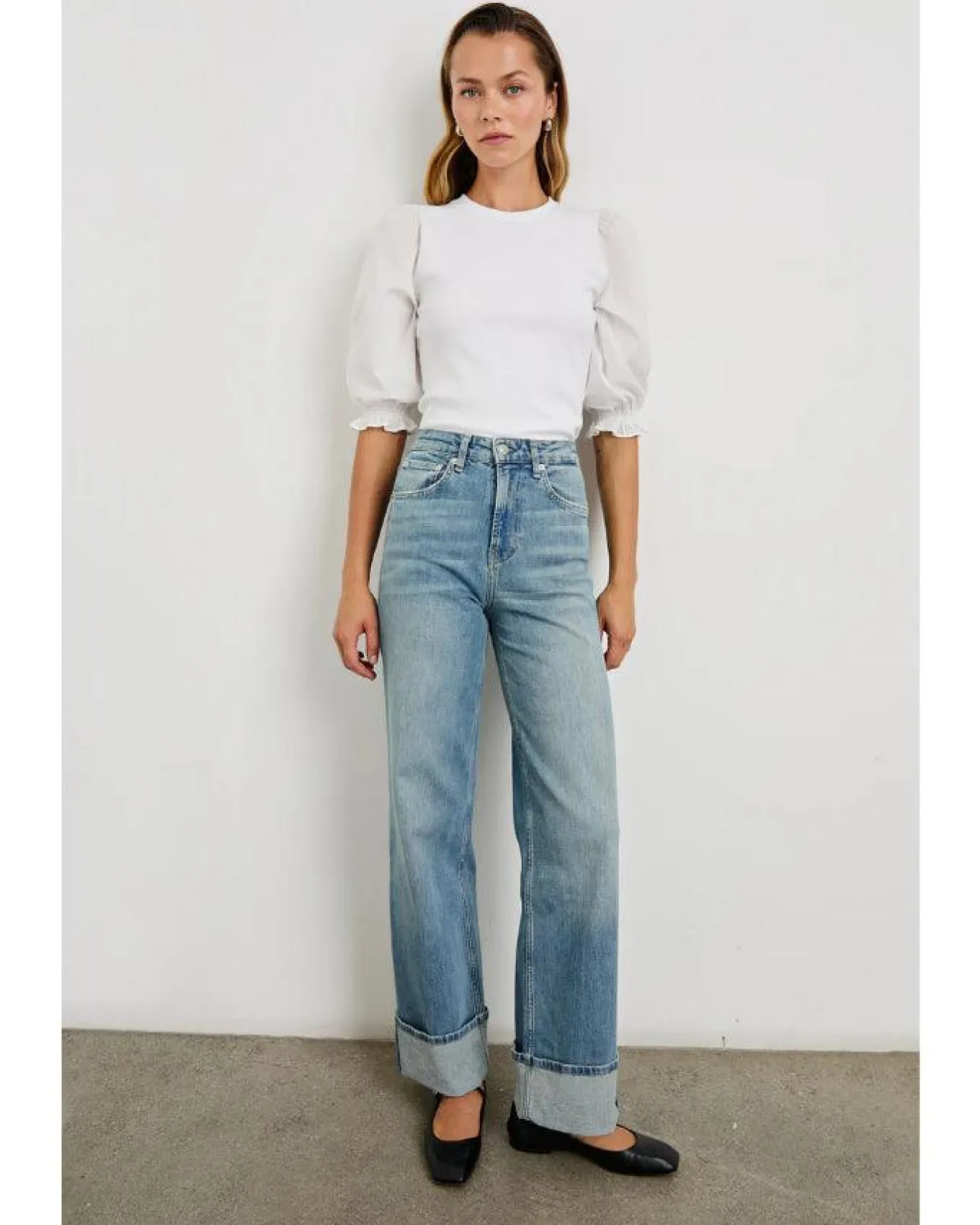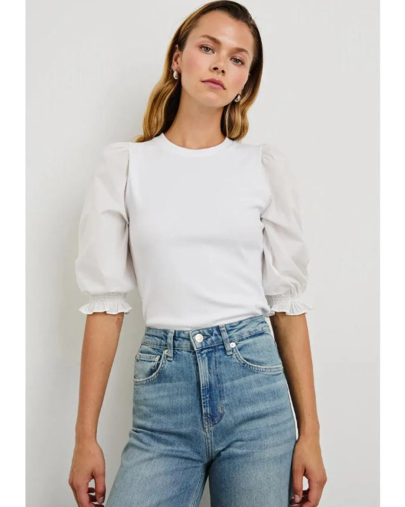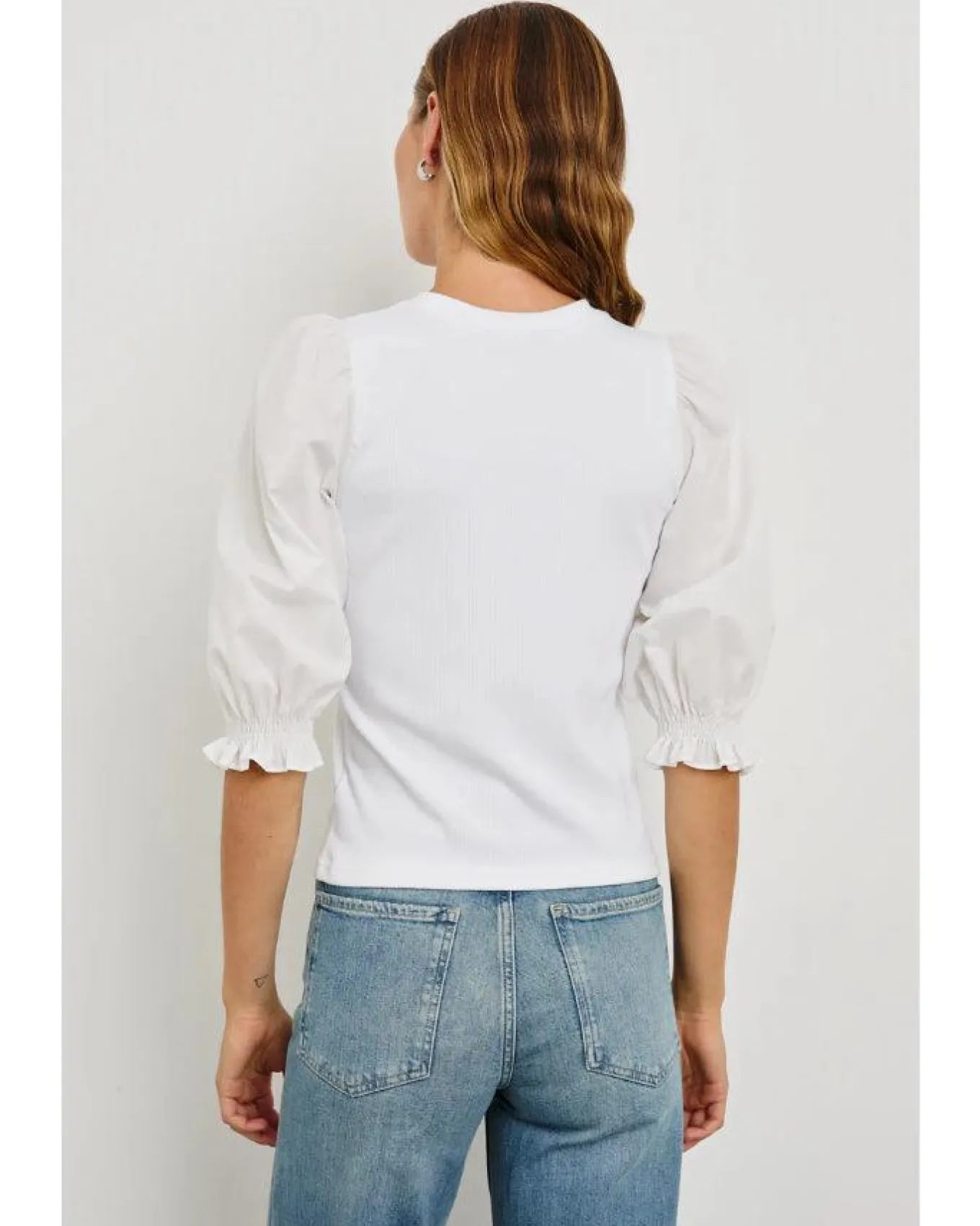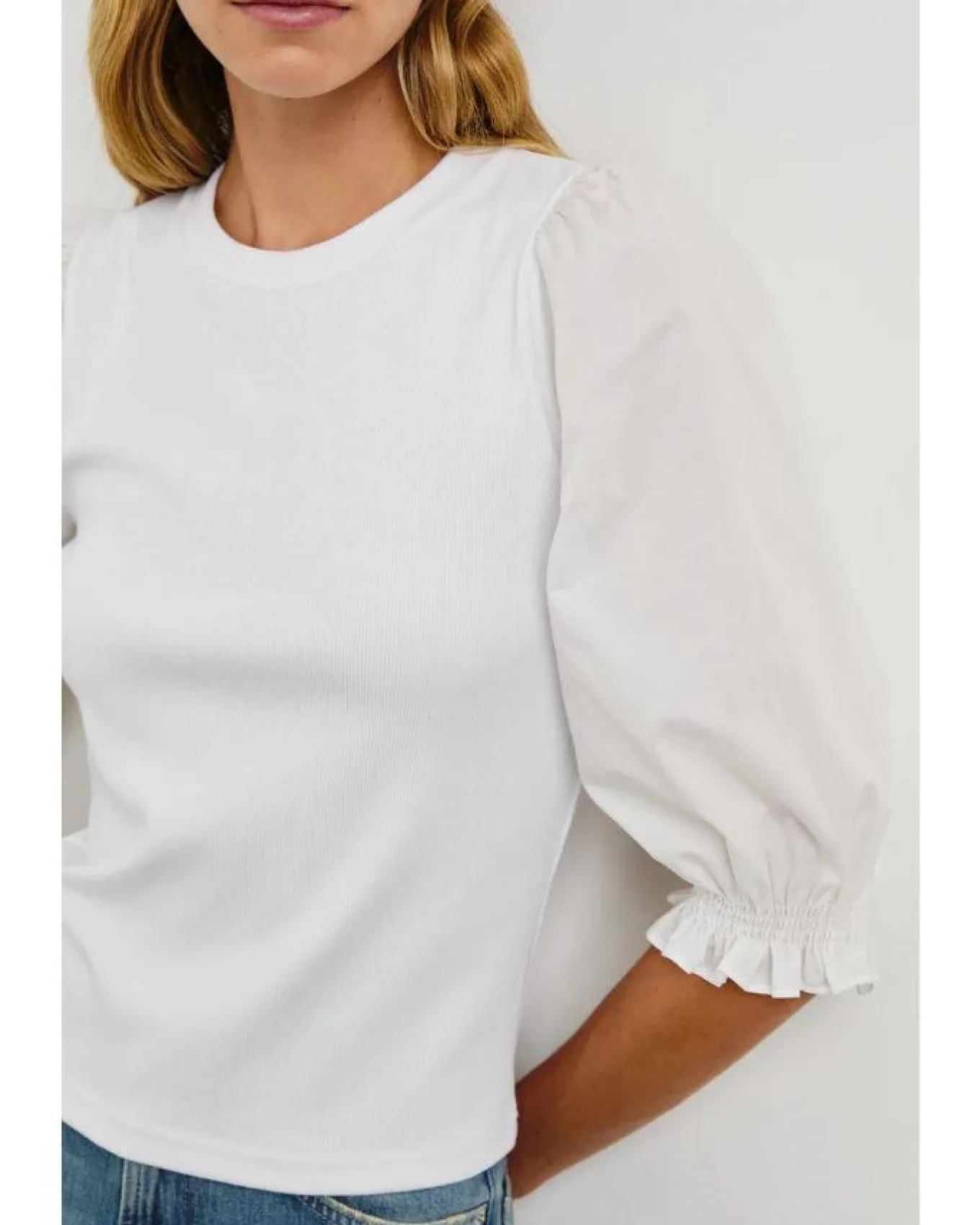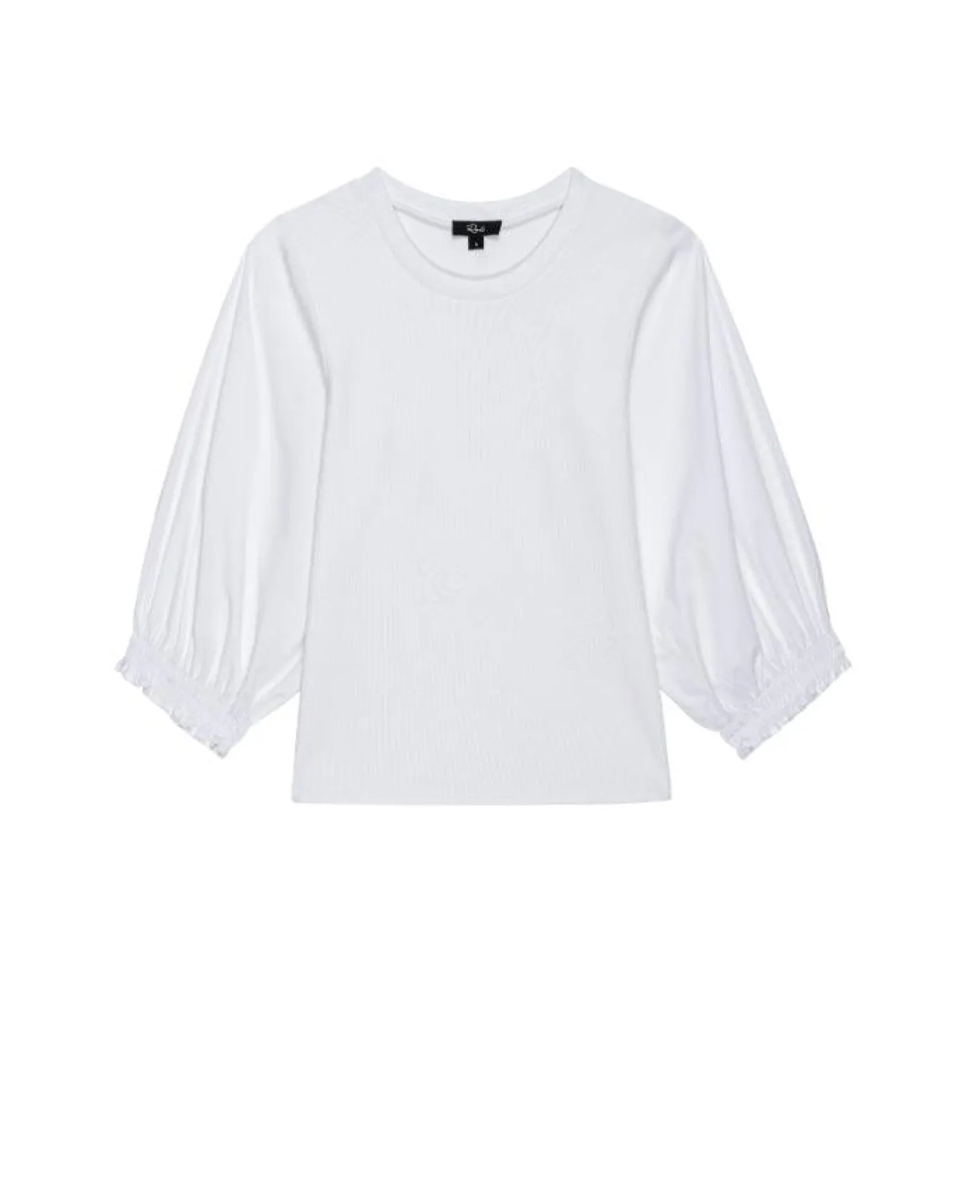 Rails heavier weight ribbed cotton blend top with a classic crew neckline and elbow length balloon sleeves cinched with ruching at the cuffs, Size S – Length 21 1/2″.