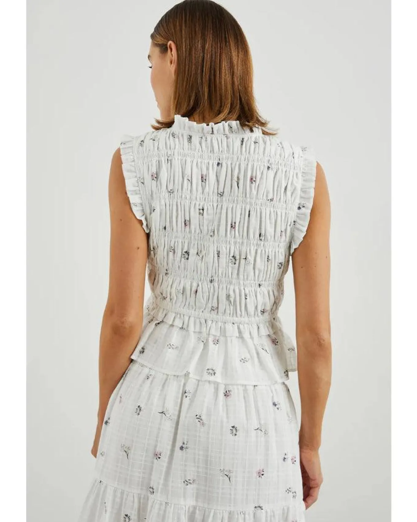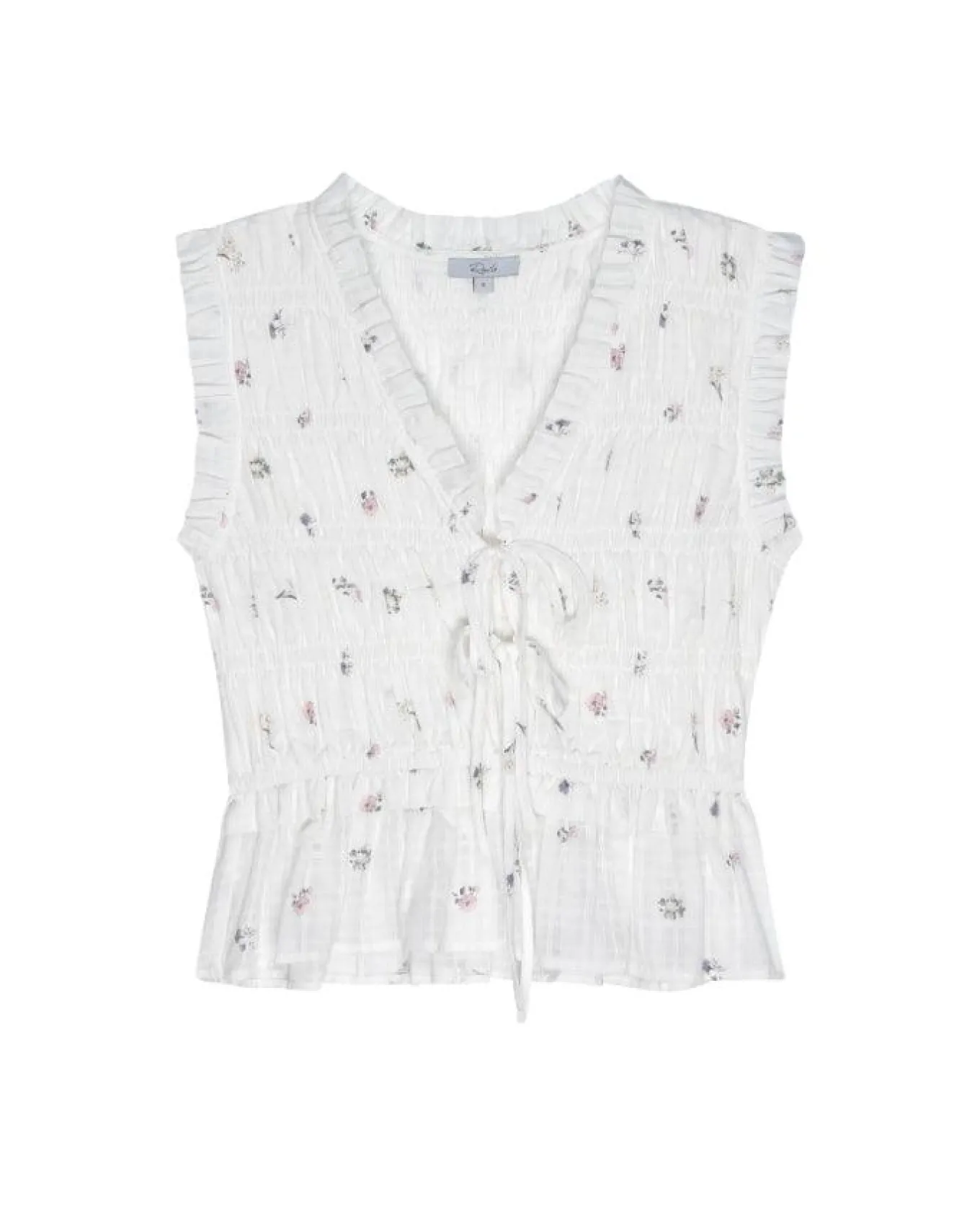 Rails lightly textured cotton sleeveless top adorned with dainty bouquets, feminine details with smocking, ruffled edges and front-ties for a customizable fit. Size S – Length 19 3/4″.