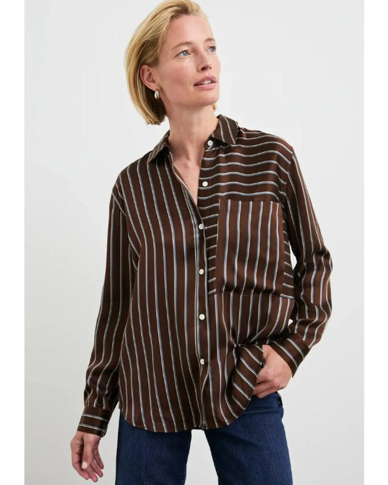Rails relaxed fit luxe super smooth silk charmeuse button down shirt with vertical stripes, oversized patch pocket at chest and longer length, Size S – Length: 27″.