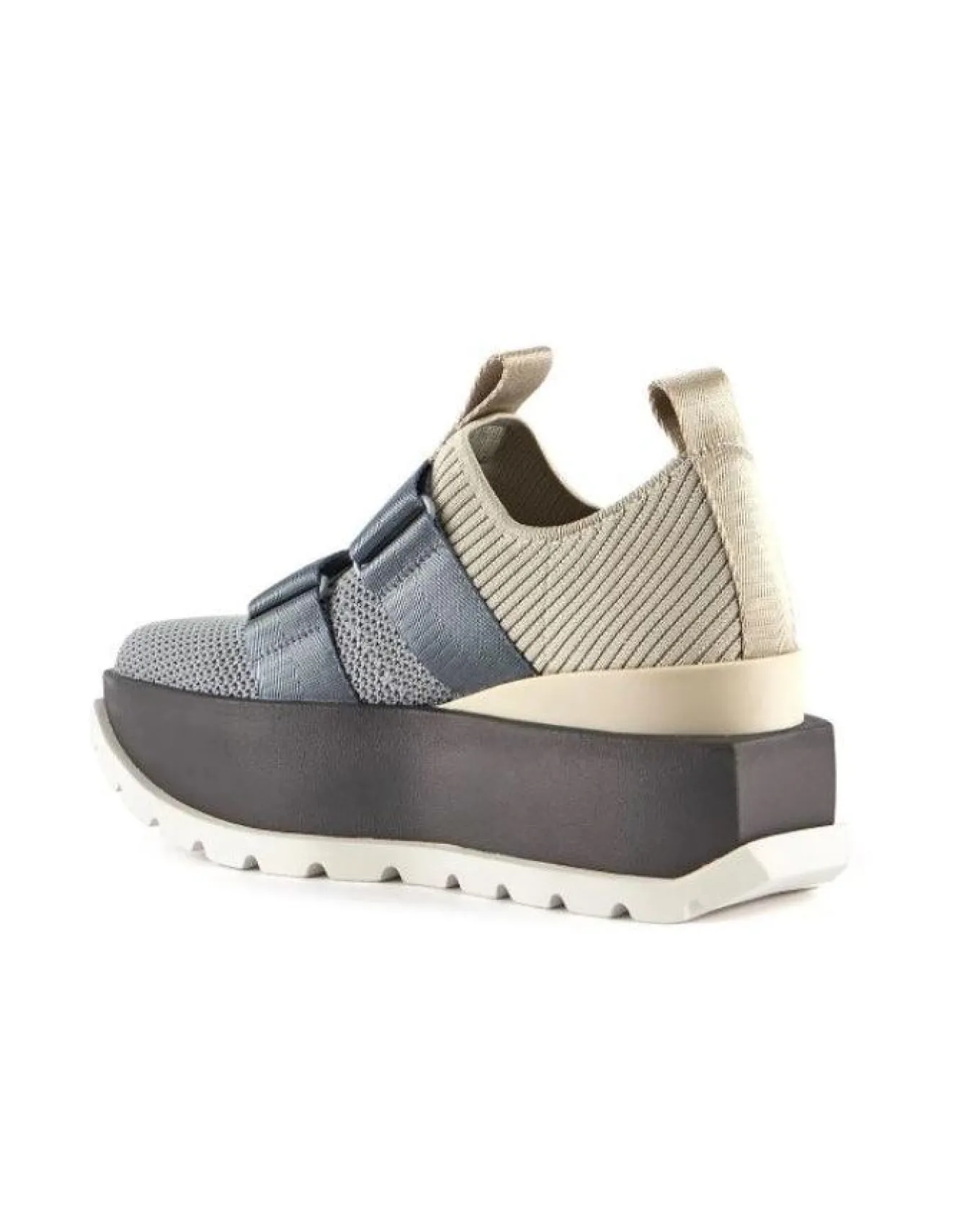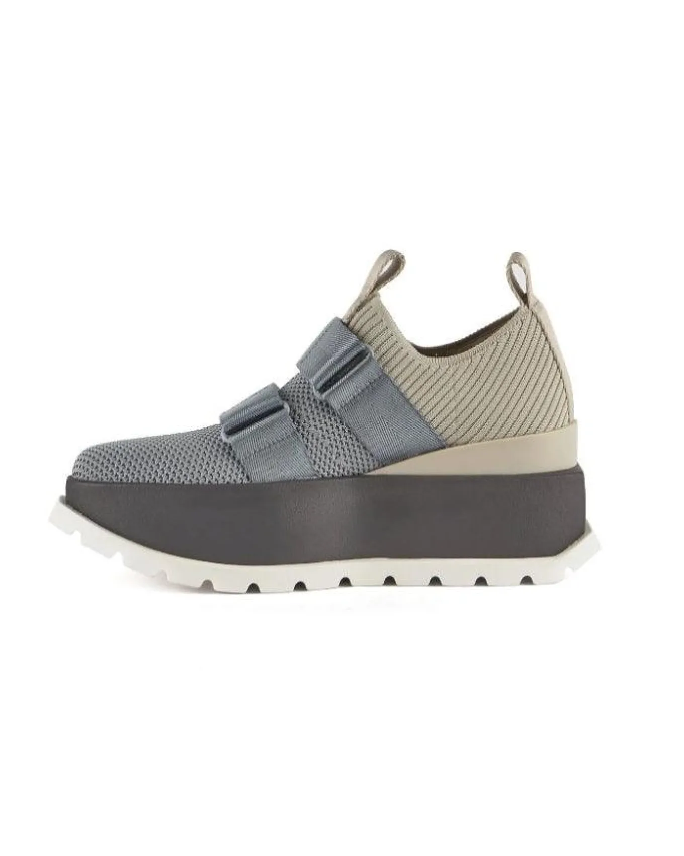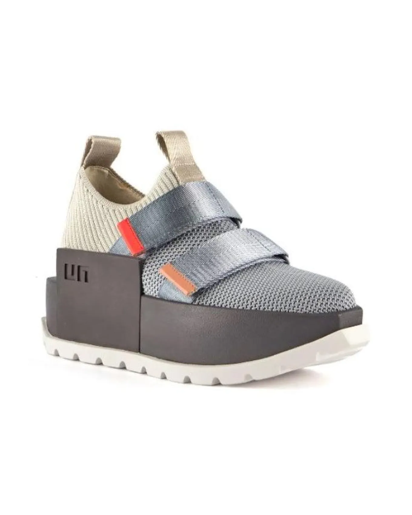 United Nude wedge platform sneaker lifted by a bold cleated outsole. The geometric silhouette features UN’s signature aesthetics, a knit fabric upper, adjustable velcro straps, signature pull-ups, and a defining block logo, rubber outsole, Heel Height 2.4″