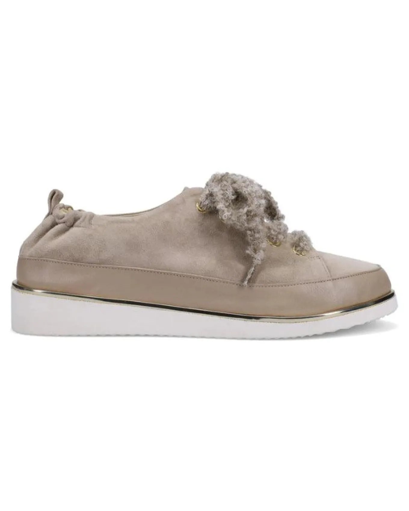 Ron White Nalla lace up shoe in cashmere suede with nappa and mirror welt, seamless sacchetto construction, teddy bear laces, kid leather lined, poron midsole, ultralight rubber wedge sole and weatherproof, 1 1/2″ heel with 1″ platform.