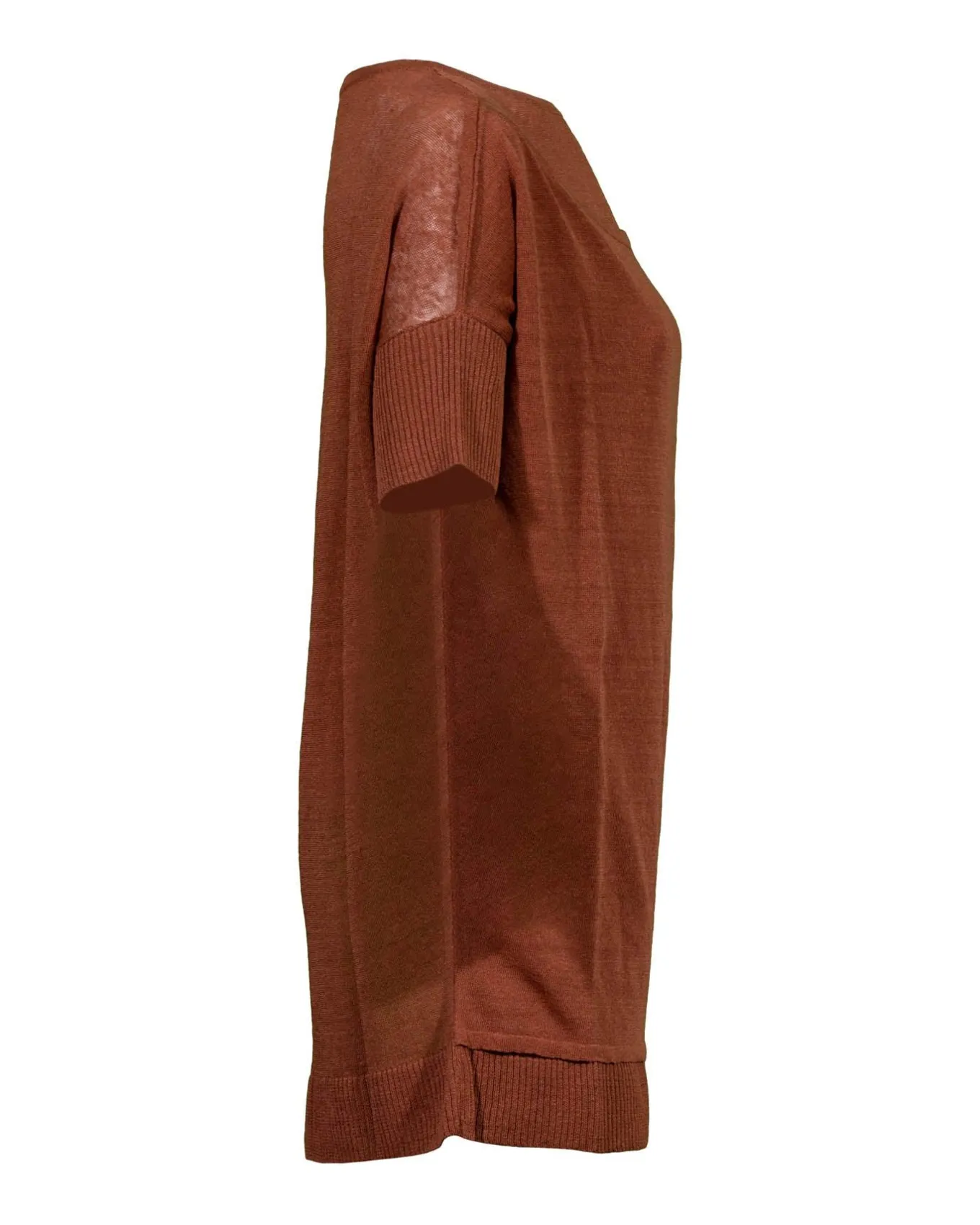 Casual fit boatneck linen tunic features a layered front panel, drop shoulders, ribbed short sleeve cuffs and hem