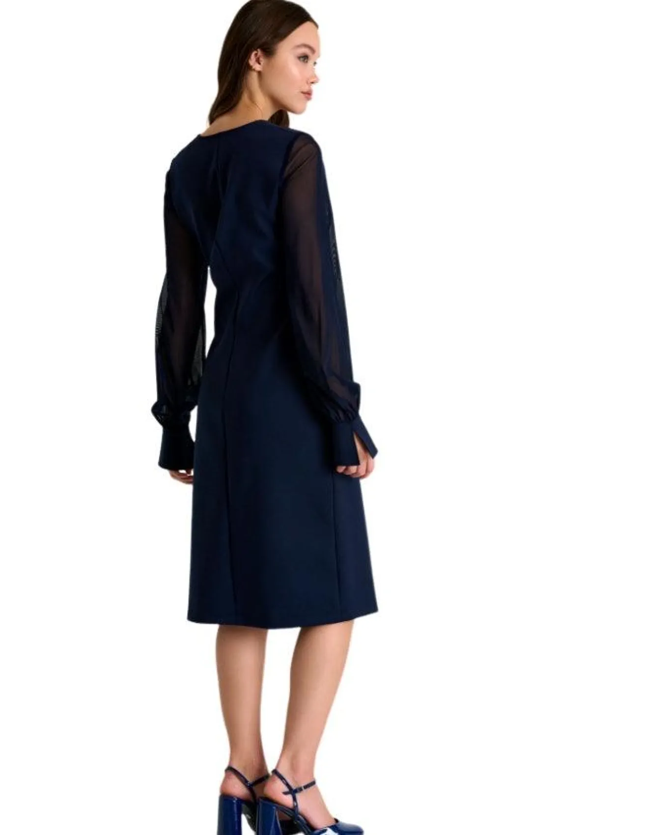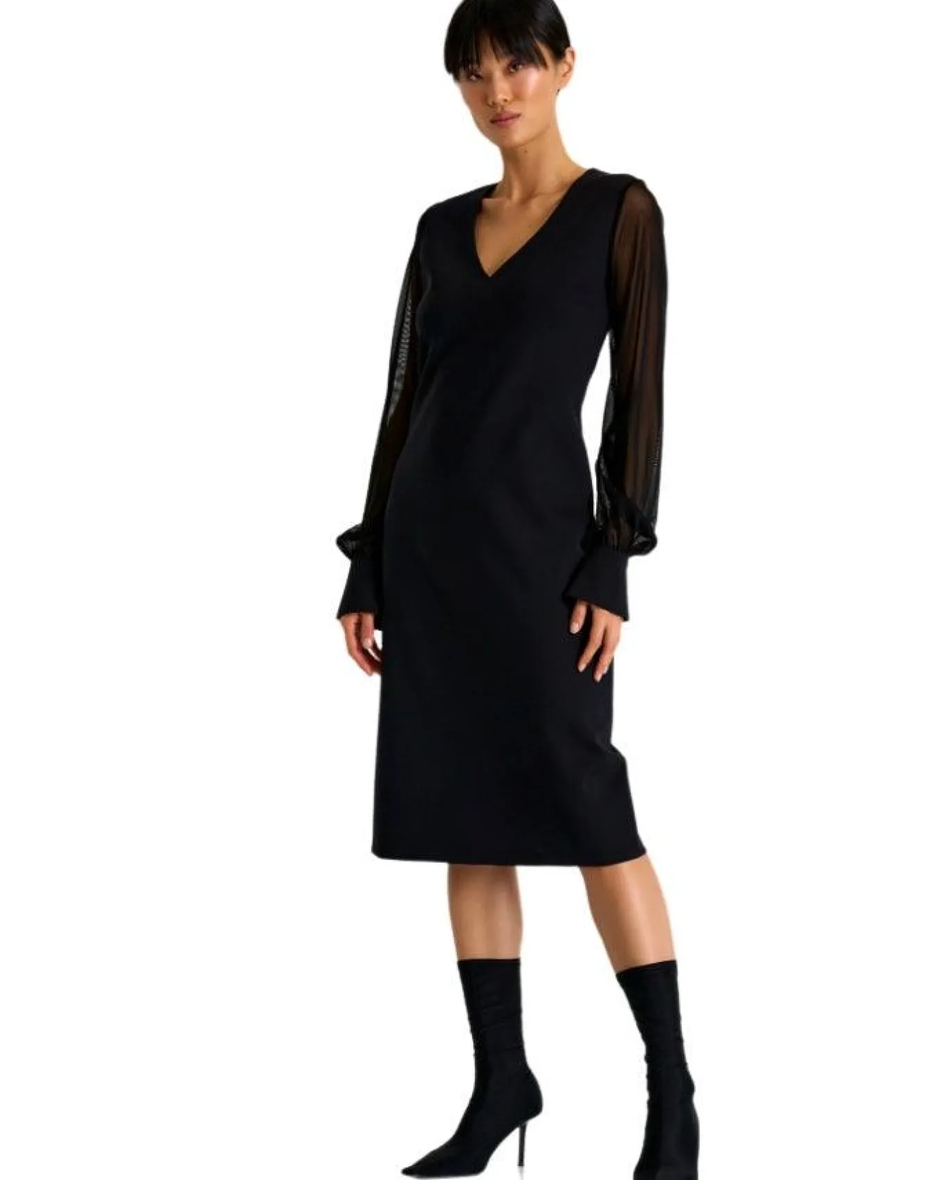 Shan Elegant, feminine, fitted sheer mesh long sleeve 3D jersey dress with v-neckline, long cuffs with slits, knee length
