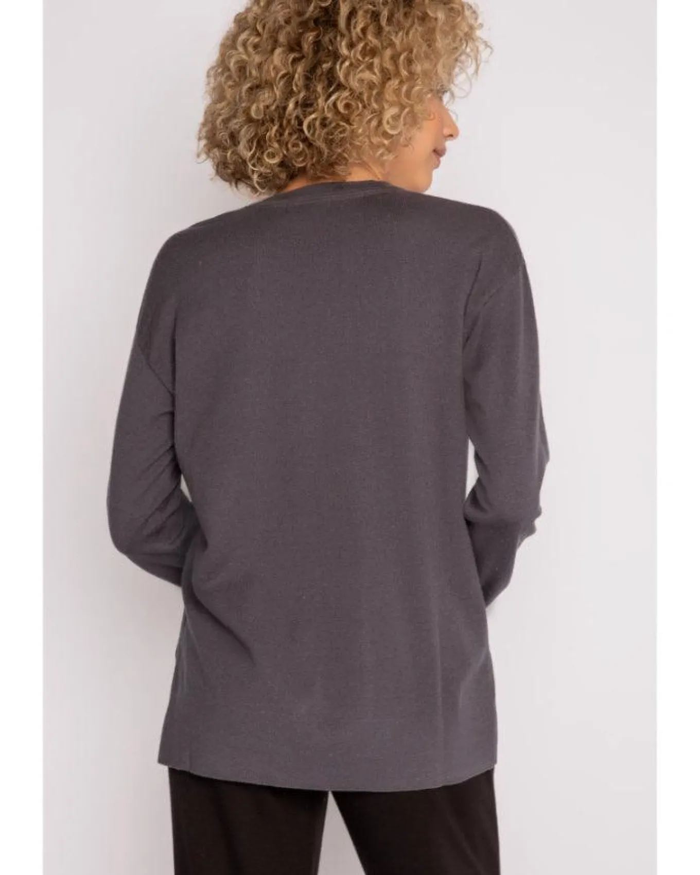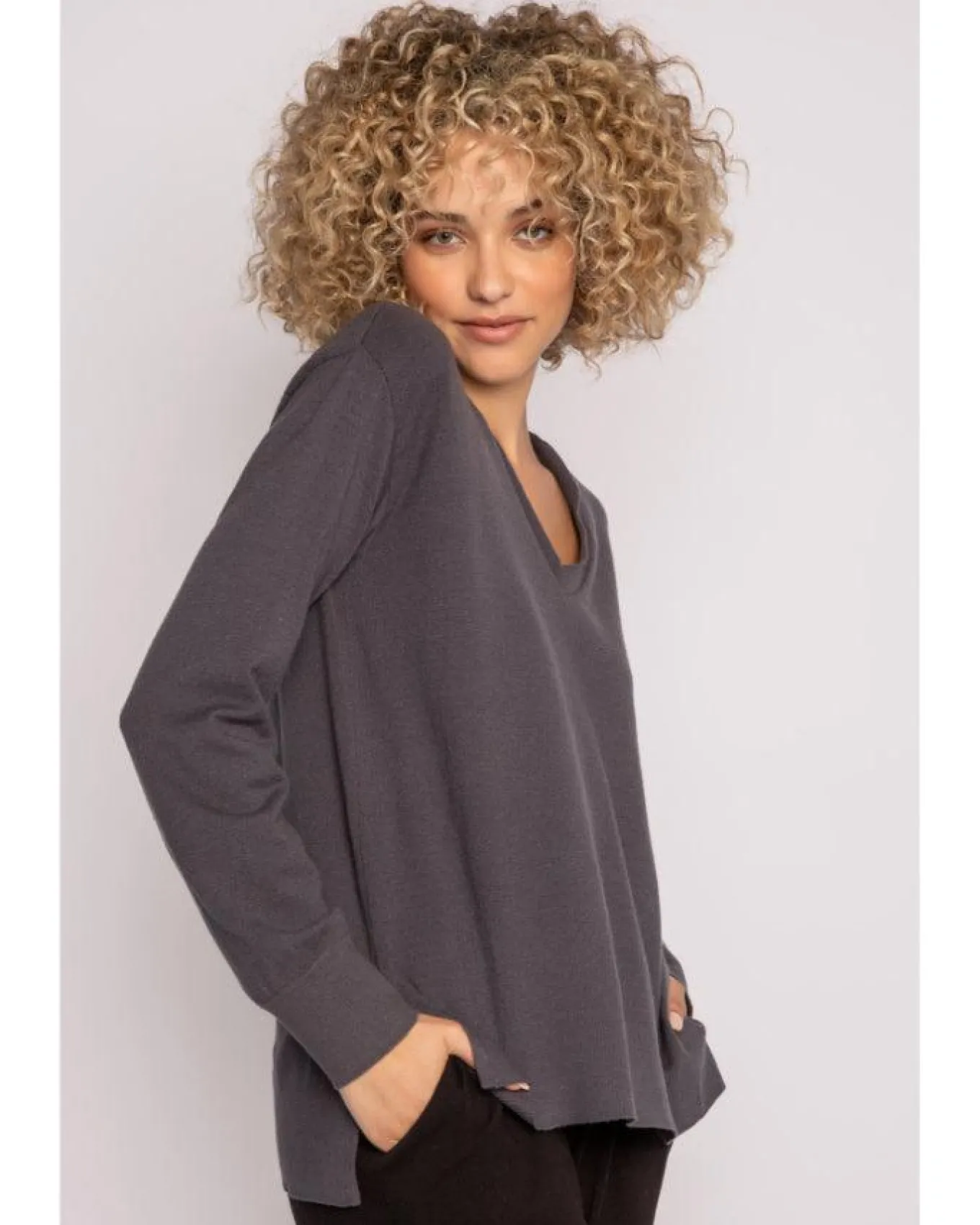 Cozy fine sweater knit long sleeeve PJ pullover with v-neck, split hem and ribbed trim
