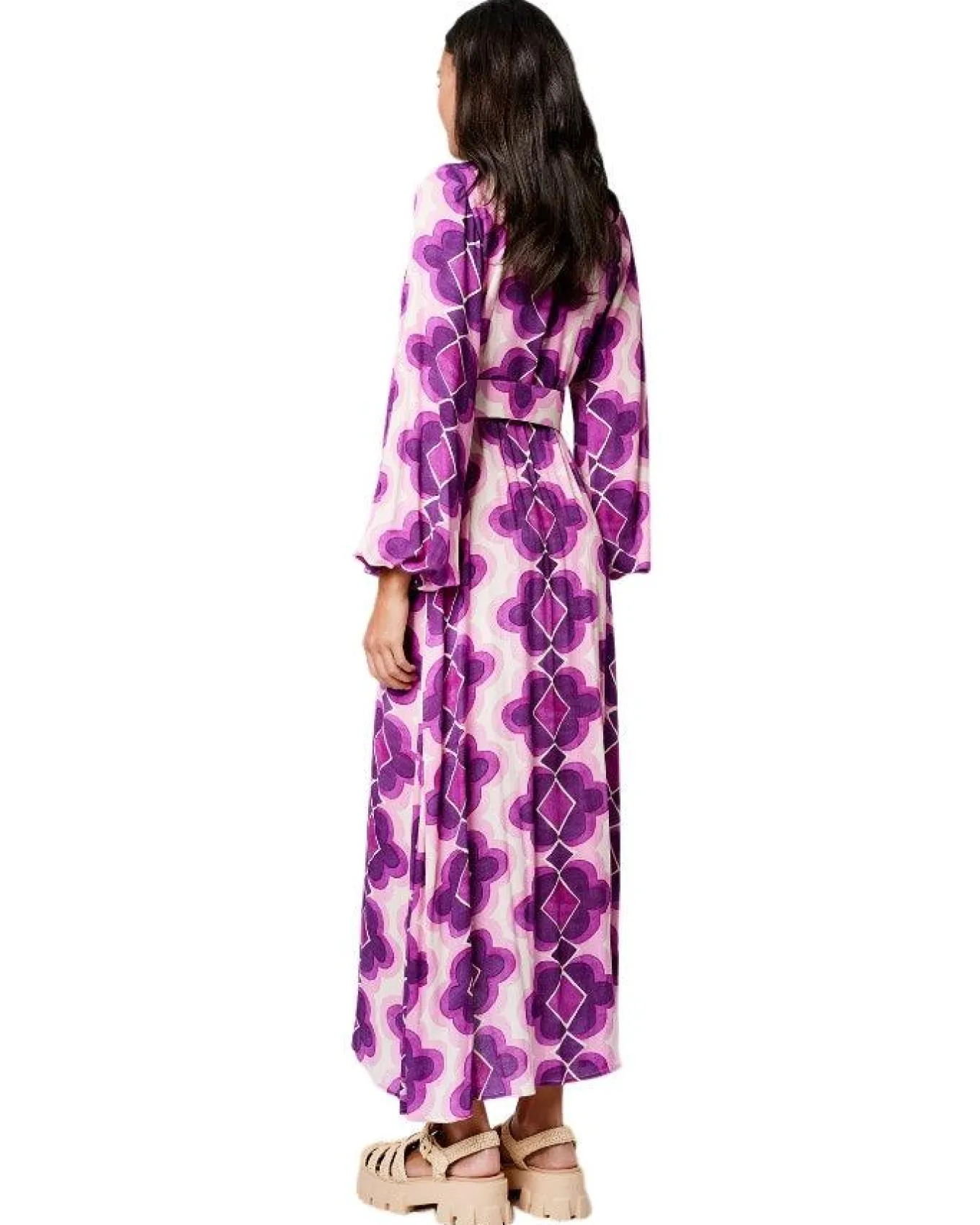 Smythe flattering midi wrap dress silhouette features dramatic lantern sleeves, a leggy asymmetrical hem line and a self-tie belt to flatter the waist.