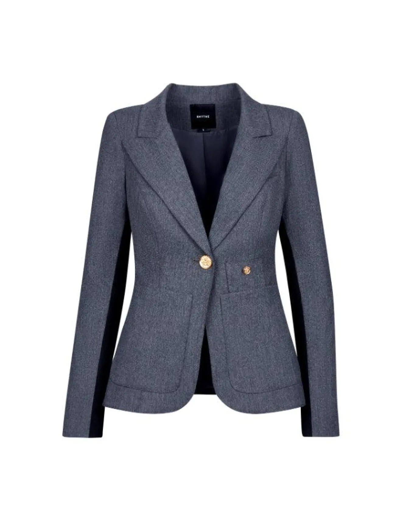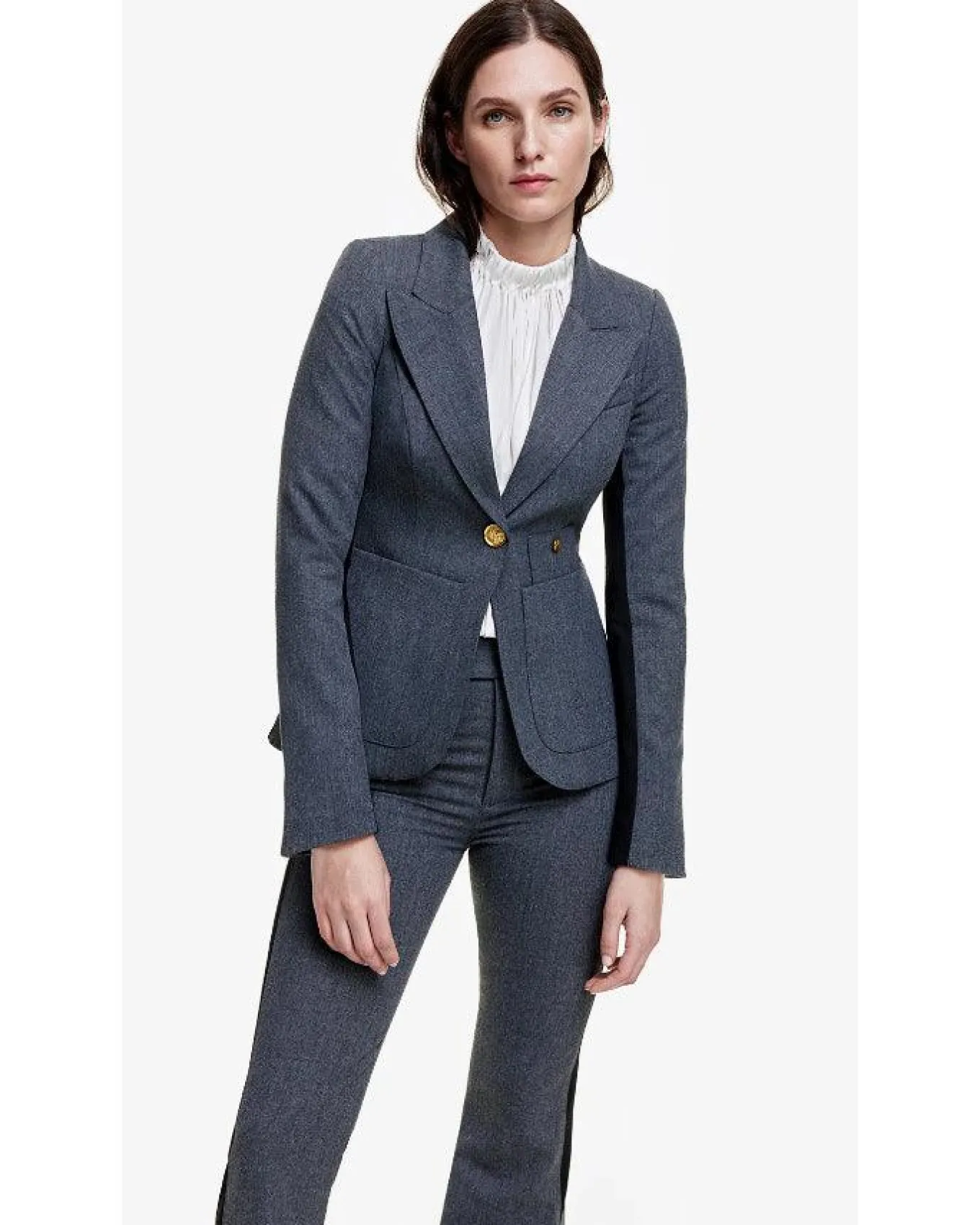 Smythe fitted, tailored tuxedo stripe single breasted blazer with notched lapels, patch pockets, contrast tuxedo stripe down sides and inner sleeves, single button closure and button cuffs, Curvy figures may wish to go up a size.