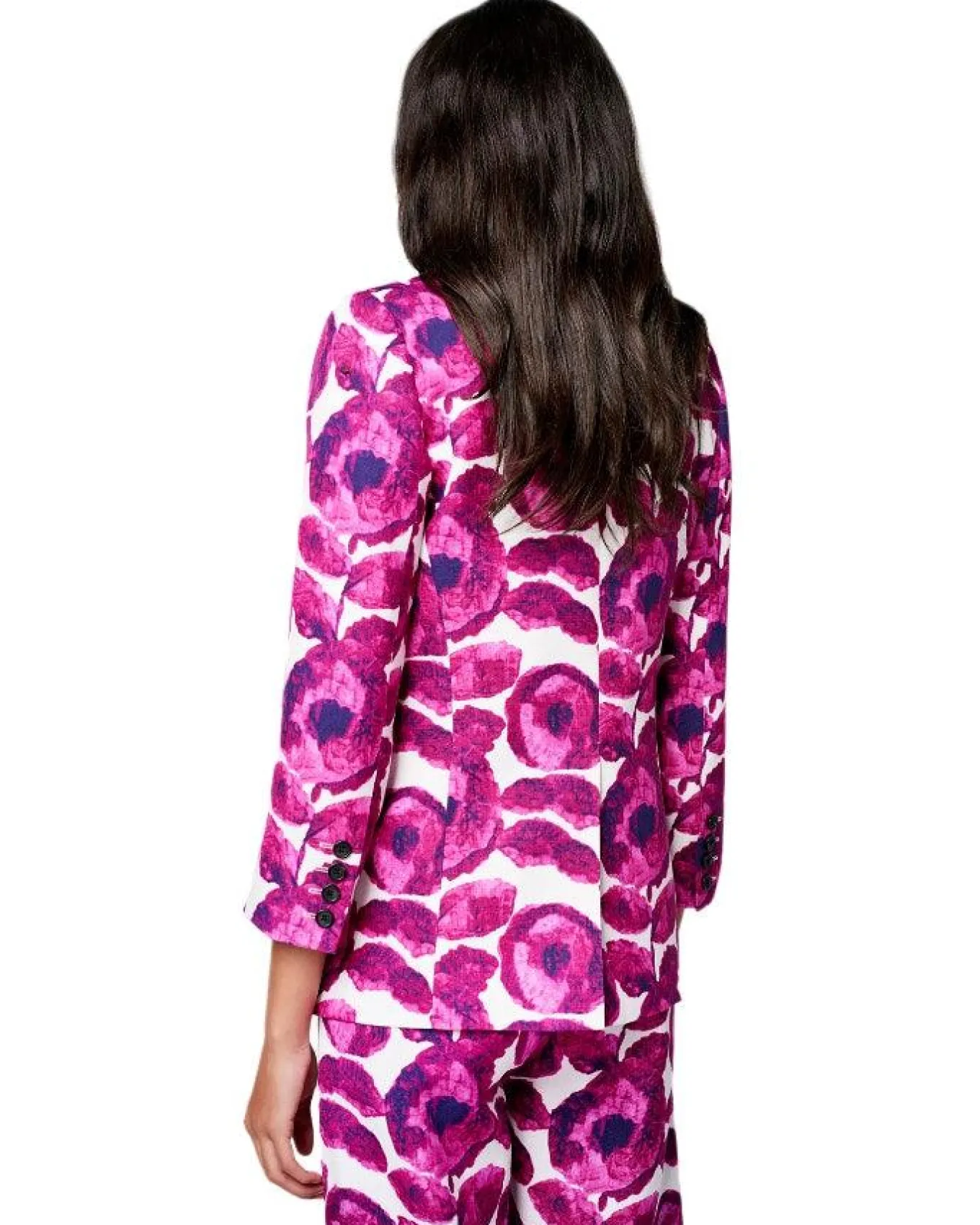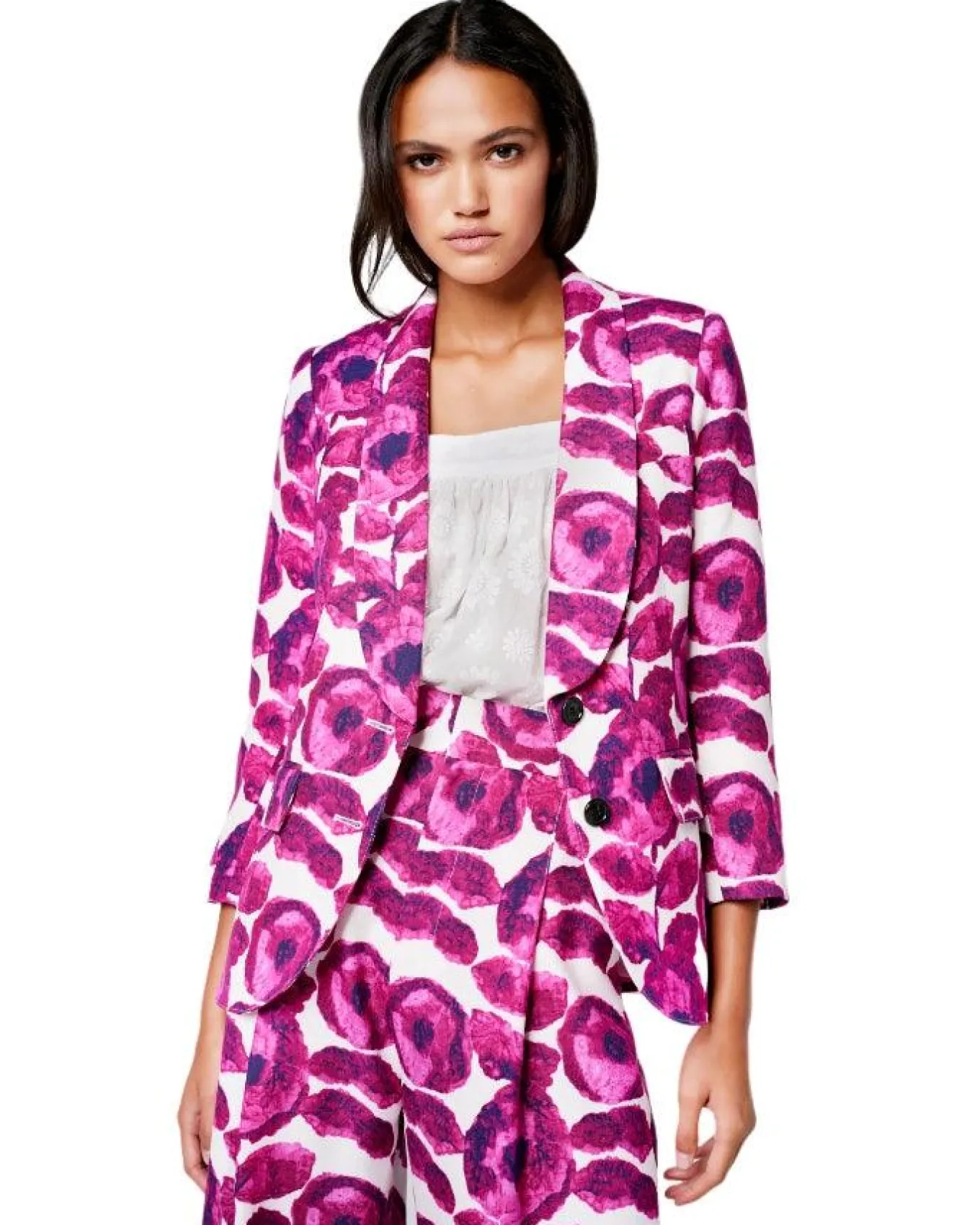 Smythe floral begonia print moderately tailored boyish silhouette falls to the low hip and features a shawl collar and a cropped summer sleeve.