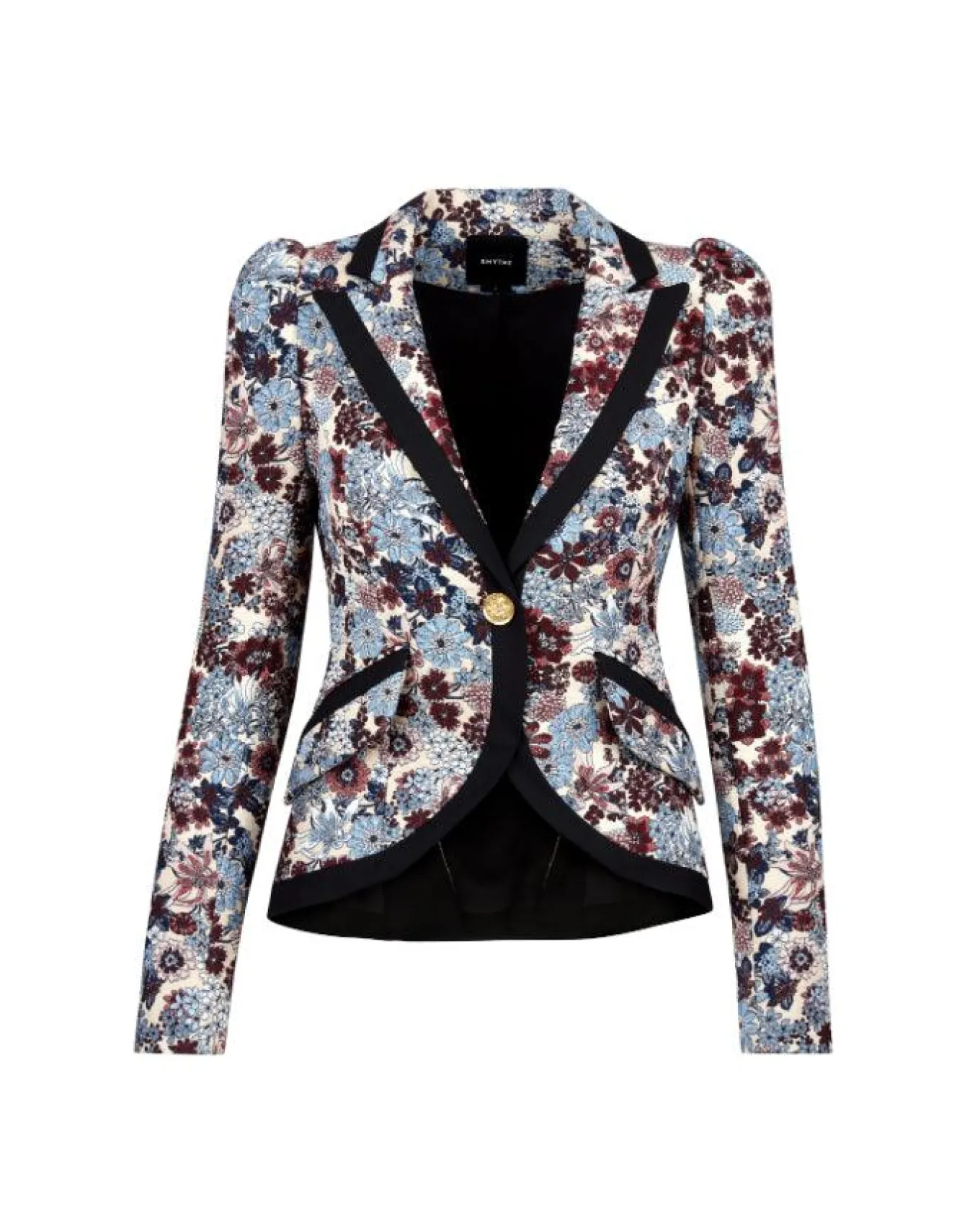 Smythe tailored single breasted cutaway silhouette one button blazer in a floral print with notched lapels, pouf sleeve shoulder, flap pockets, black contrast taping and signature gold hardware, lined. Curvy figures may wish to go up a size.