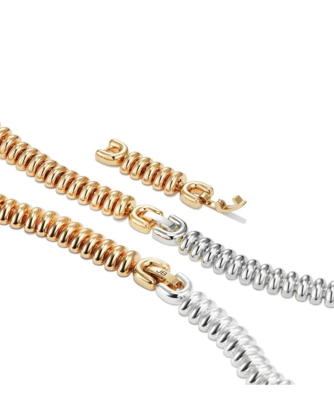 Gorgeously fluid choker that boasts a ribbed texture through a unique caterpillar construction. A removable short chain extender allows you to find your preferred fit. Finished in high-polish gold and silver dipped brass, Length 14 1/4″ – 15 3/4″, Width 0.35″