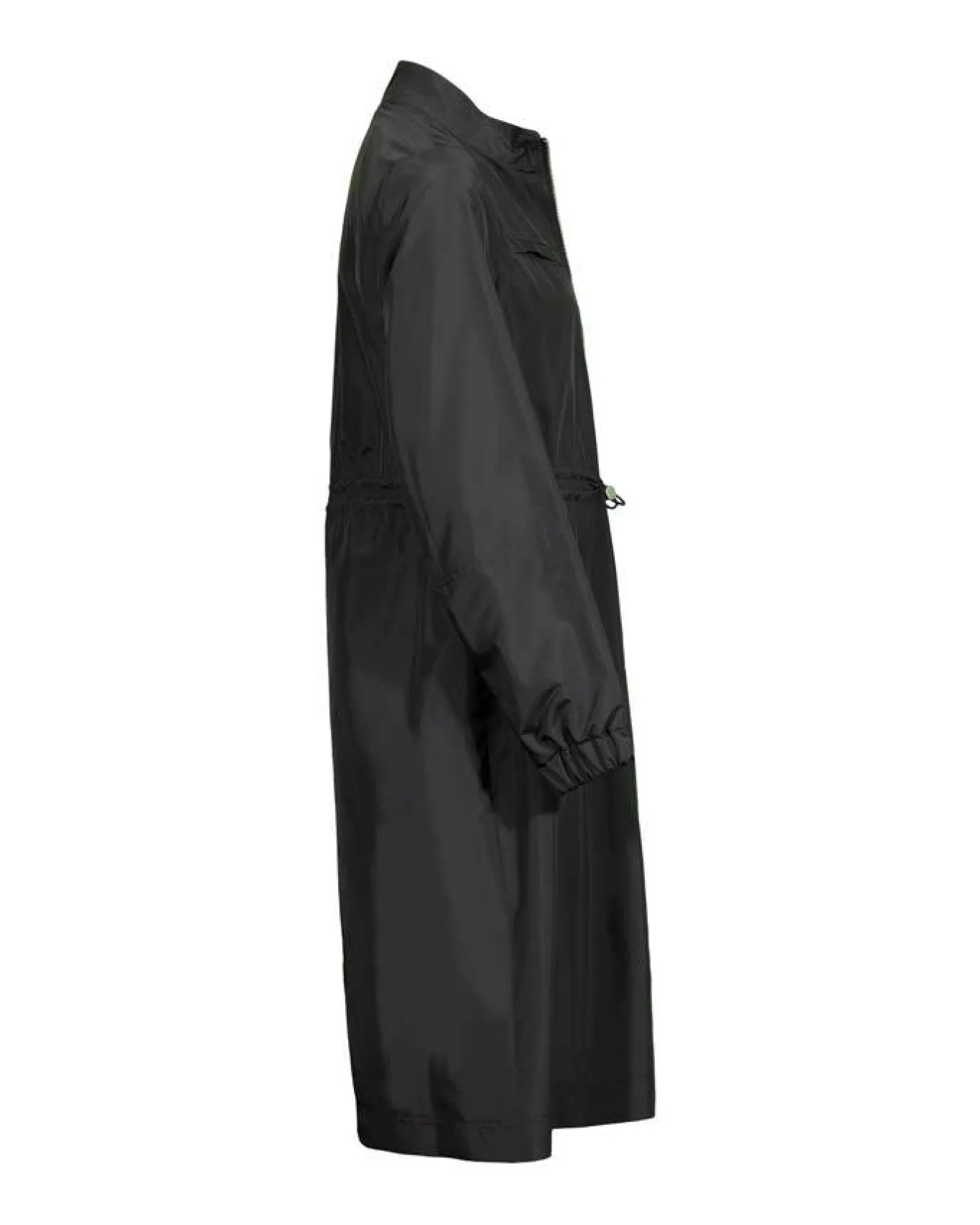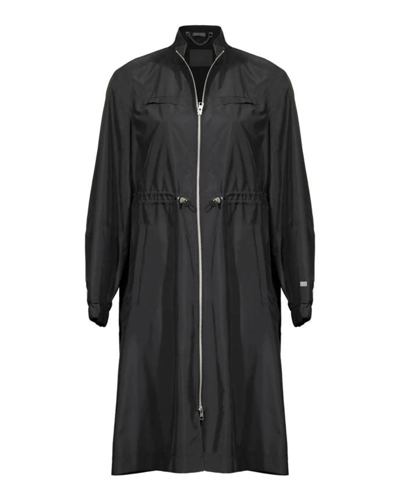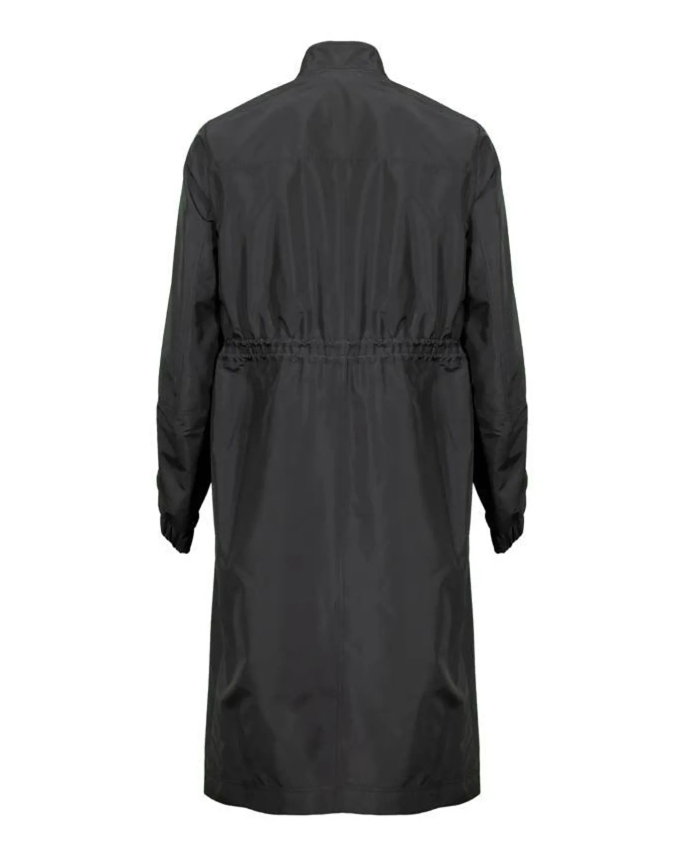 Soia & Kyo semi-fitted trench coat with stand collar, 2-way silver metal zipper closure, waist tunnel with adjustable draw cord and metal stoppers, elasticized cuffs, angled welt pockets, decorative welt chest pocket detail, lined upper body and sleeves, water repellent, Length 42″.