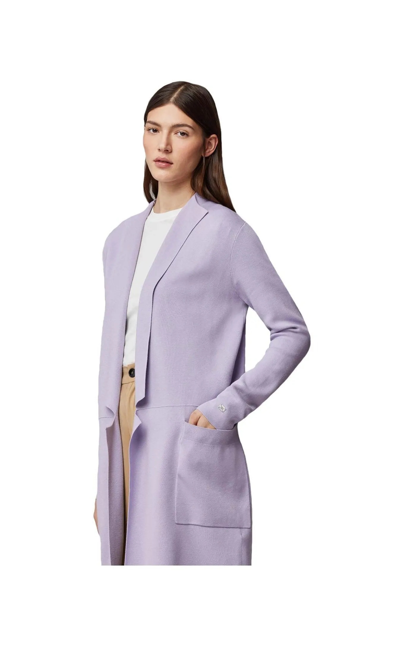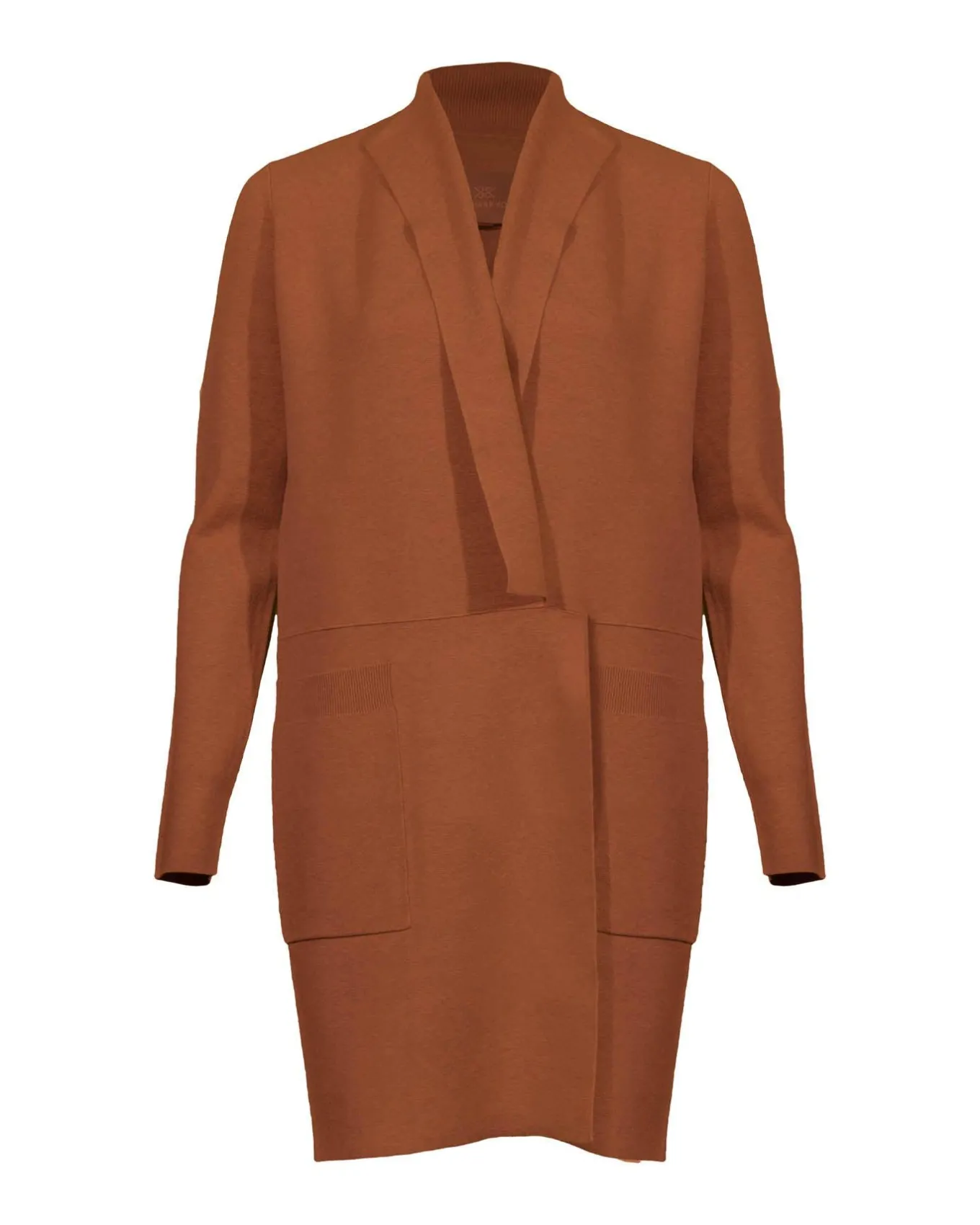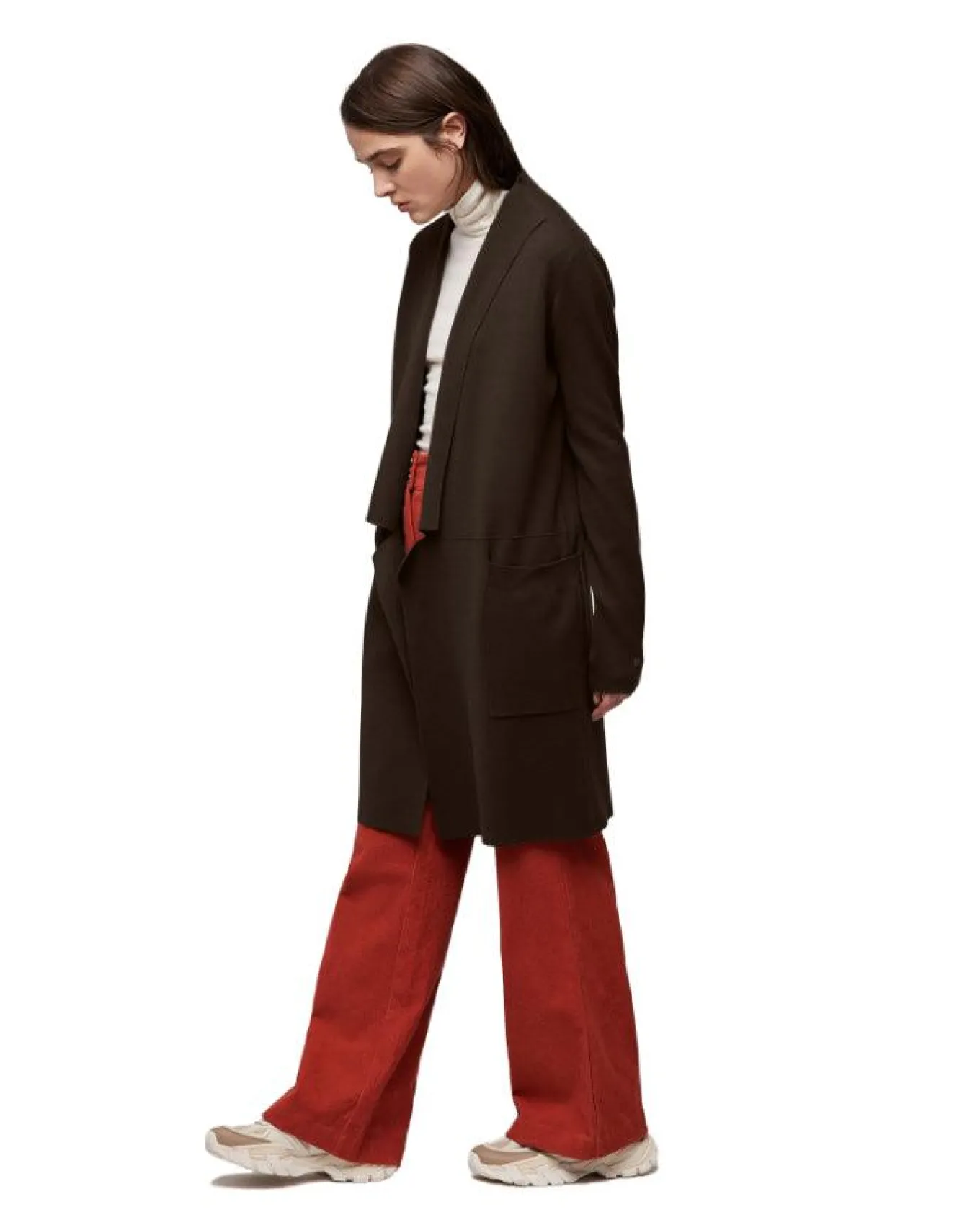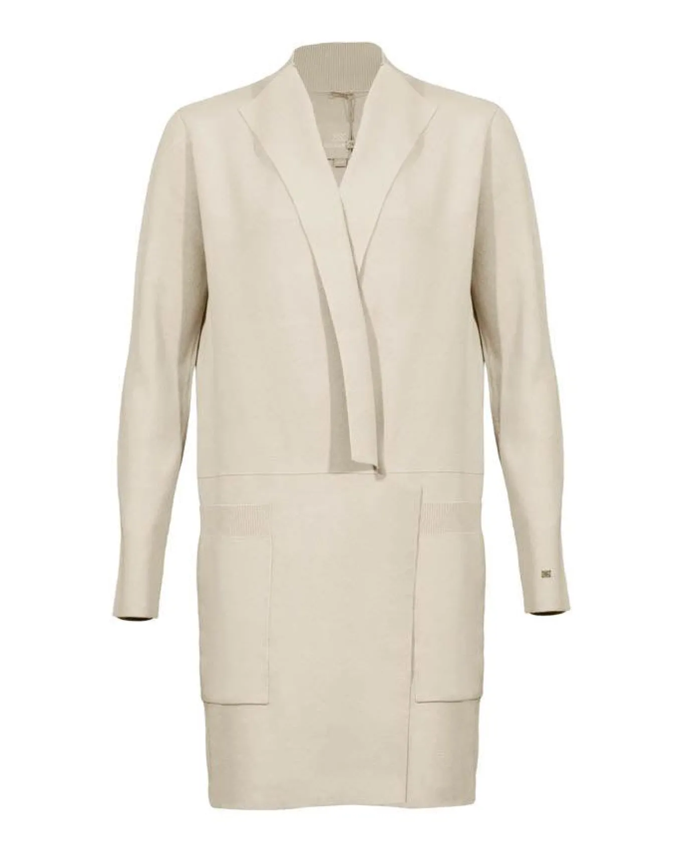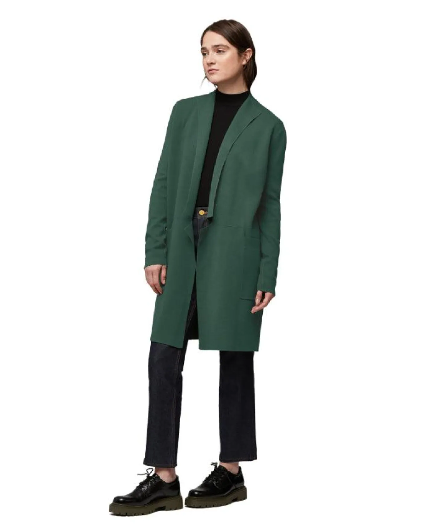 Soia & Kyo straight fit above the knee length coatigan with lapel slits, ribbed back collar and patch pockets with ribbed opening edge, Size XS – 34″ Length