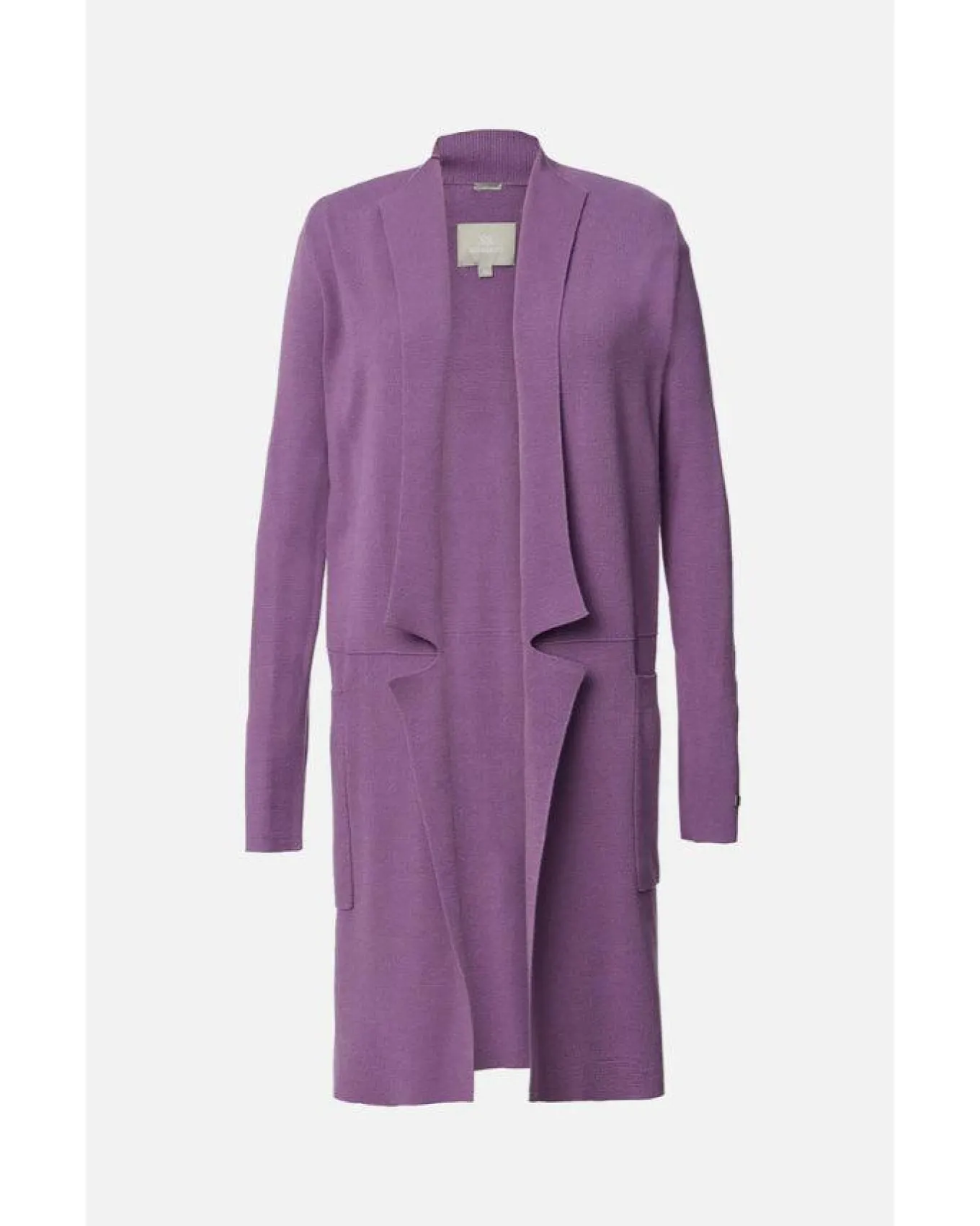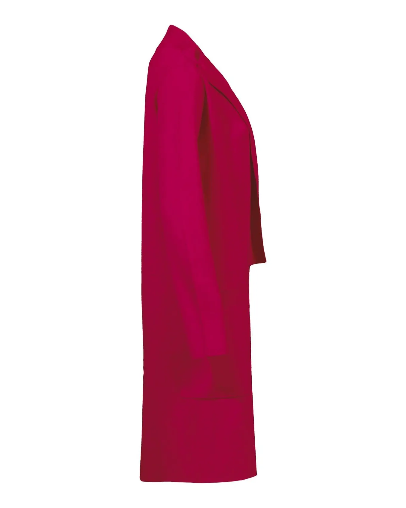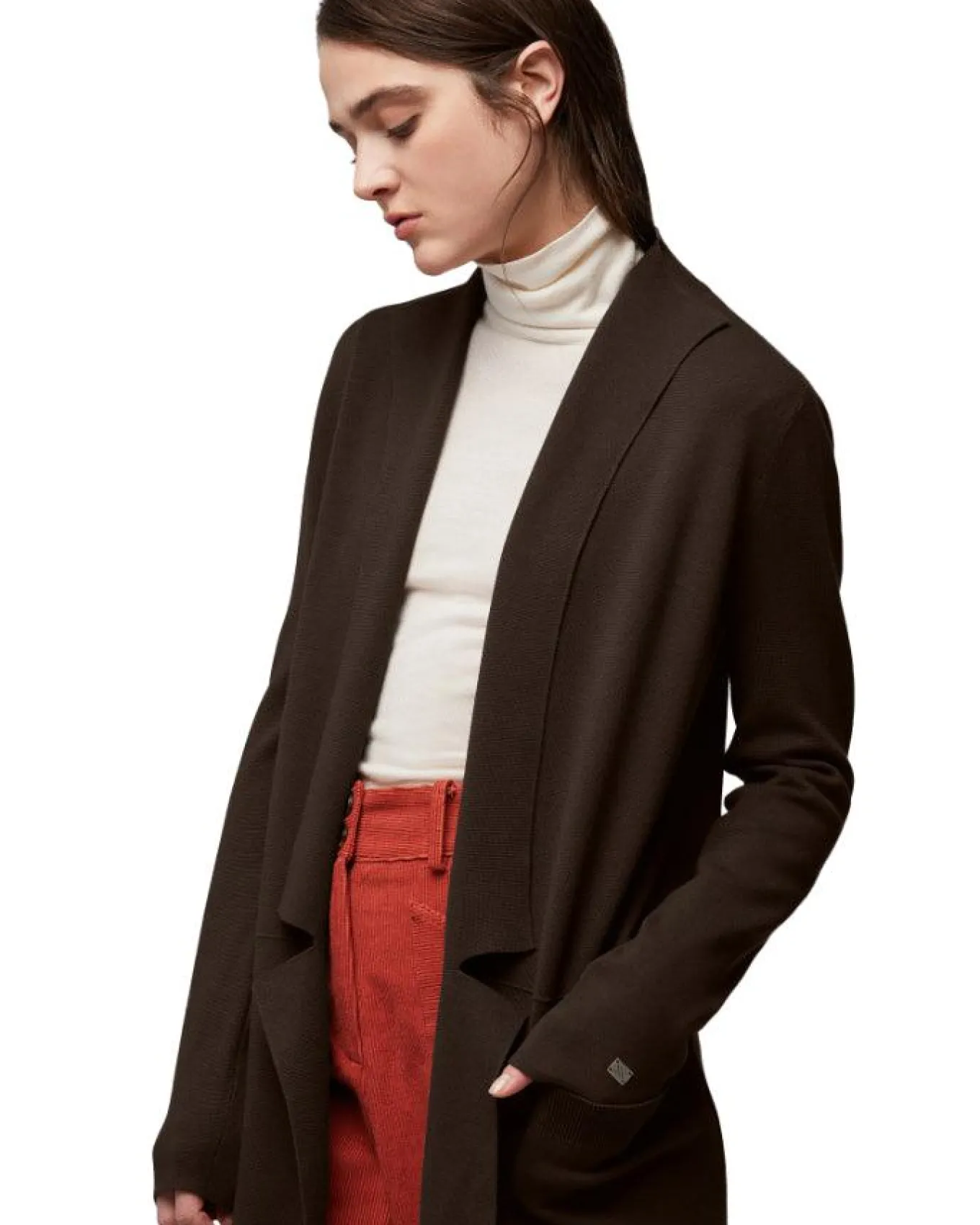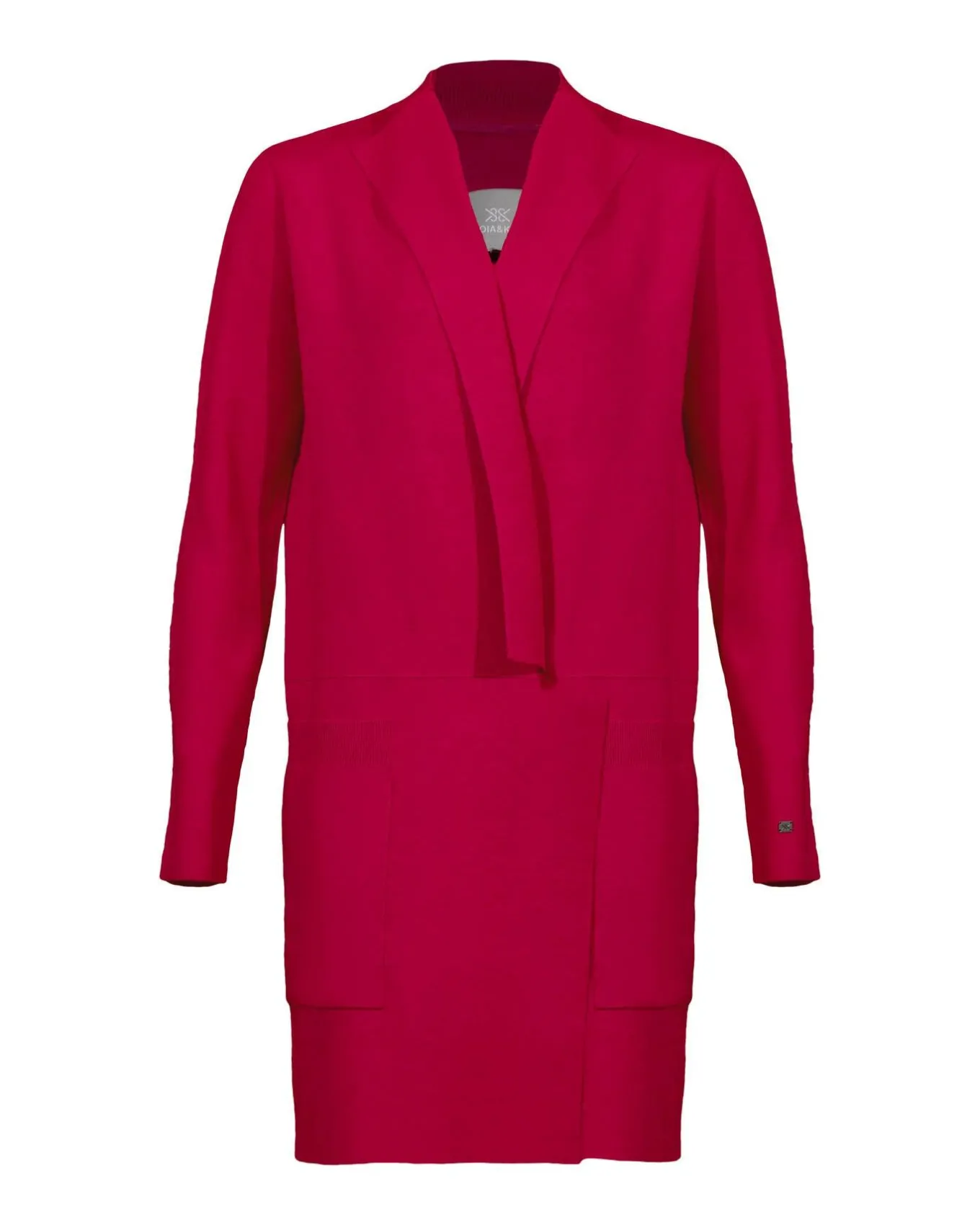 Soia & Kyo straight fit above the knee length coatigan with lapel slits, ribbed back collar and patch pockets with ribbed opening edge, Size XS – 34″ Length