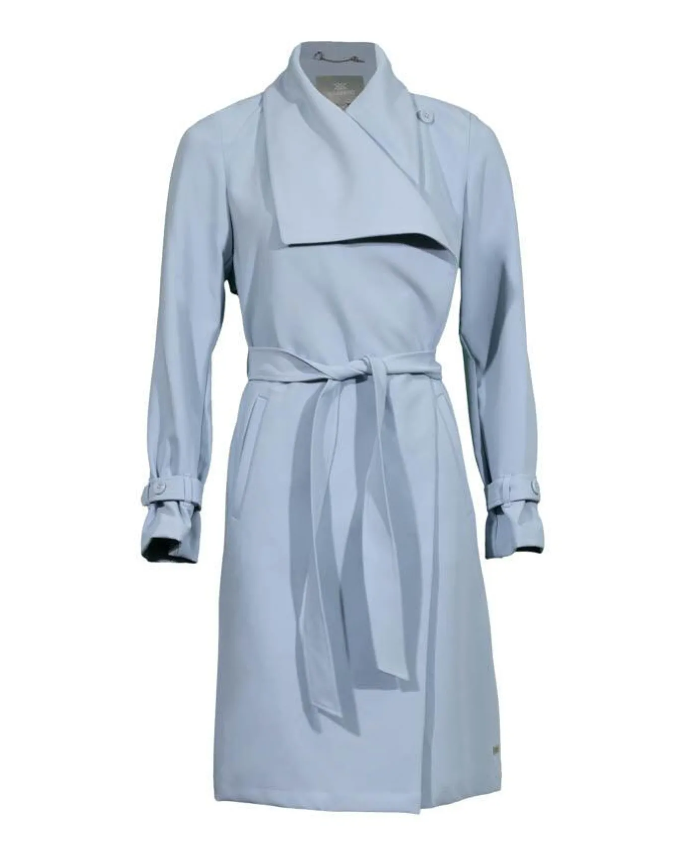 Soia & Kyo relaxed fit trench coat with cascade collar, wrap front closure with hidden button at collar, detachable tie belt, back storm flap, adjustable sleeve belt with buttons, angled welt pockets, half back lining, knee length 39″.