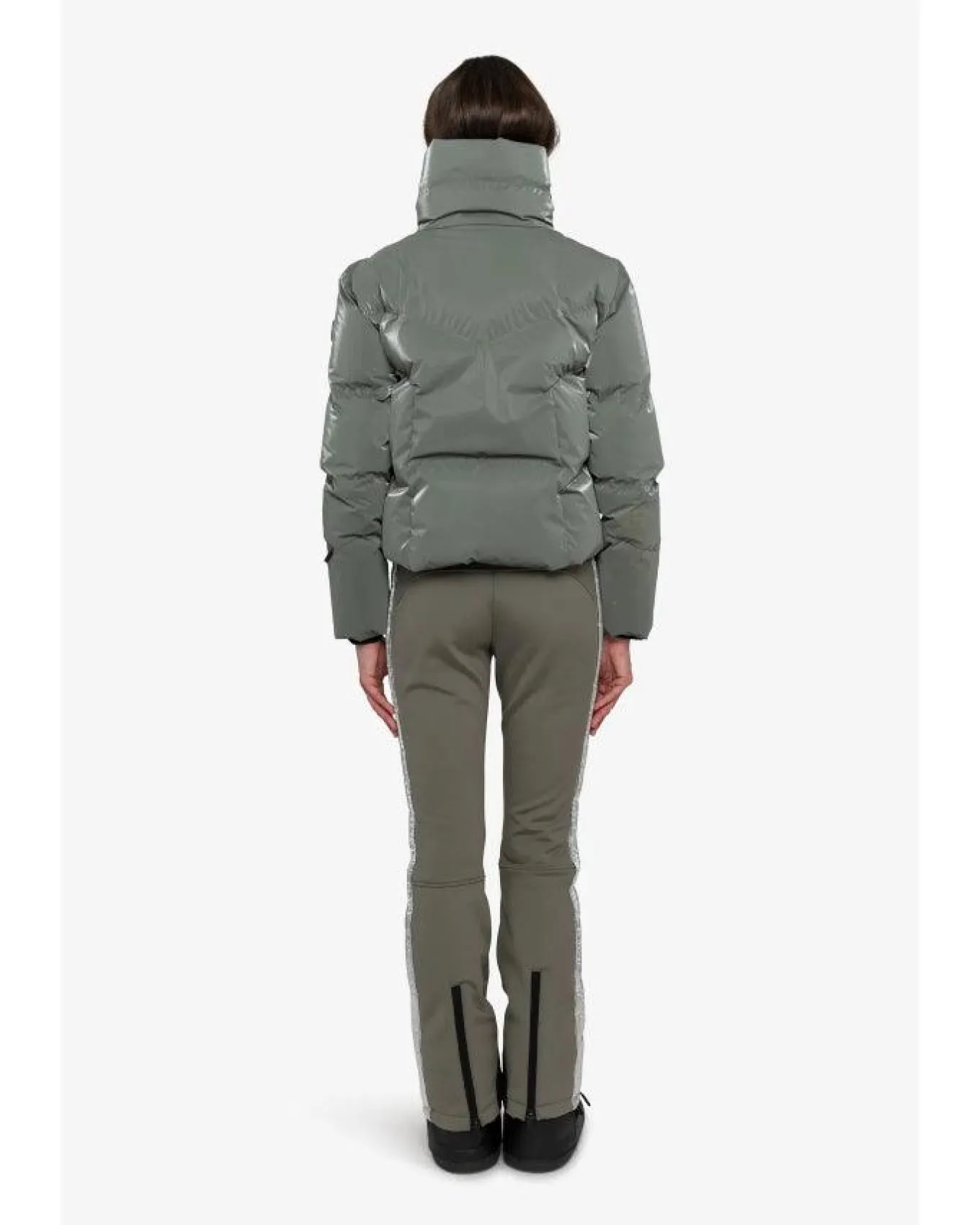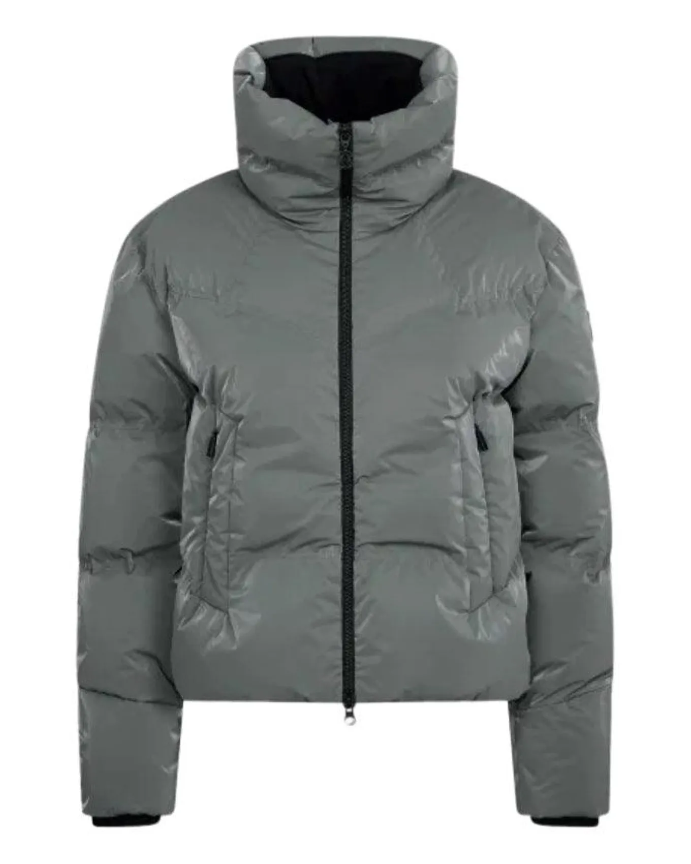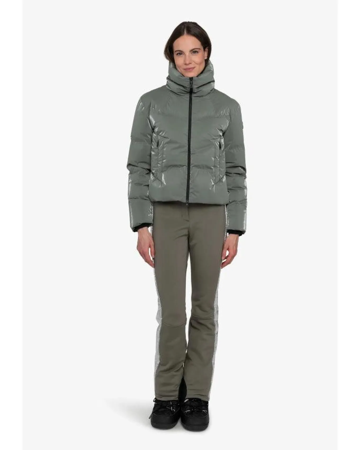Sportalm high quality ski jacket made with real down filling and first-class ski fabric. Short cut, slightly oversized, visible zipper in front, zip pockets, double quilting give jacket a dynamic look. The seam-thin zipper on the left sleeve forearm offers storage space, large jersey collar and cuffs provide comfort, while the wind guard in the lining and zippered pocket inside ensure that you stay warm and protected. Size 36 – Back Length 55.6 cm.