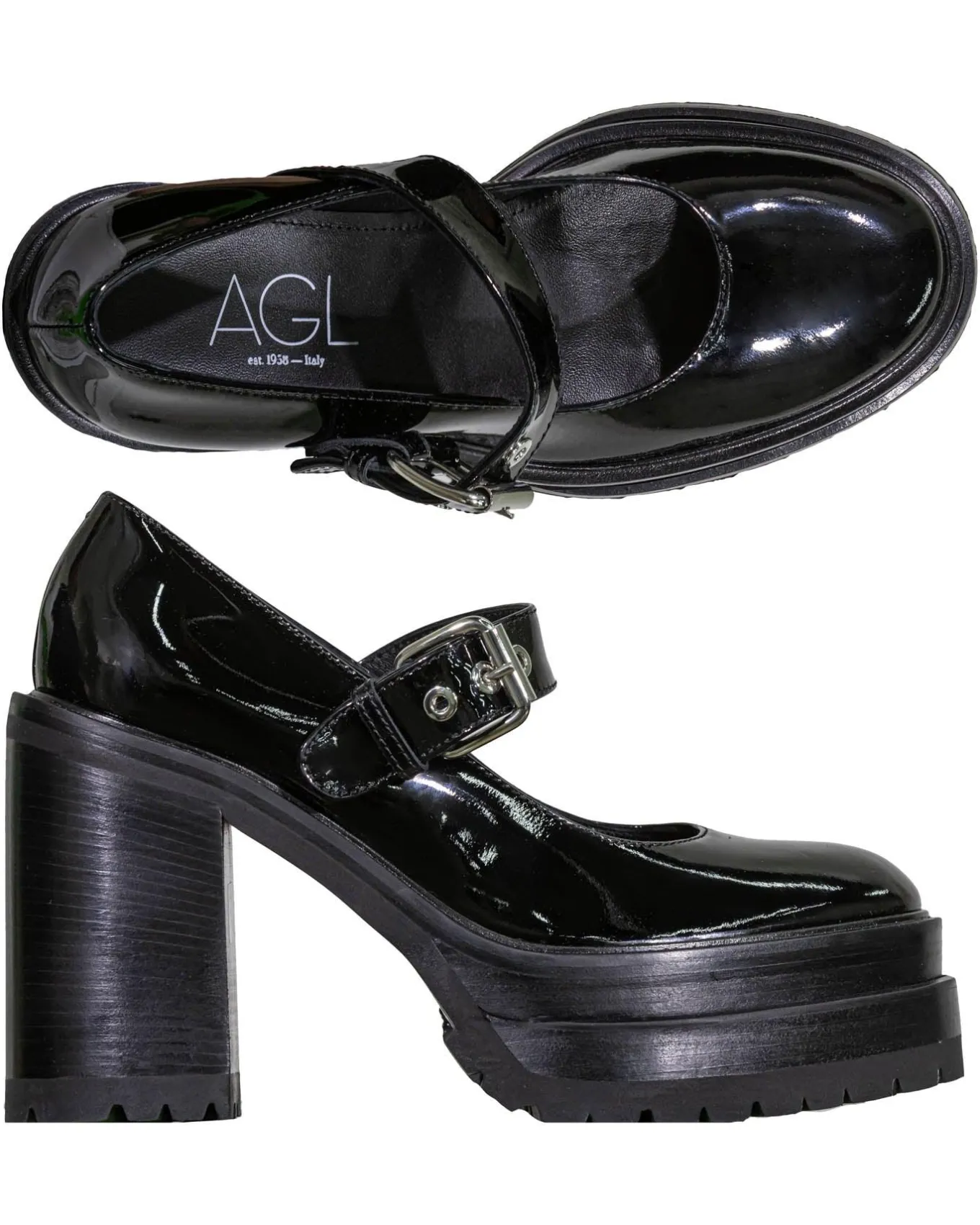 Shiny platform pumpof patent-look calfskin upper and strap with metal buckle, leather sole is hollow on the inside for lightness, while the natural rubber tread guarantees excellent grip, 4.5 cm platform and 12 cm heel
