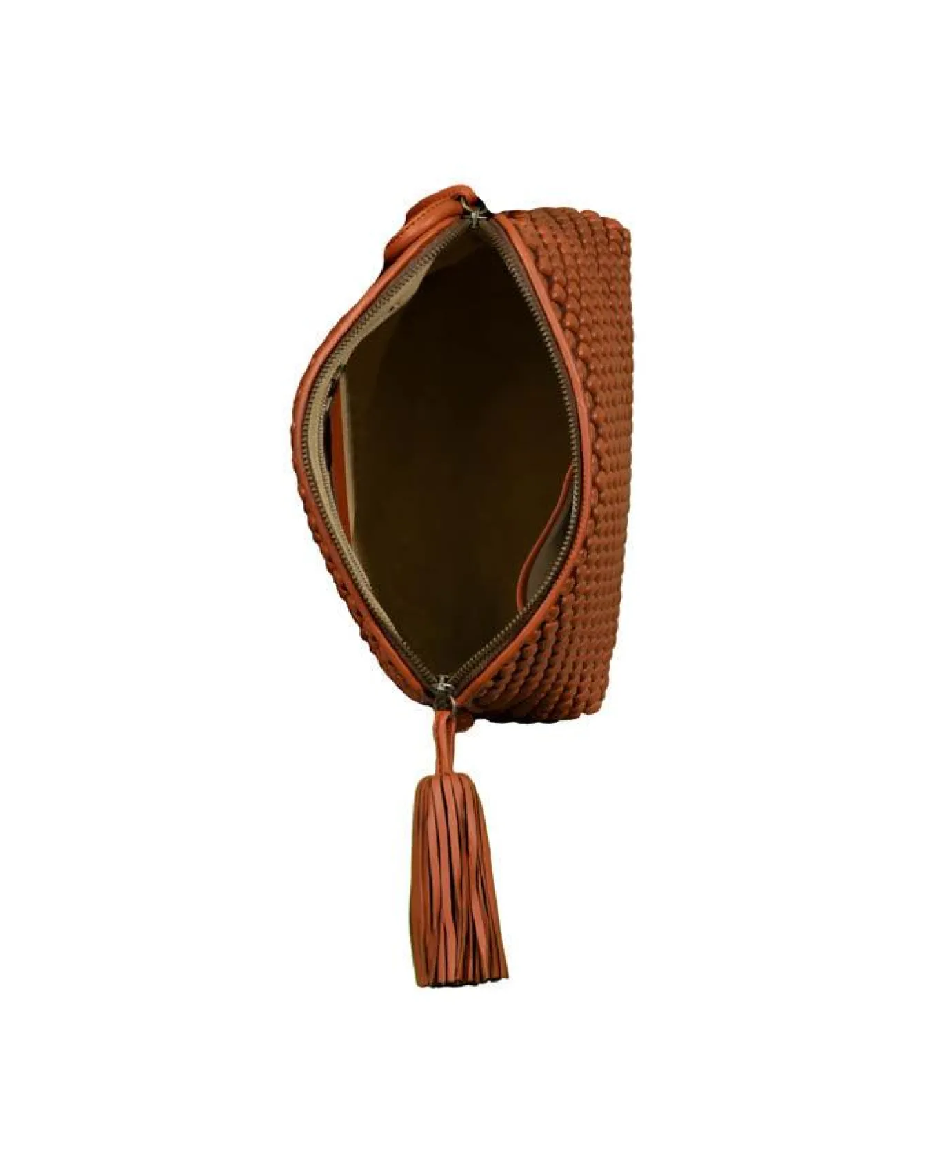 Tissa Fontaneda roomy cross body nappa bubble handbag with double tassle zip closure, one interior zip pocket, phone pocket, leather woven handles and cotton lining. Handcrafted by skilled artisan using the the finest, velvety soft nappa bubble lambskin. Dimensions: Height: 19cm, Width: 25cm, Depth: 12cm.