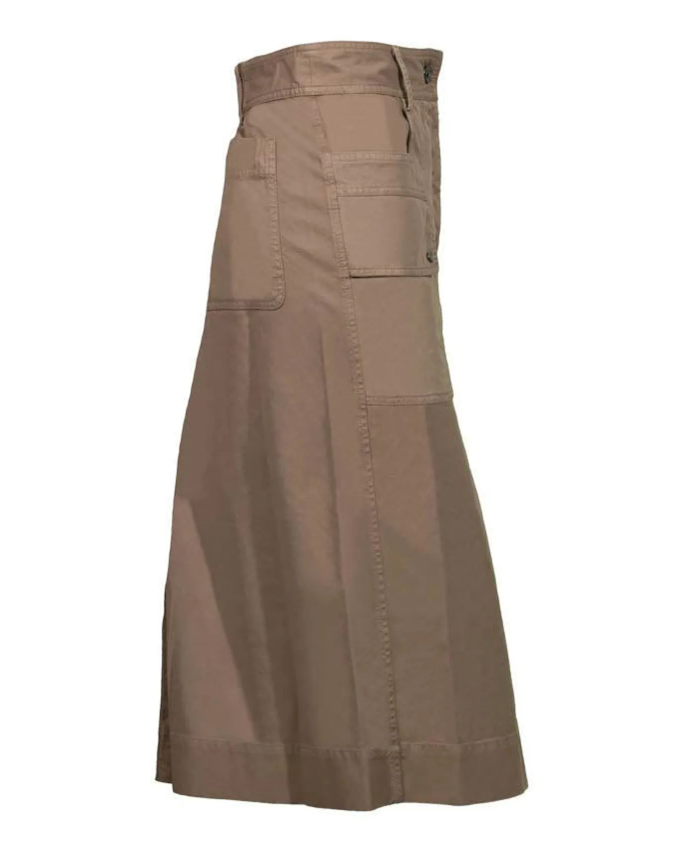 Tonet cotton blend A-line skirt features front and cargo pockets, back patch pockets, elastic back waistband, button and zip closure and front and back slits.