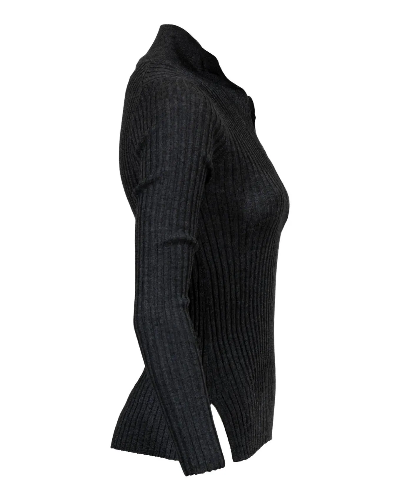 Fitted rib knit merino wool long sleeve polo style pullover with v-neck and side hem slits