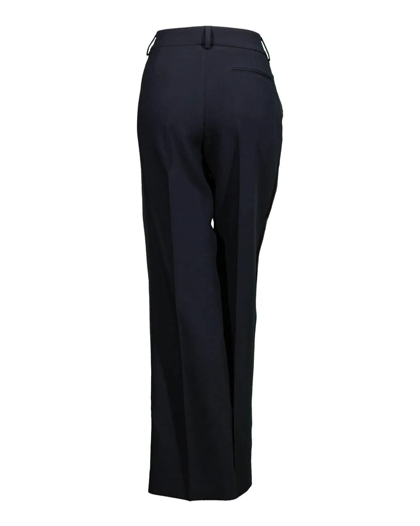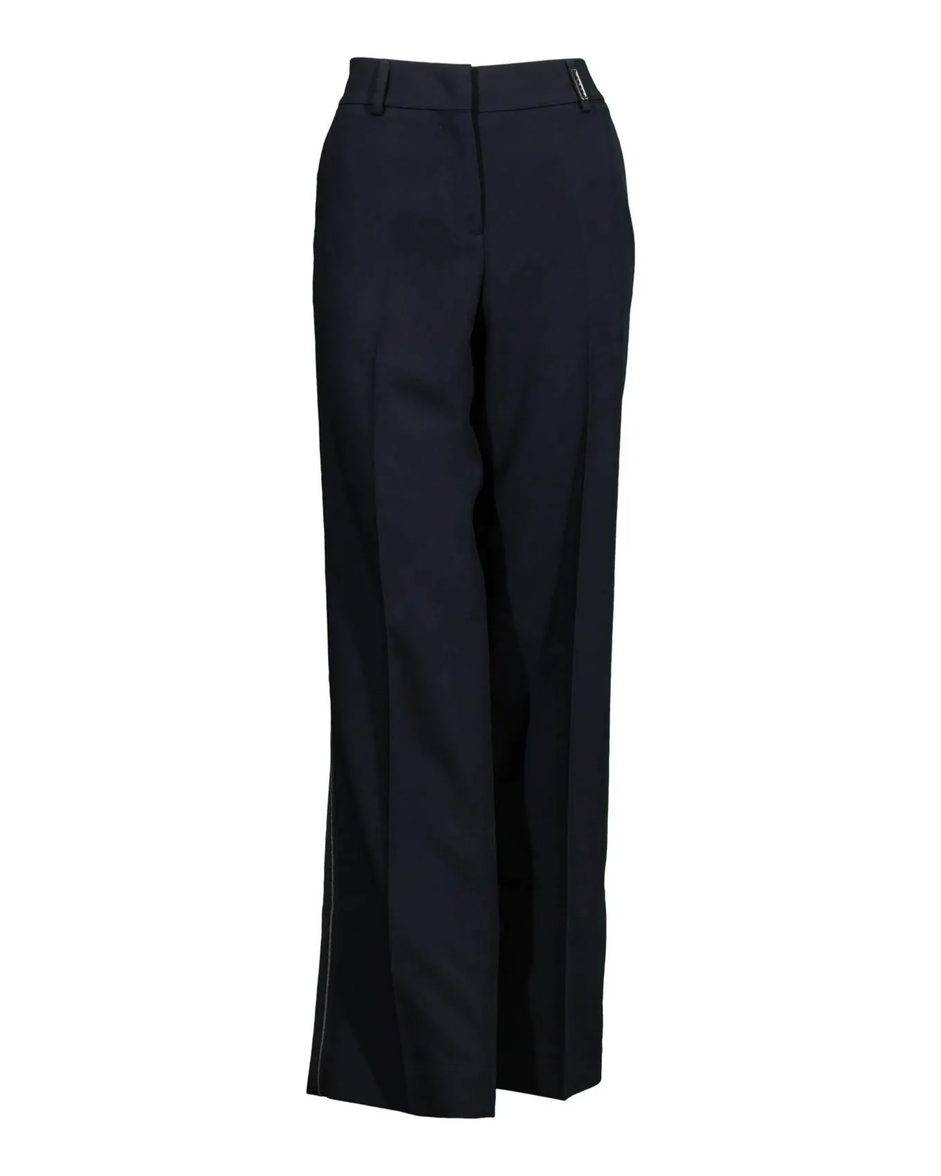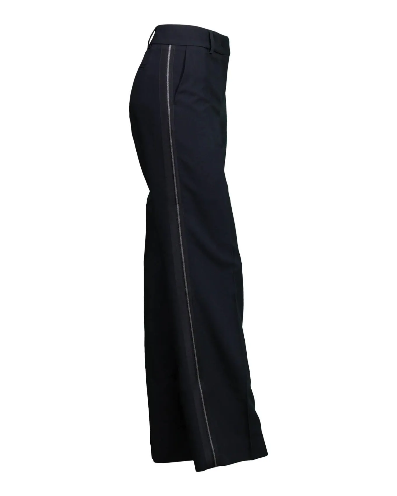 Tonet stretchy wide leg, full length dress pants with a pinstripe down sides, side slant pockets, one welt back pocket, hook andzip closure.