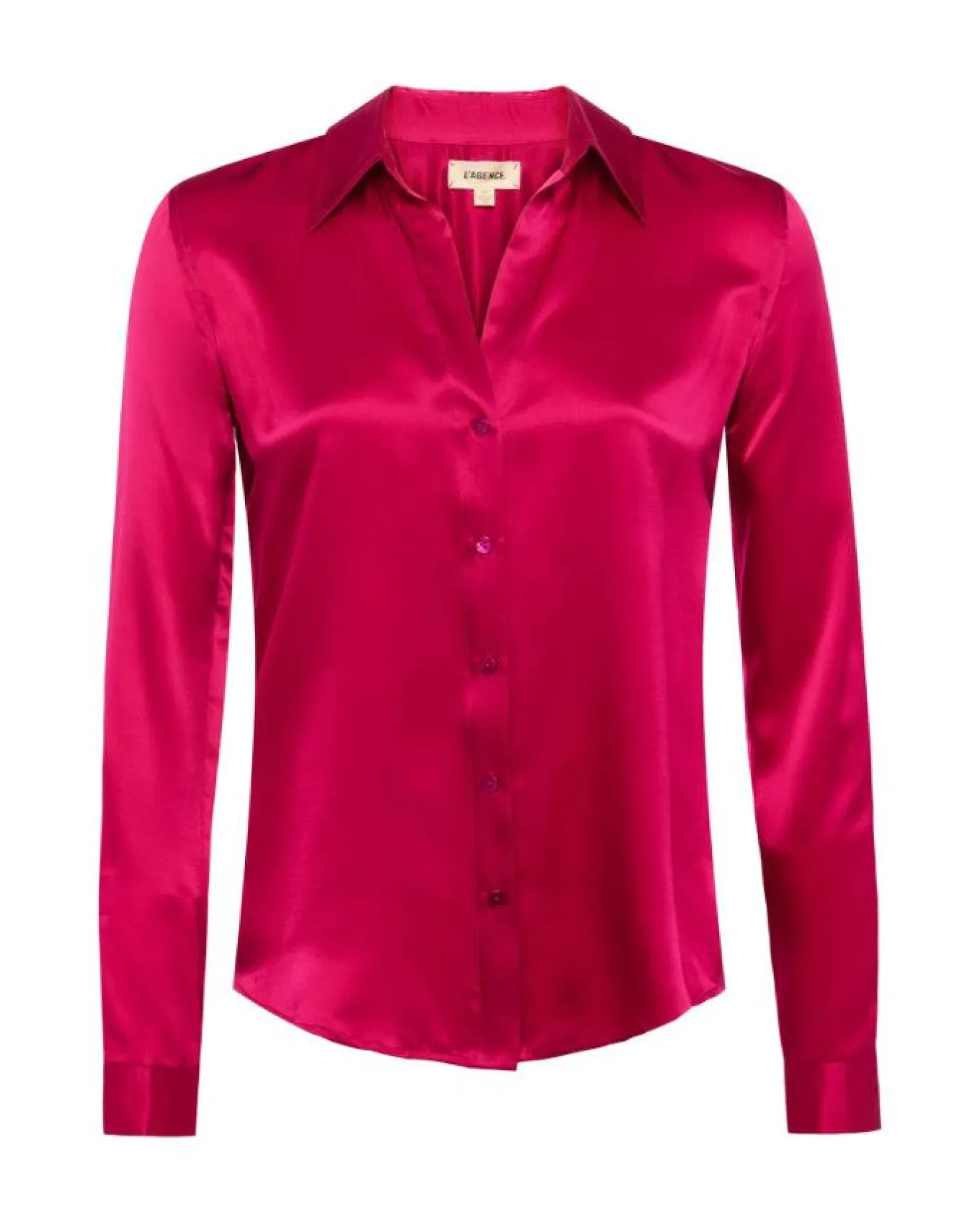 L’Agence iconic silk charmeuse ruby blouse with a sharp collar, button front, back pleated yoke, and long button-cuff sleeves, slim fit. Size XS – Length 26.4″, Sleeve Length 23.8″.