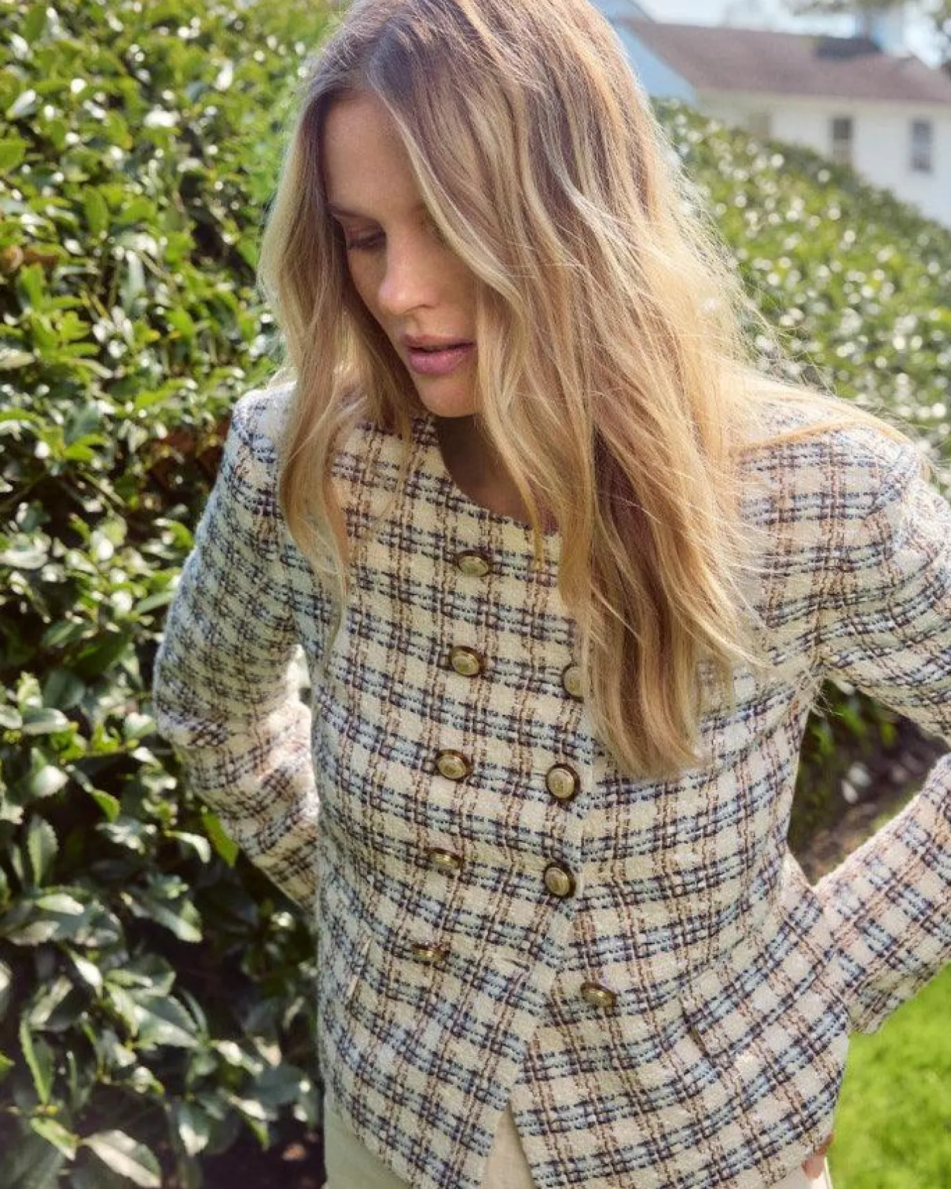 Veronica Beard tweed collarless lady jacket with padded shoulders, flap pockets and tortoise-rimmed crest buttons. Size 2 – Length 20.87″.