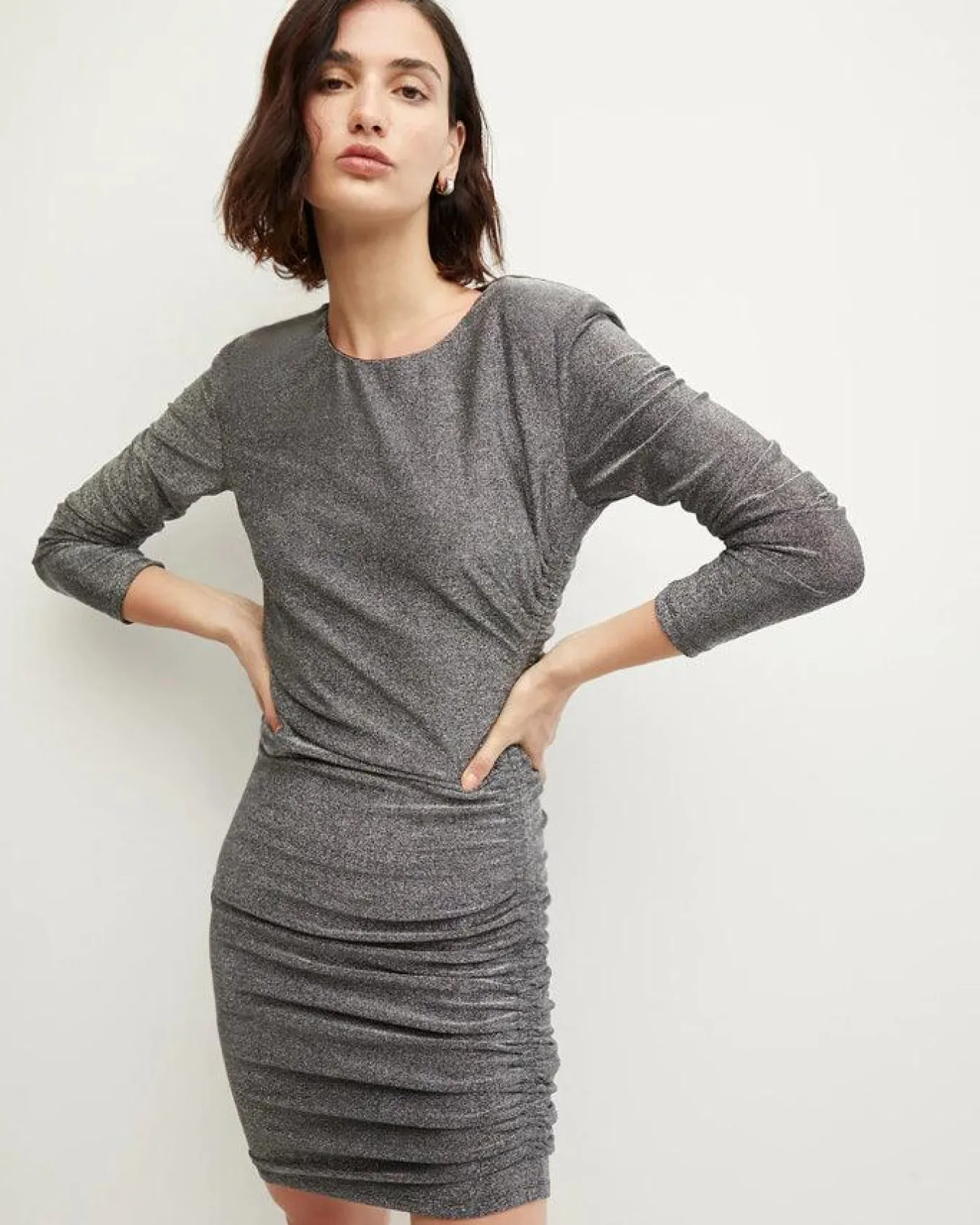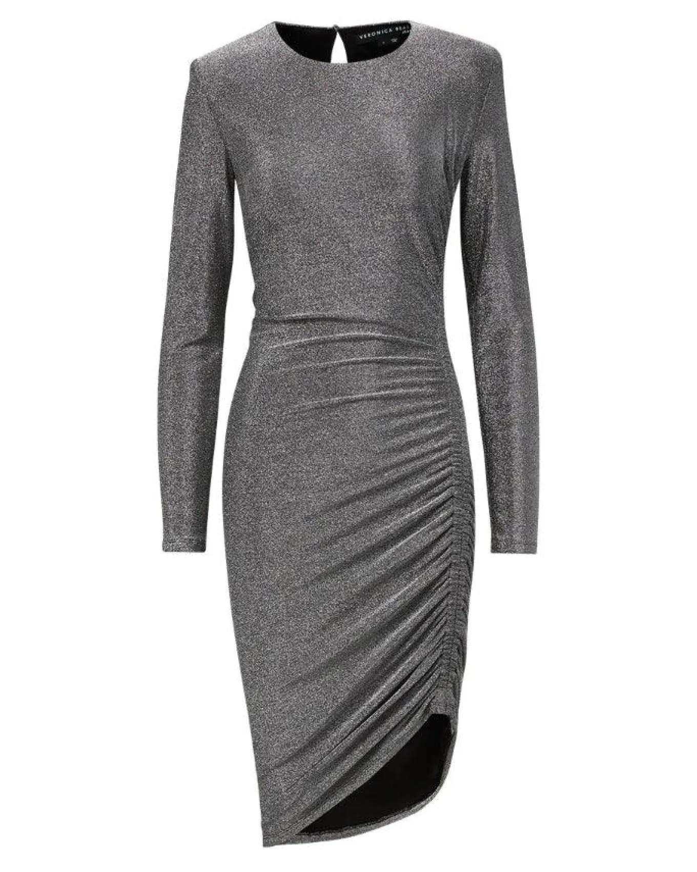 Dramatic body skimming metallic long sleeve midi dress in a stretch blend with lurex fabric features ruching at the sides, crew neck, shoulder pads and key hole button closure at back, Size S – Sleeve length 31 3/4″,Length 34″ (at shortest point)