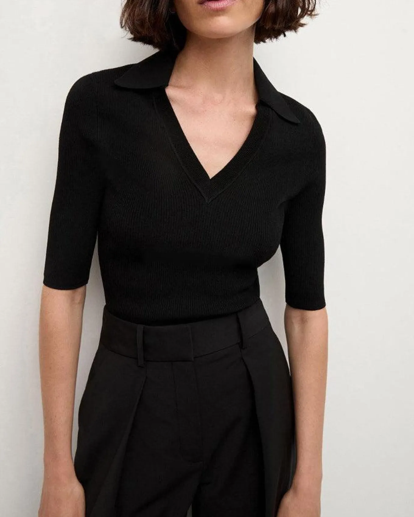 Veronica Beard sporty stretch knit polo shirt with collared V-neck and elbow length sleeves, Size S – Length 22″, Sleeve Length 19″.