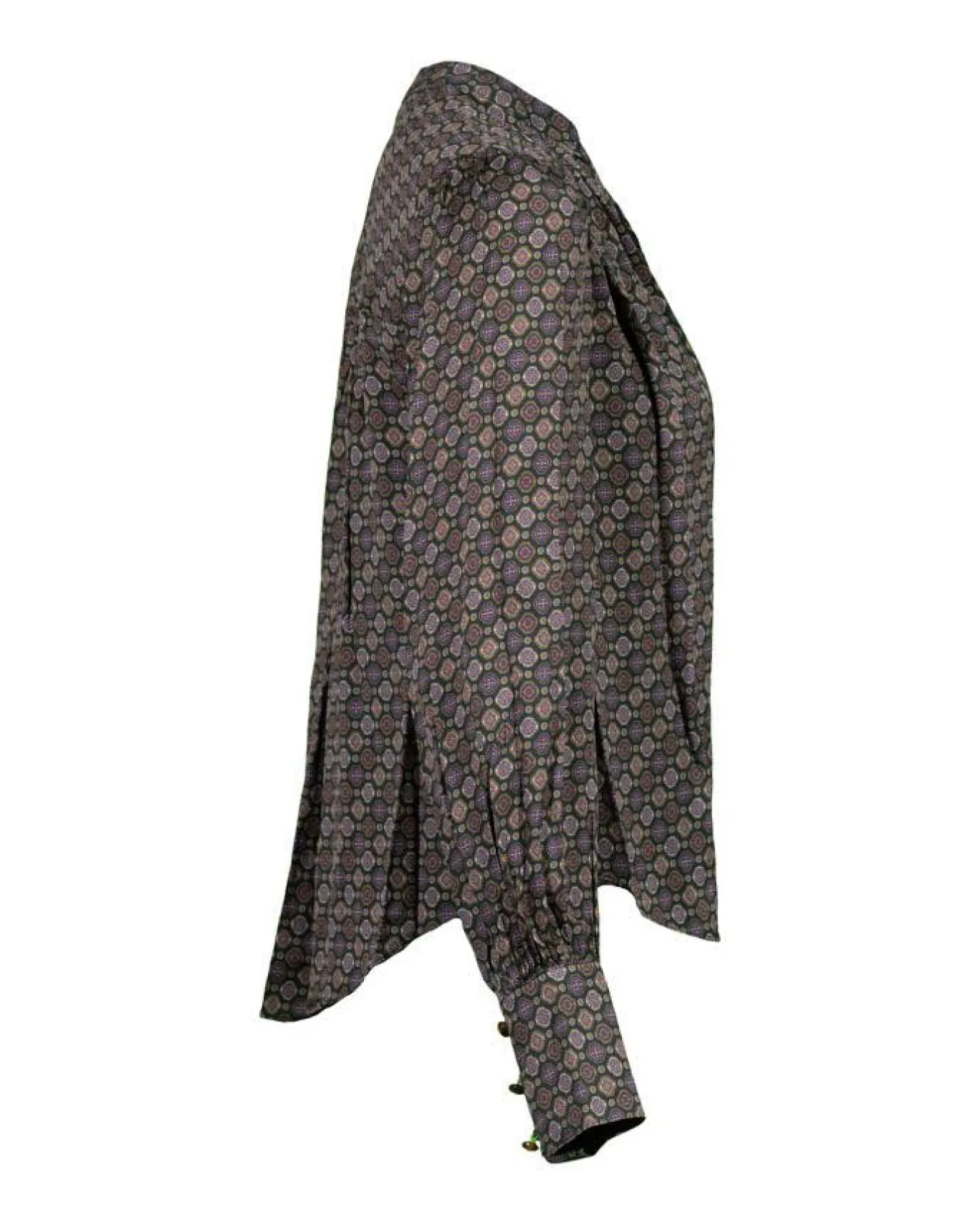 Veronica Beard silk blend print blouse with v-neckline, gathers at shoulder line front and back, long sleeves and button down front, Size 4 – Length 24″