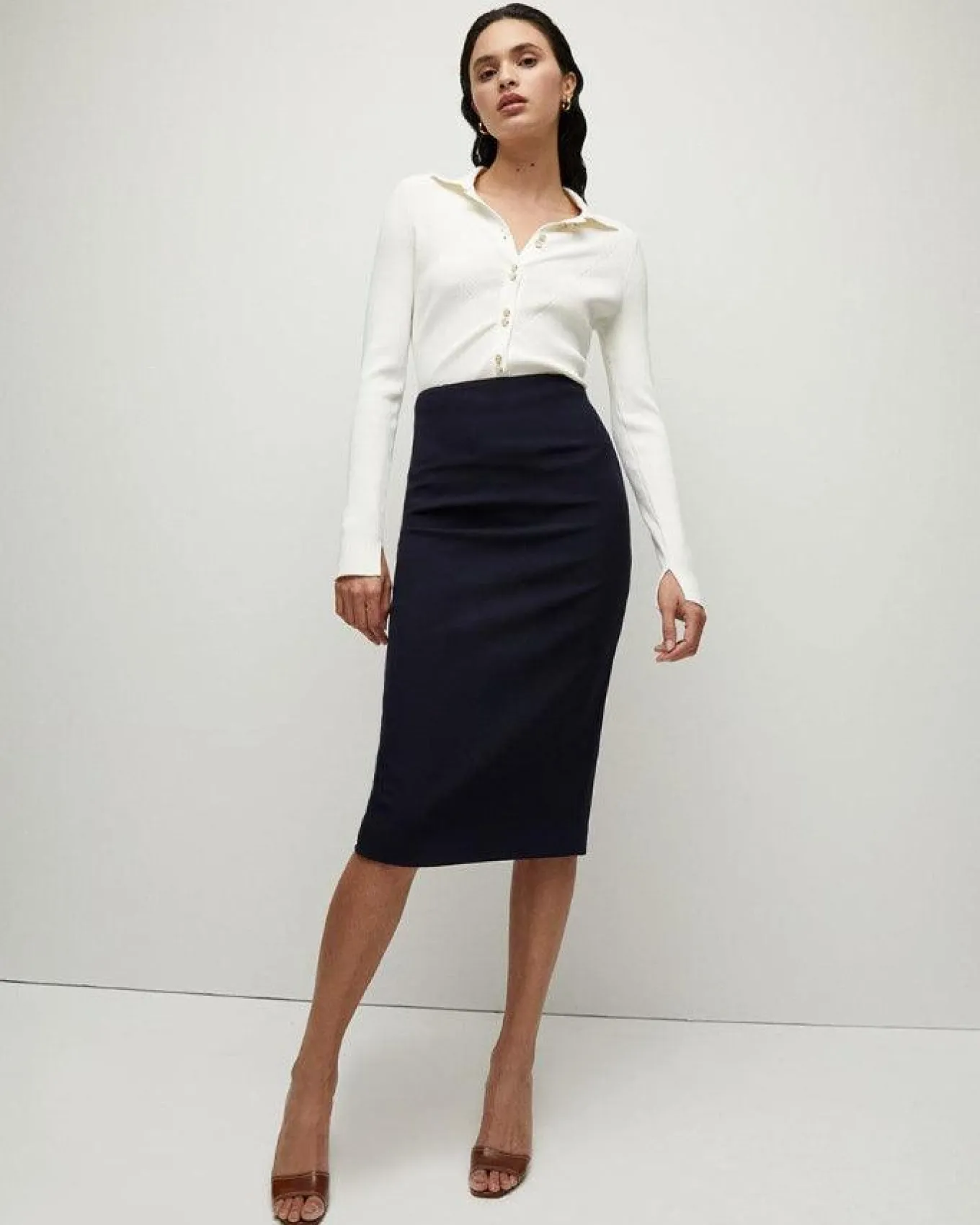 The midi silhouette exudes elegance, while the vertical seaming works wonders to subtly cinch the waist, creating a flattering shape that speaks volumes of your refined taste. Whether you’re dominating the boardroom or attending a sophisticated soirée, the Holmes Pencil Skirt ensures you make a statement of understated elegance, every time., Size 2 – Length 29″