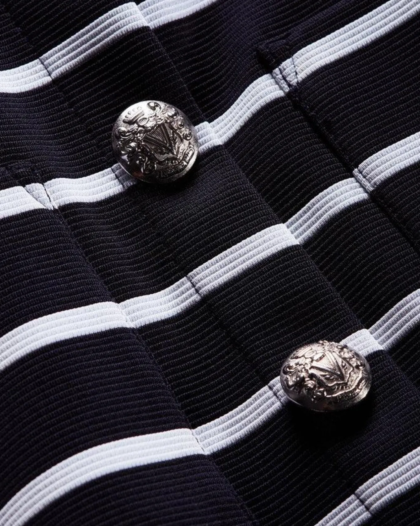 Veronica Beard relaxed fit nautical style striped knit jacket with crest buttons down front, round neck, front flap pockets andfaux chest flap pockets. Size S – Length 28.5″
