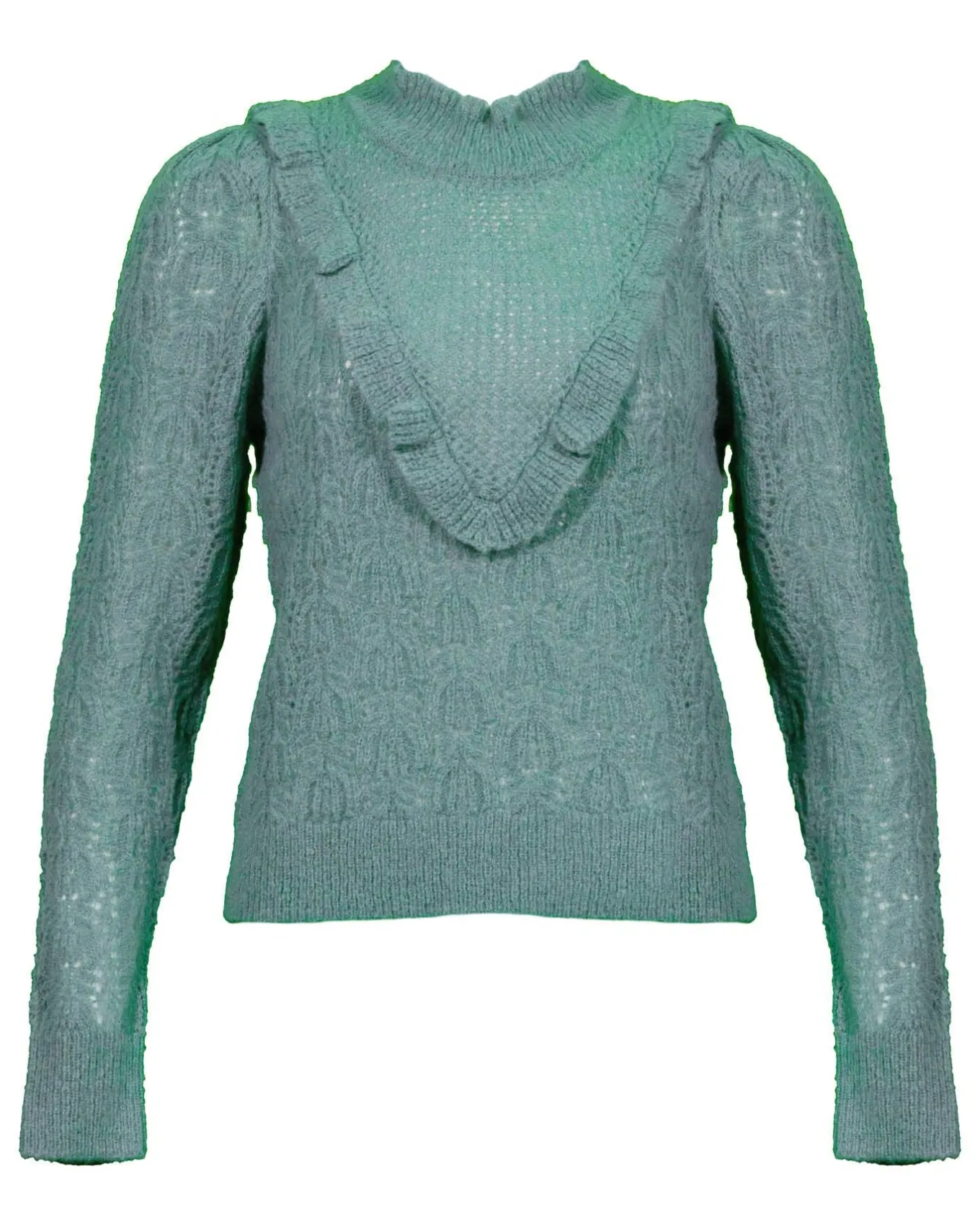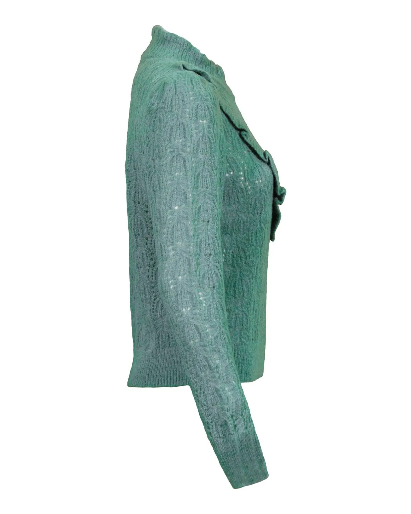 Alpaca blend mock neck pullover with feminine ruffled yoke detail and all over knit pattern, Size S: Sleeve Length 31.25″, Length 21.5″