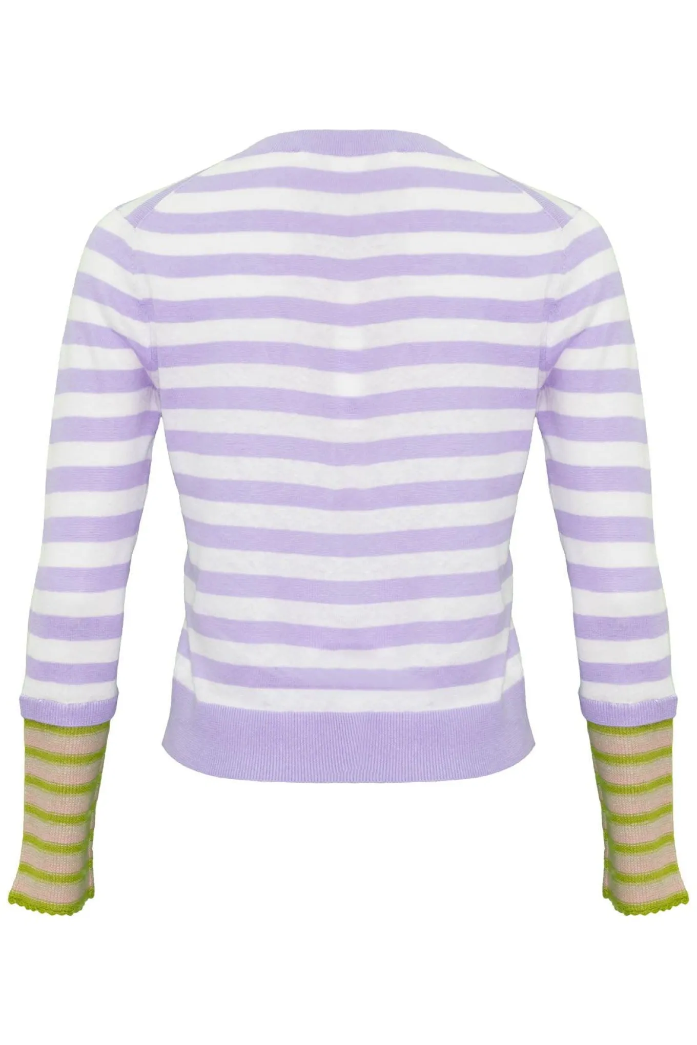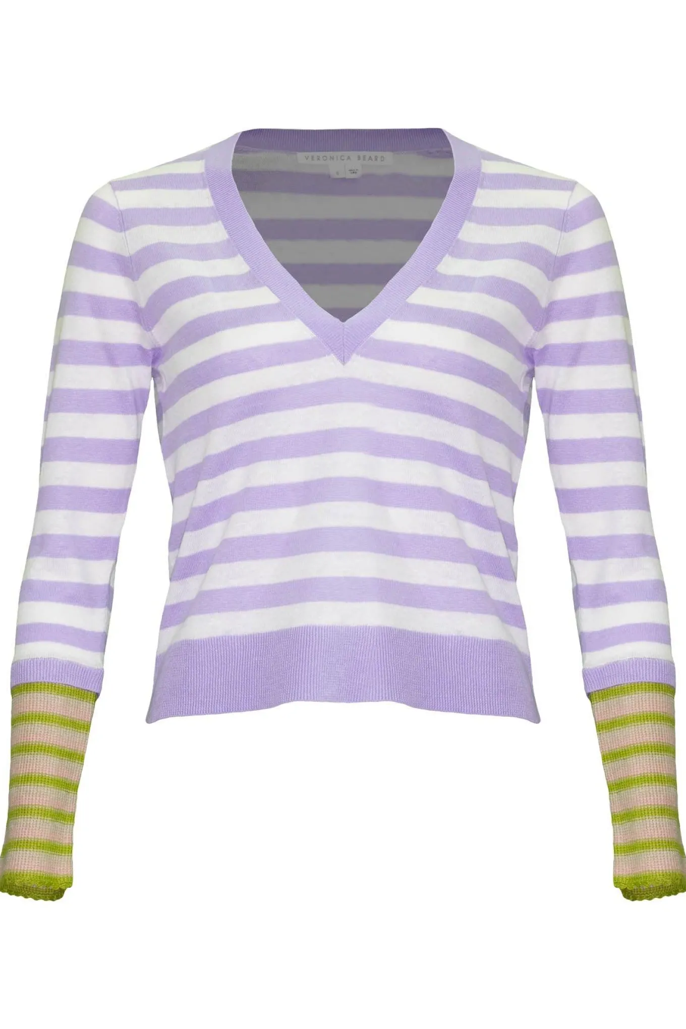 Long sleeve linen blend stripe pullover with v-neck and contrast stripes on sleeve cuffs