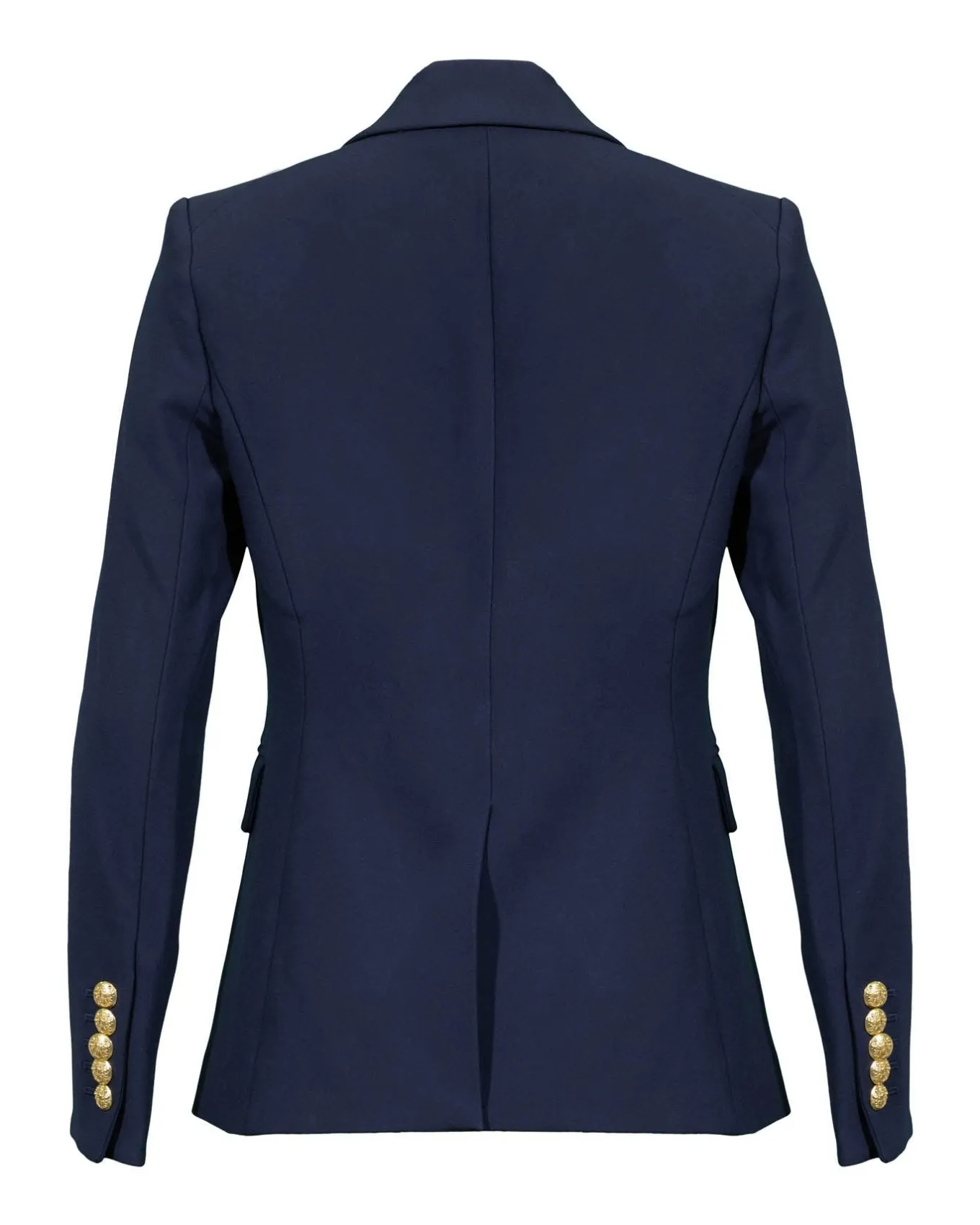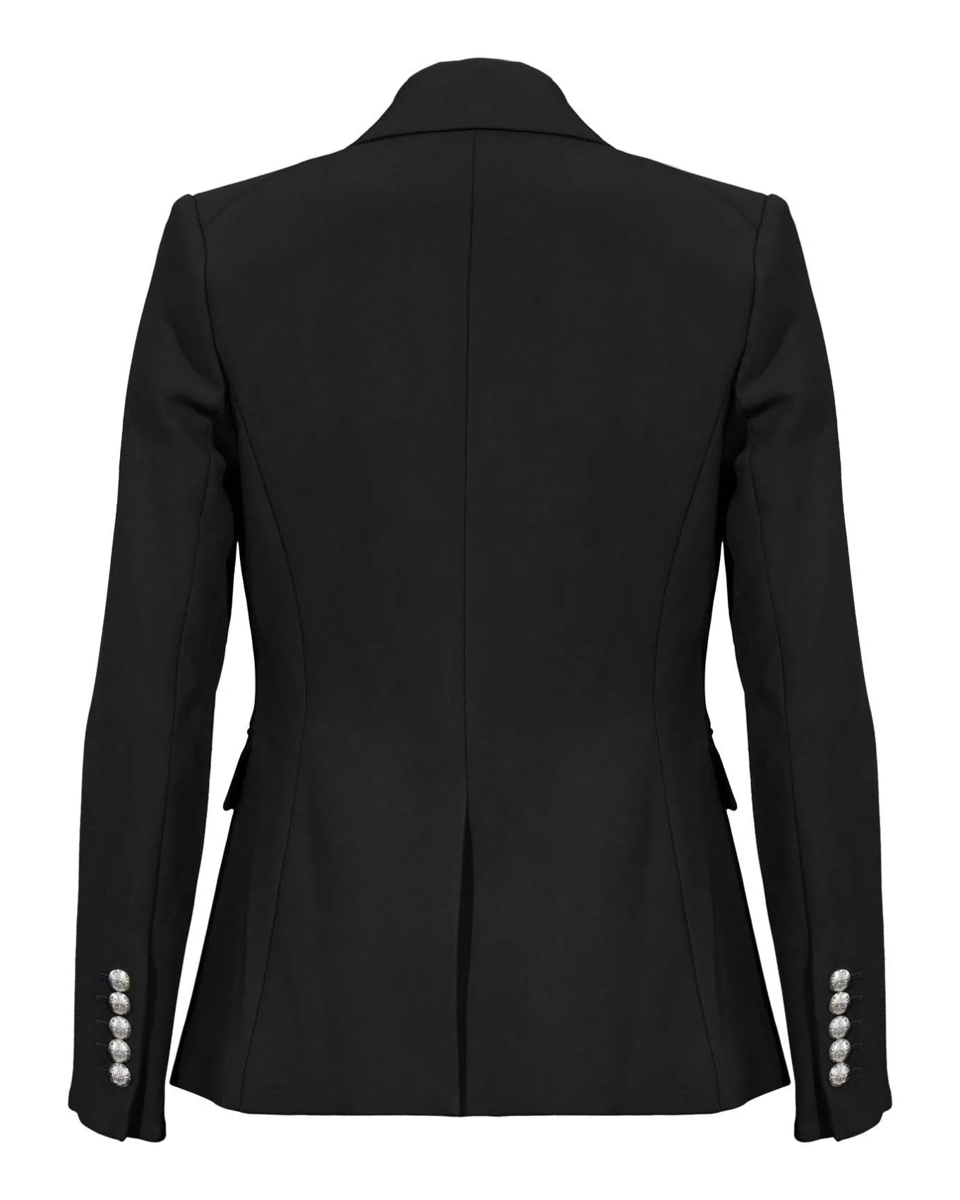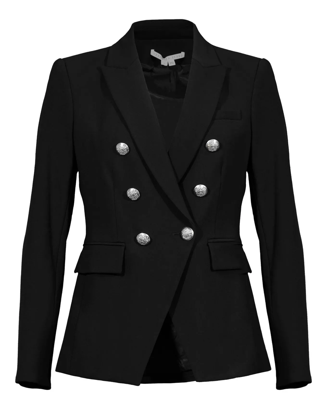 Slim fit slight stretch tailored dickey jacket features peak lapels, double breasted crest button closure, flap pockets, a welt chest pocket, shoulder pads, dickey compatible, Size 4: Length 26″, Sleeve length 32 3/4″