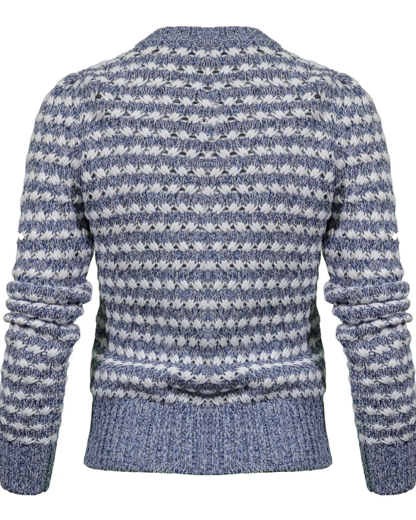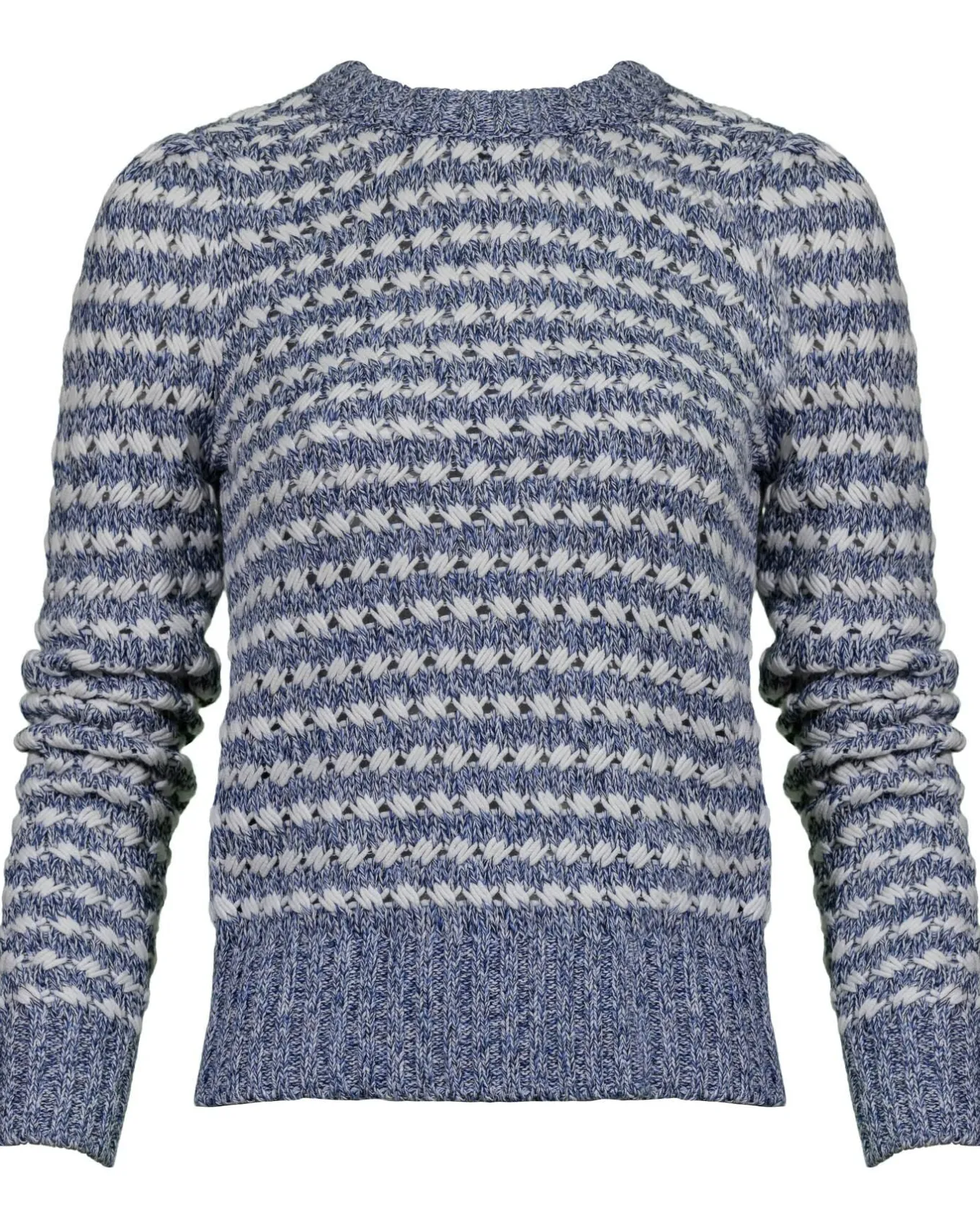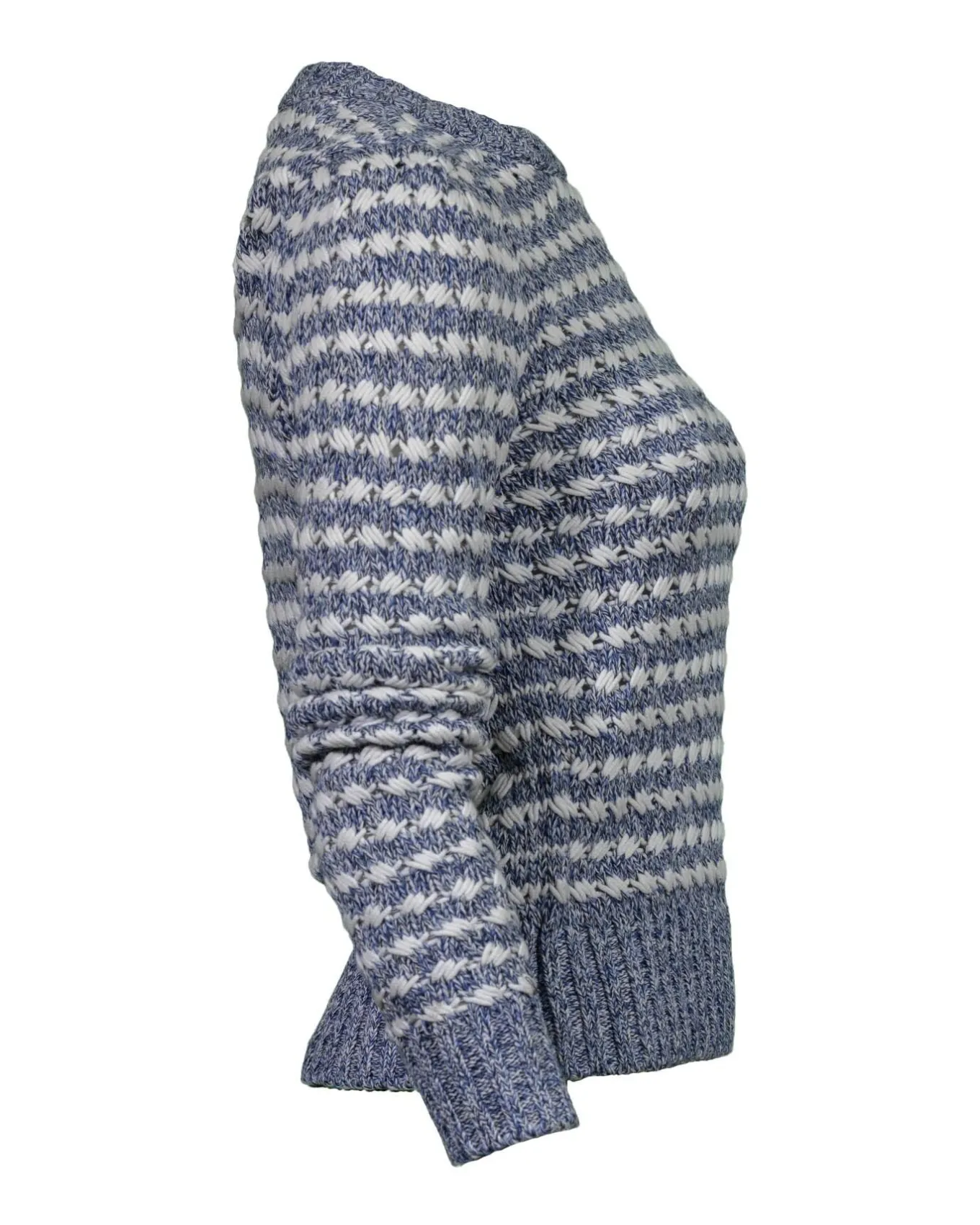 Relaxed fit plush cotton blend crew neck pullover in a blue white knit pattern with a bold wide ribbed trim at neck, cuffs and hem, Size S – 21″ Length