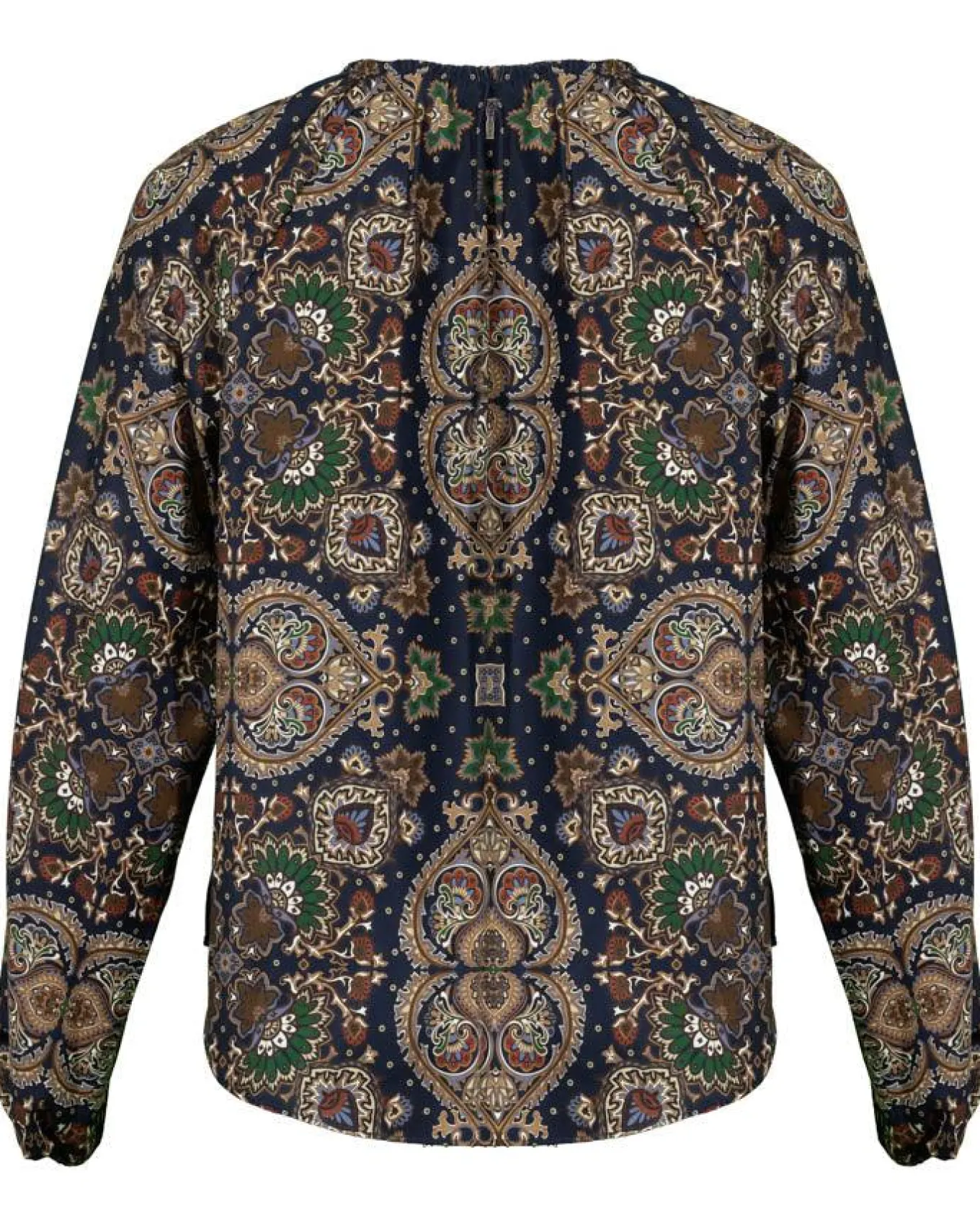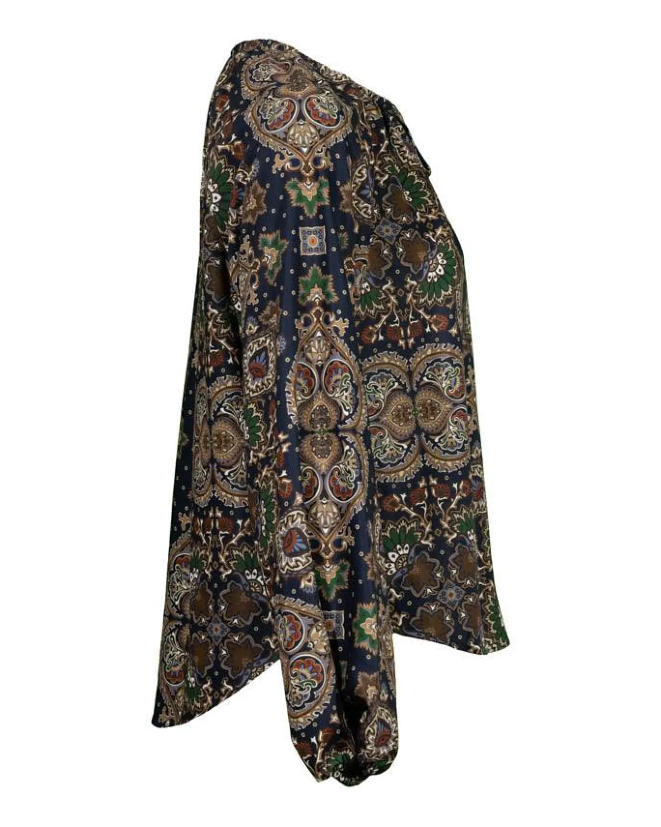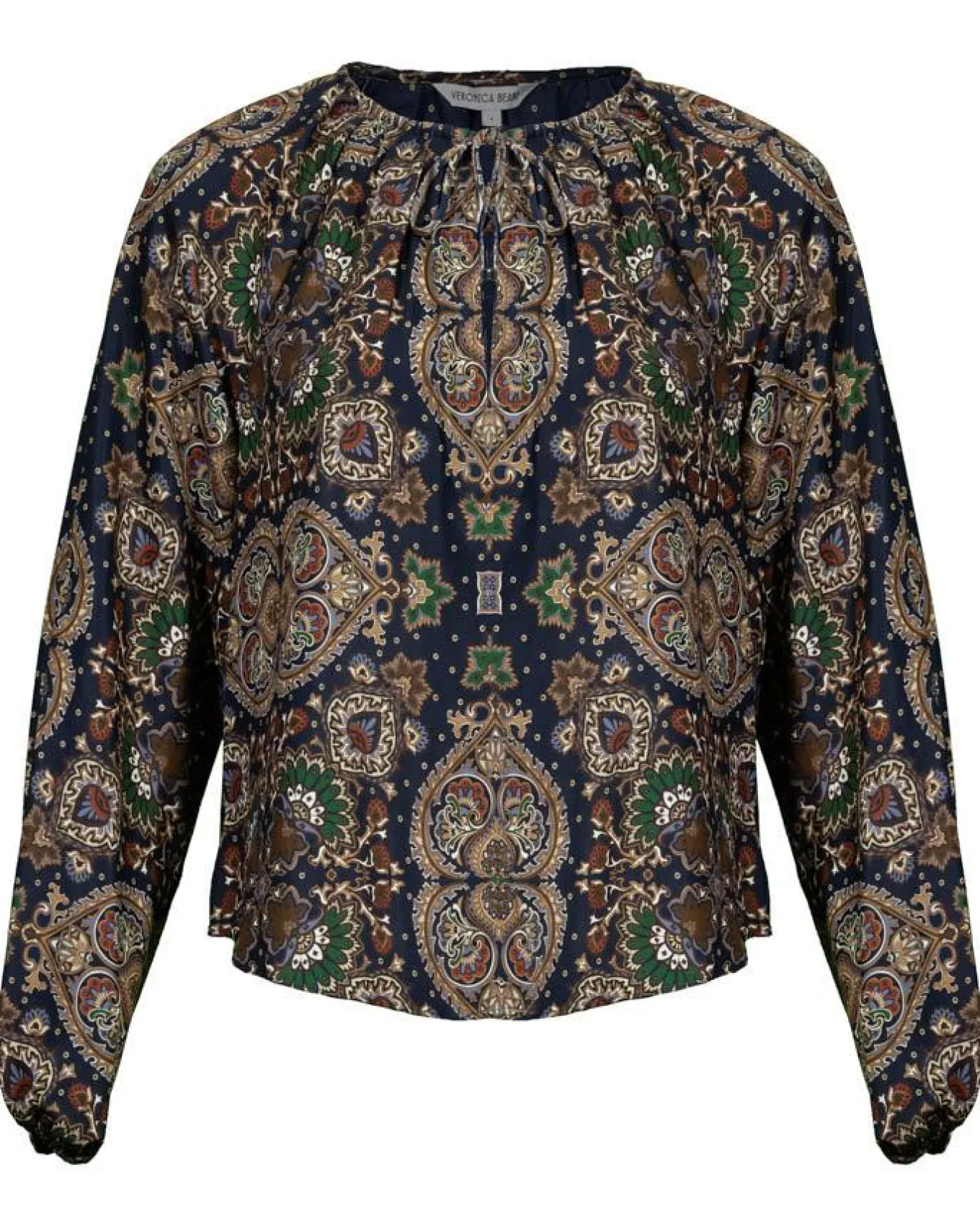 Veronica Beard print top features split neck with tie round neck, long sleeves with elastic cuffs and rounded hem slightly longer on back.