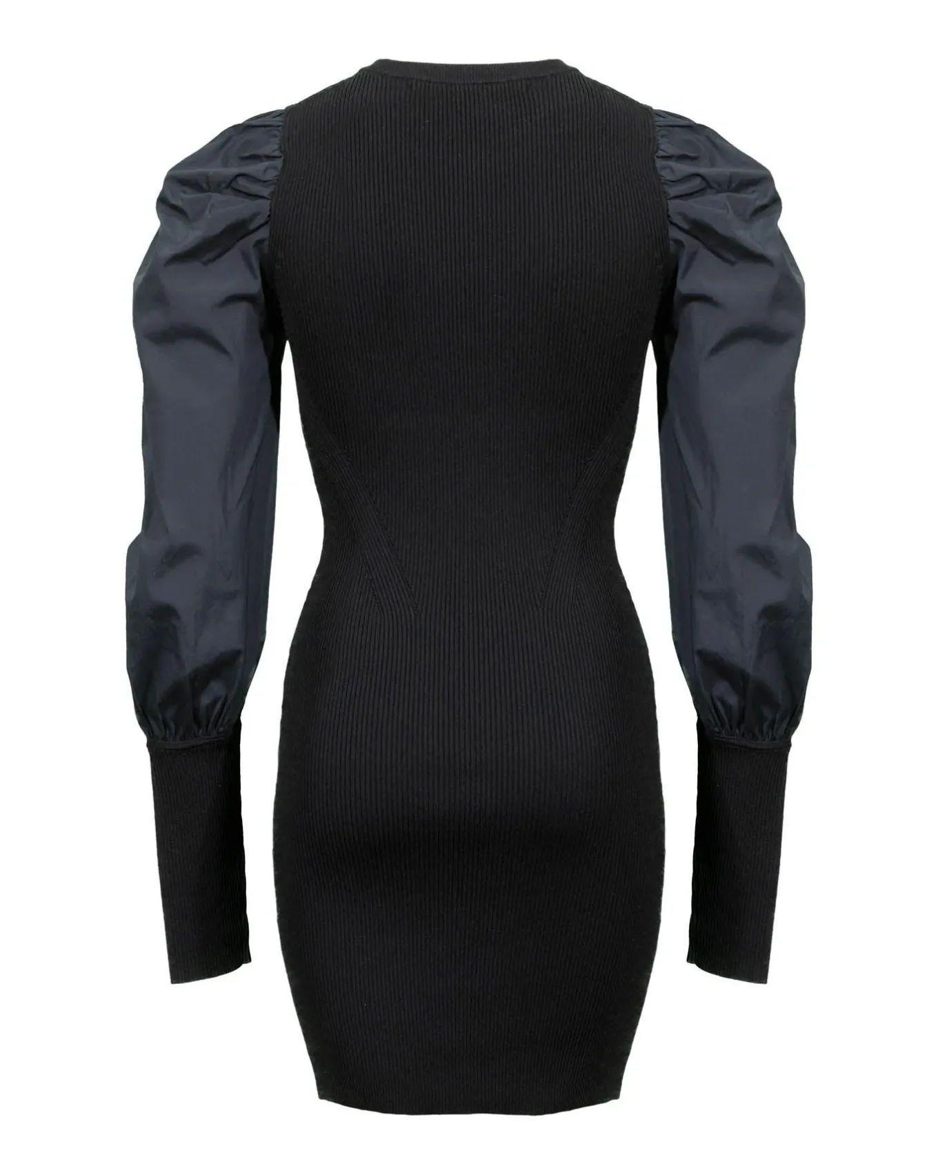 Fitted bodycon silhouette ribbed knit slip on mini dress with long puff sleeves that have an extra wide ribbed cuff, Approximate 63″ Length