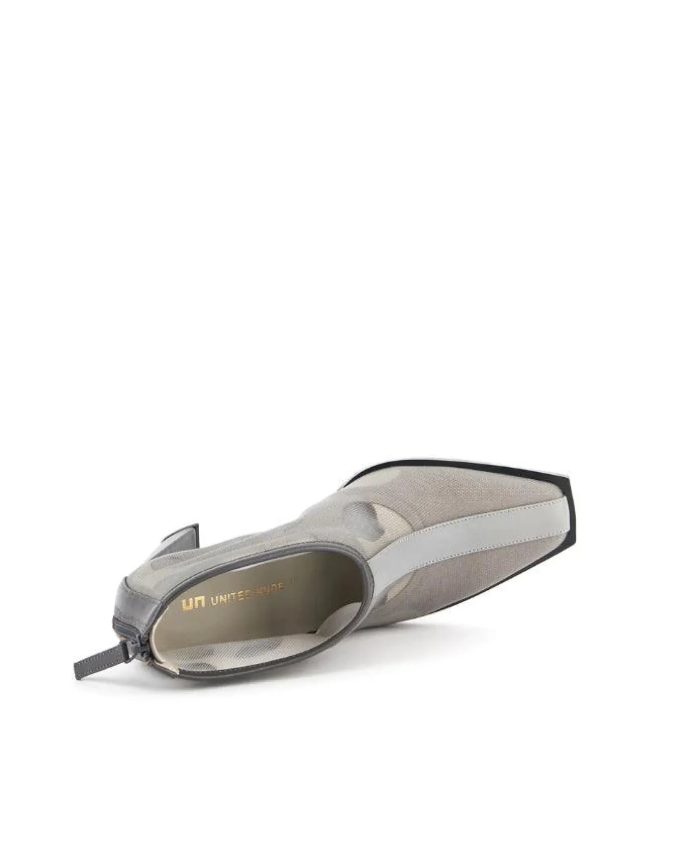 Stylish mesh bootie features a low topline, a mesh cut-out upper, leather trimmings, and United Nude’s signature flared Zink 3.54″ heel with pink detail, back heel zip, rubber outsole, standard fit