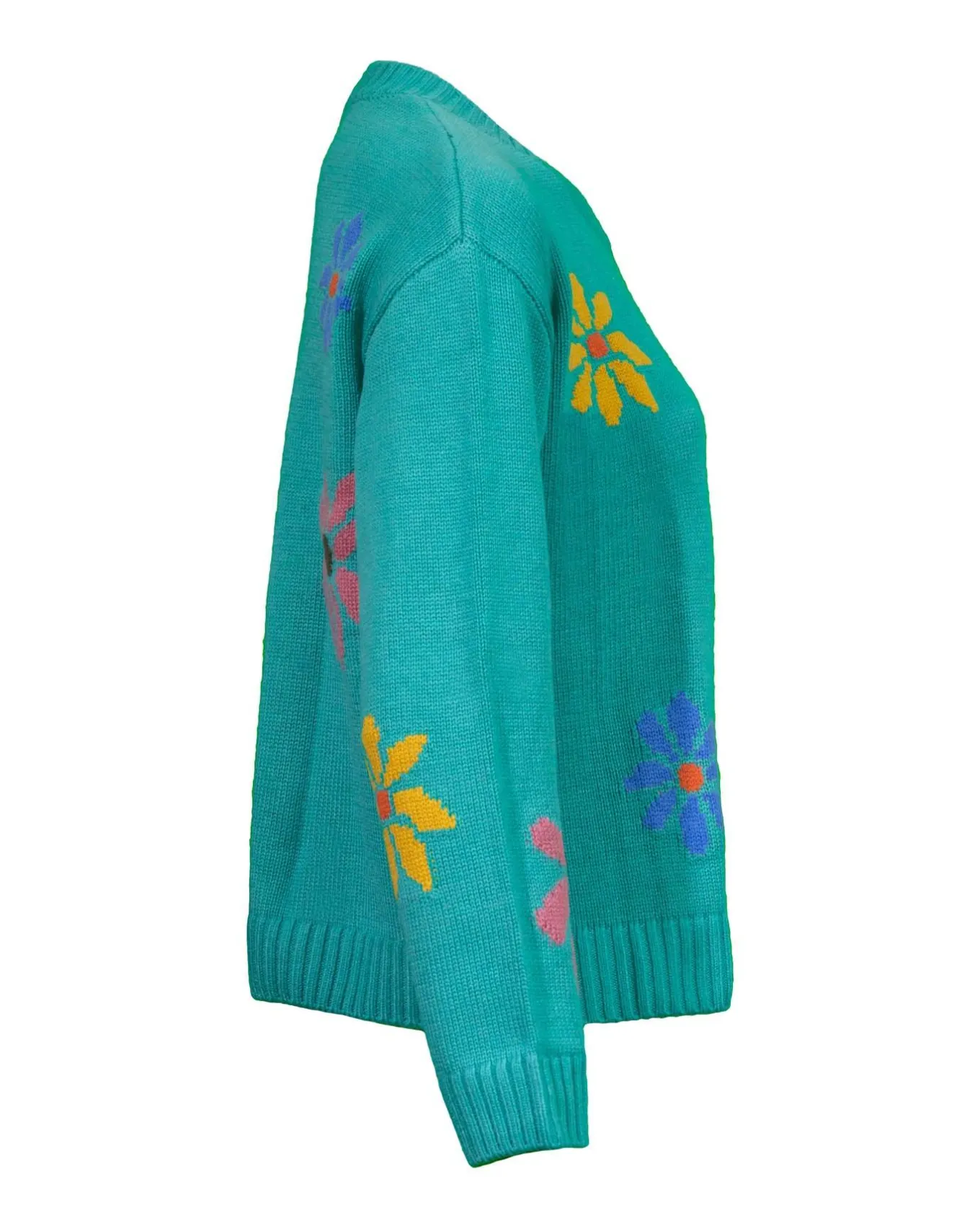 Relaxed fit super cozy cotton blend sweater in a unique floral print with crew neck, dropped shoulders and ribbed trim, Size S – Front Body Length: 21 3/4″